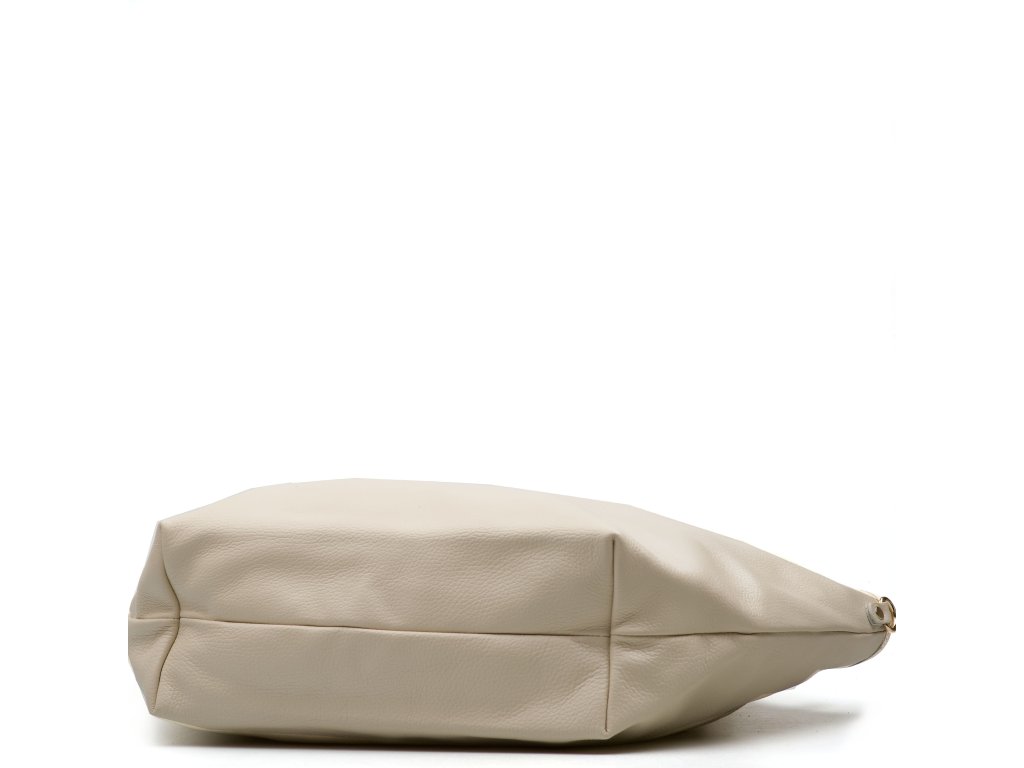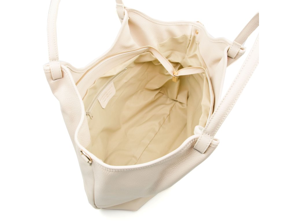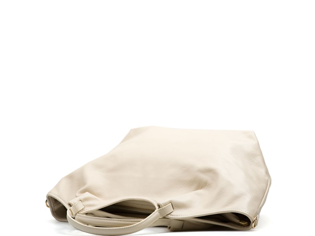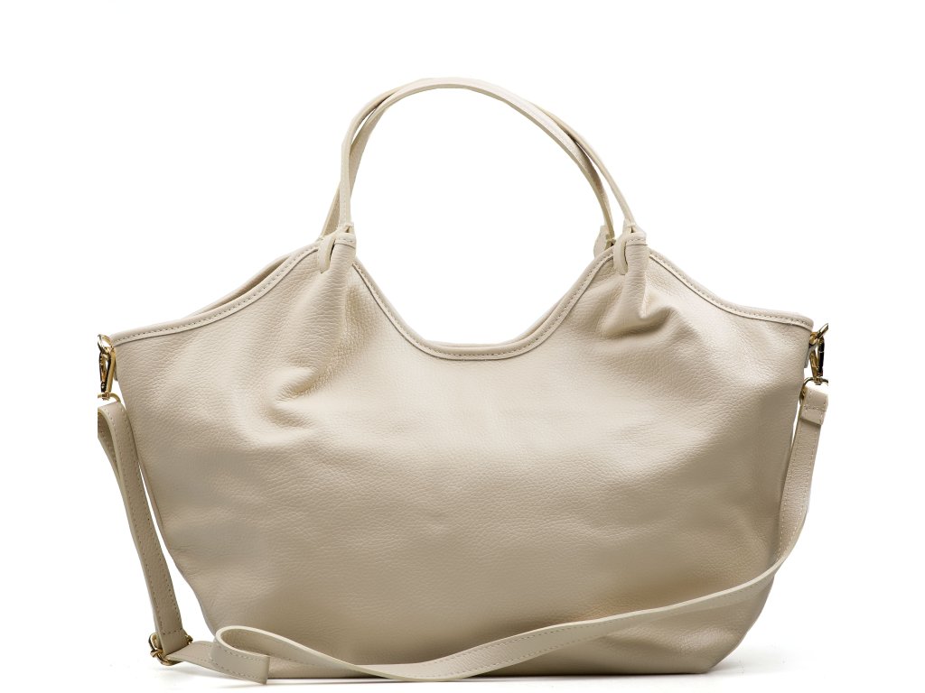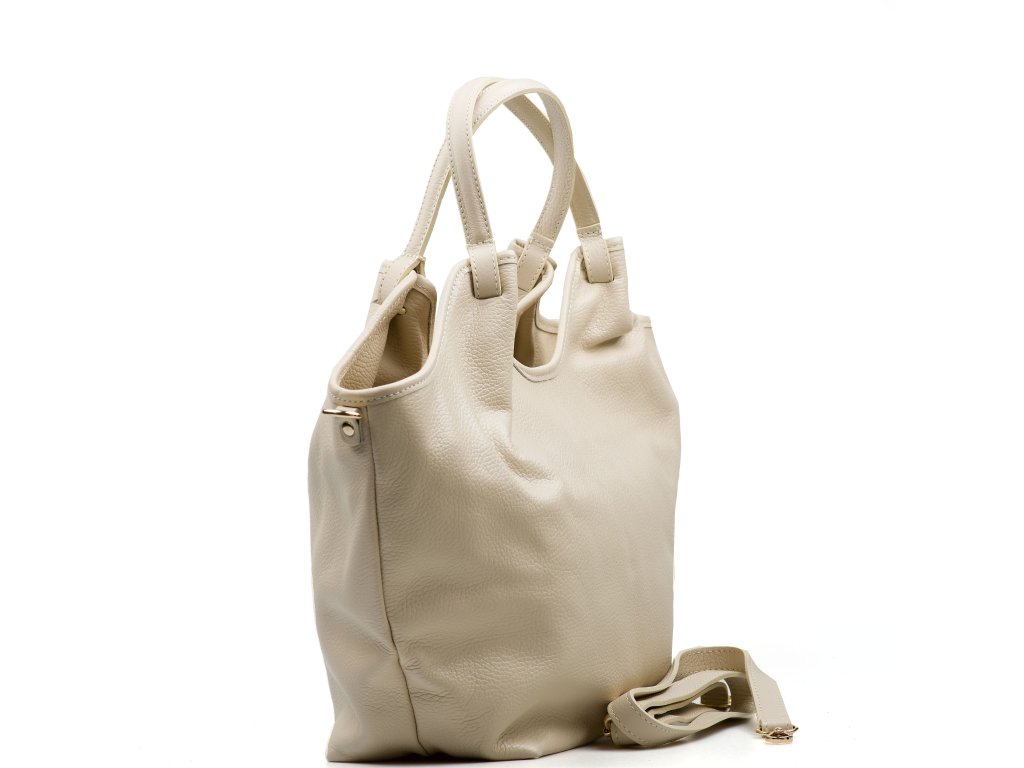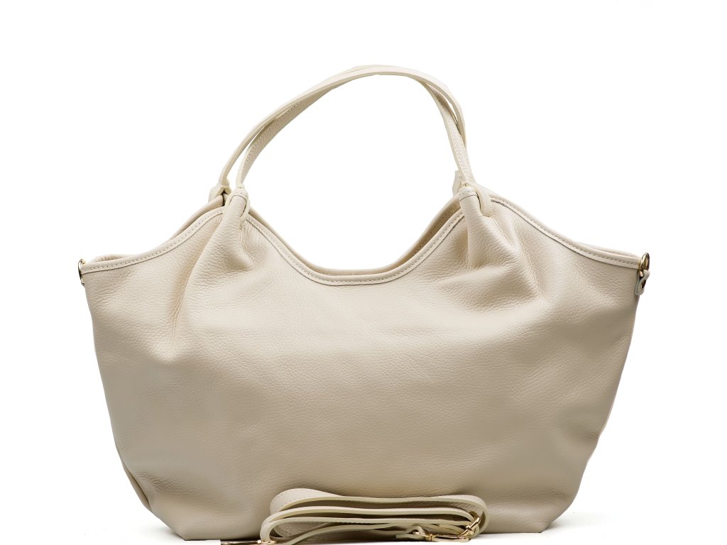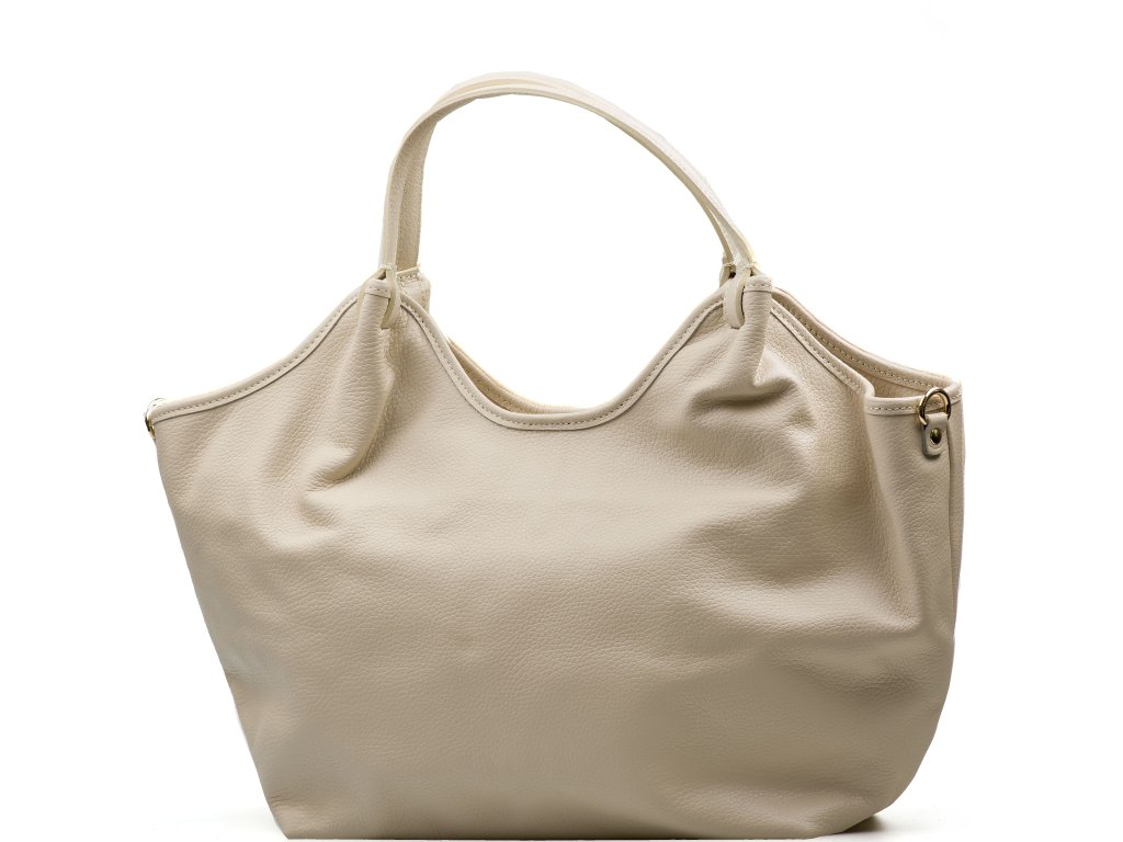 Kožená kabelka pro volný čas v béžové barvě. Kabelka má k dispozici dlouhý popruh pro nošení přes tělo. Interiér kabelky disponuje třemi úložnými kapsami, jež prostřední uzavíratelná zipem. Kabelka se uzavírá cvočkem.