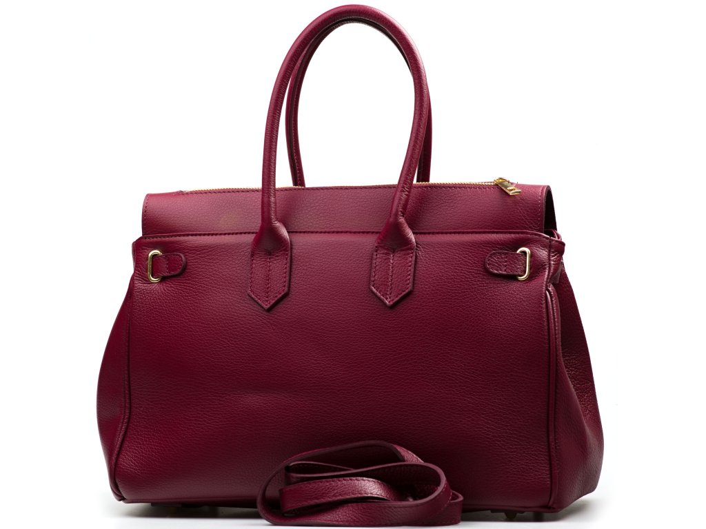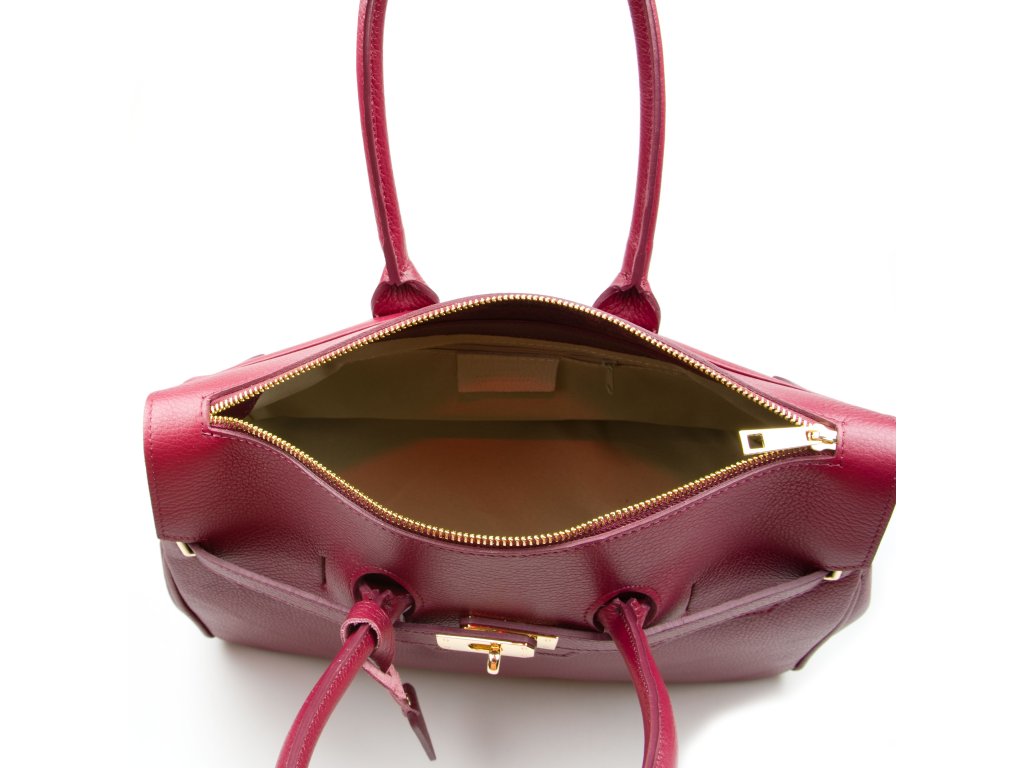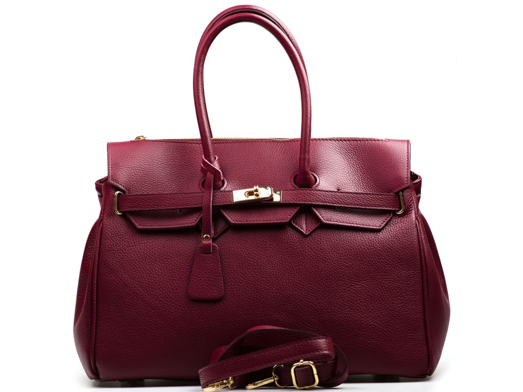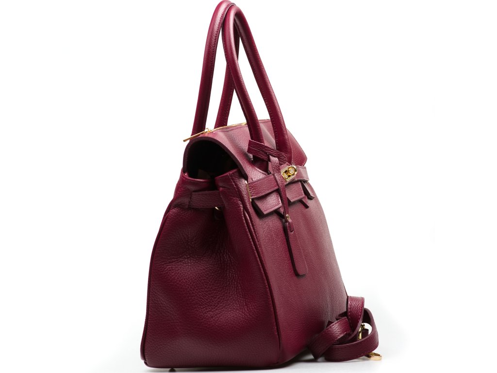 Kožená kabelka do ruky i přes rameno ve vínově červené barvě. Interiér kabelky disponuje jednou hlavní úložnou kapsou a jednou malou boční. Horní část kabelky zdobí kožený popruh se zlatými sponami. Kabelka se uzavírá pomocí zipu nebo klopy.