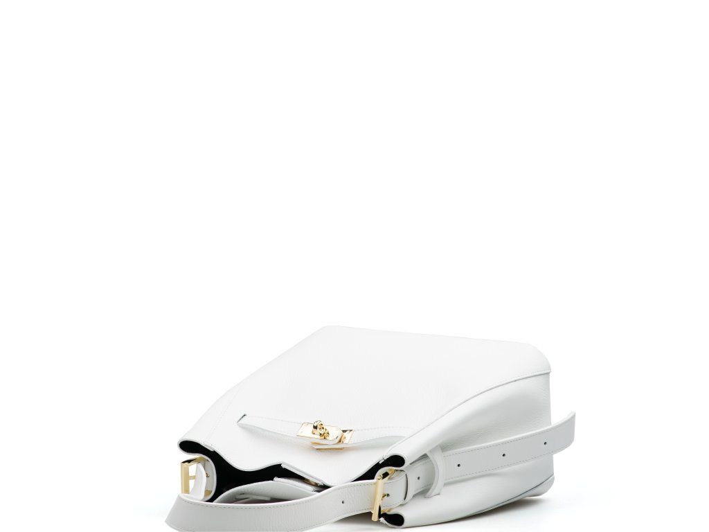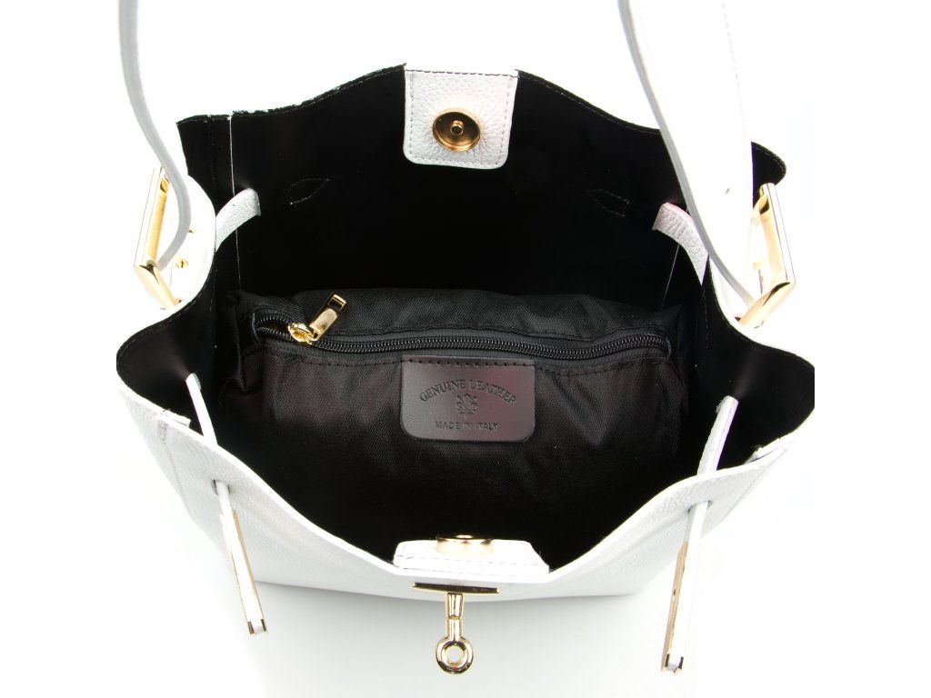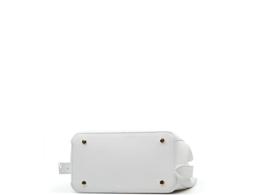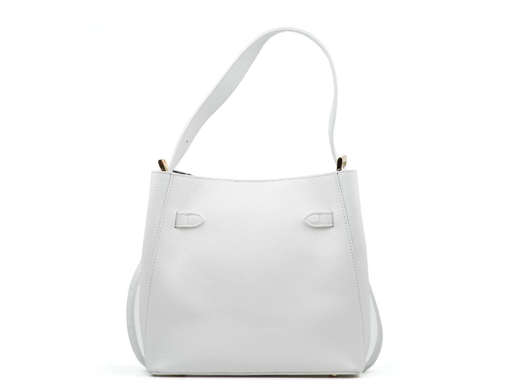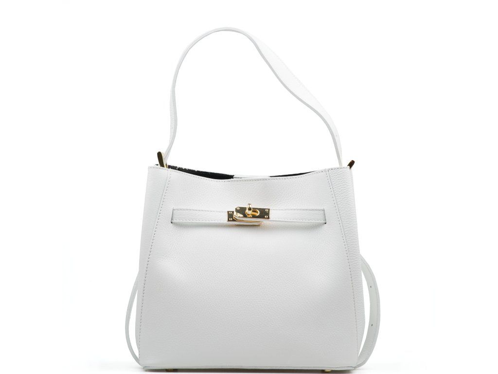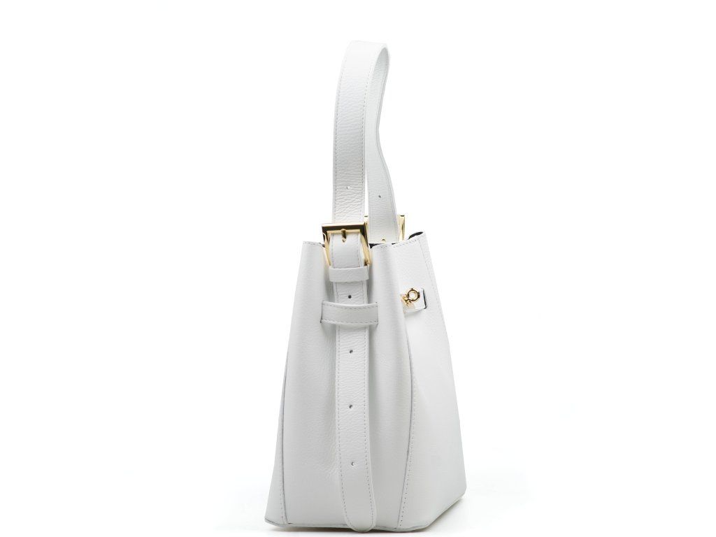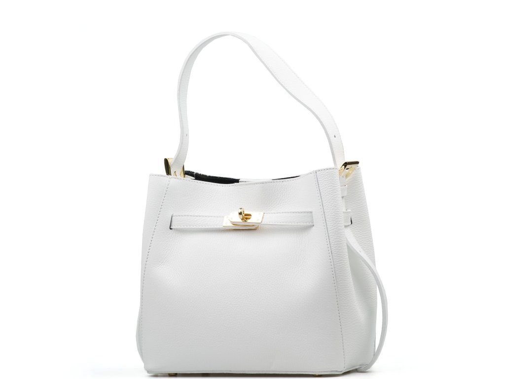 Dámská kožená minimalistická kabelka do ruky i přes rameno v bílé barvě. Kabelka ve tvaru pytlíku má nastavitelnou délku držadla. Vnitřní část kabelky je bez podšívky s malou kapsičkou na zip. Kabelku zdobí zlaté kování v přední části kabelky. Kabelka se zavírá cvočkem.