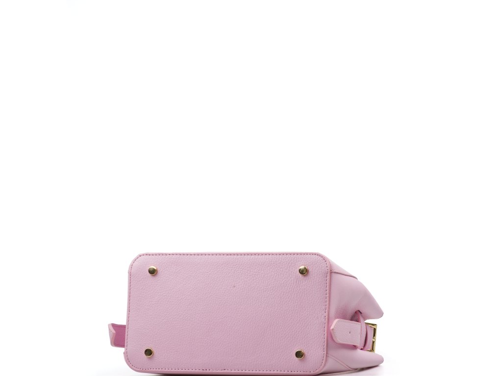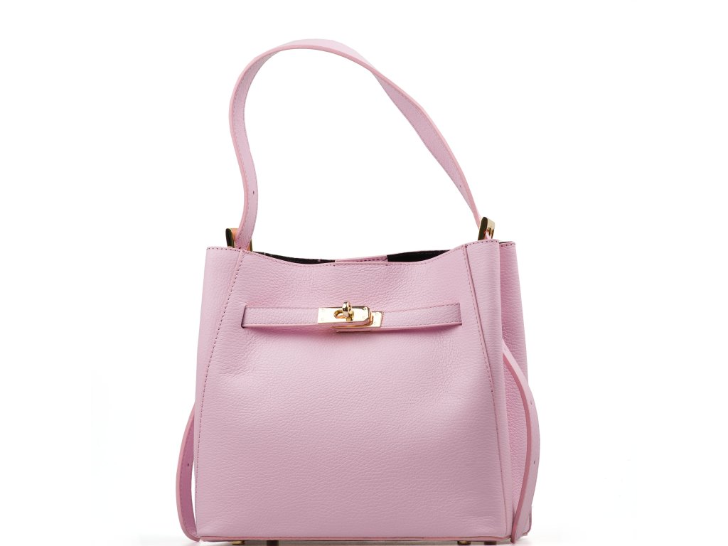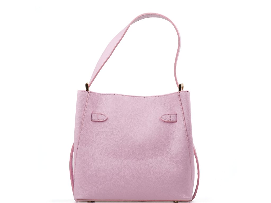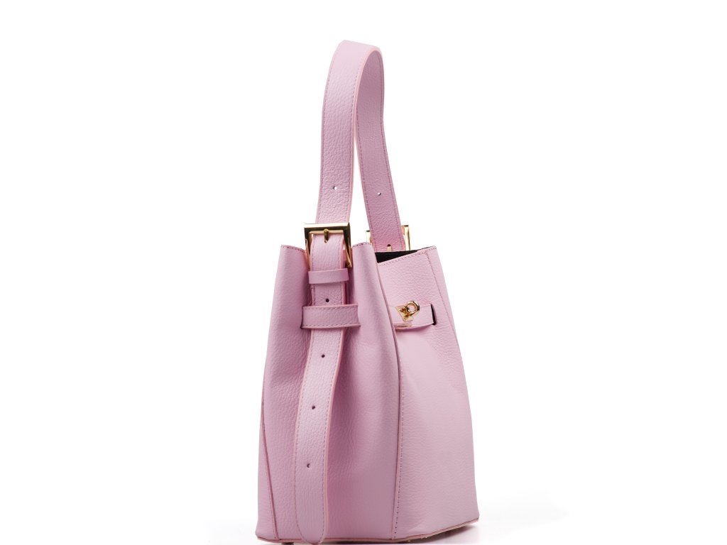 Dámská kožená minimalistická kabelka do ruky i přes rameno v růžové barvě. Kabelka ve tvaru pytlíku má nastavitelnou délku držadla. Vnitřní část kabelky je bez podšívky s malou kapsičkou na zip. Kabelku zdobí zlaté kování v přední části kabelky. Kabelka se zavírá cvočkem.