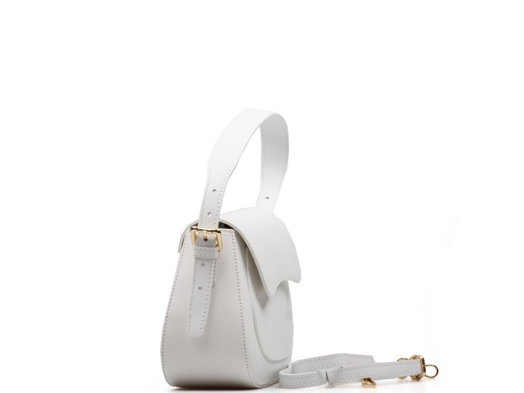 Elegantní kožená kabelka do ruky v bílé barvě. Kabelka je vyrobena z hladké kůže a má specifický tvar. Interiér kabelky disponuje jednou hlavní kapsou a jednou zadní malou. Kabelka je uzavírá zipem a ozdobnou klopou. Součástí kabelky je přídavný popruh s karabinami, pro použití kabelky jako crossbody.