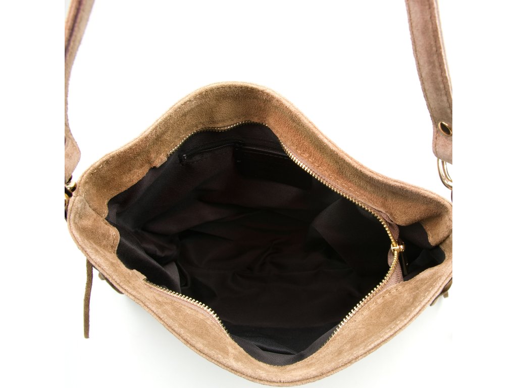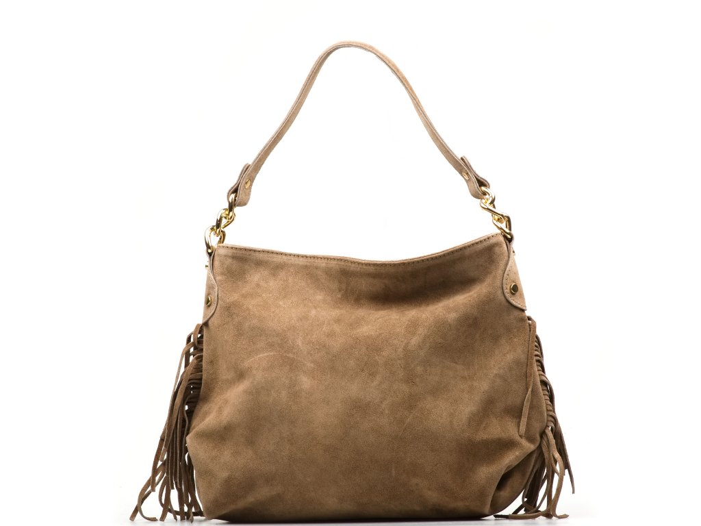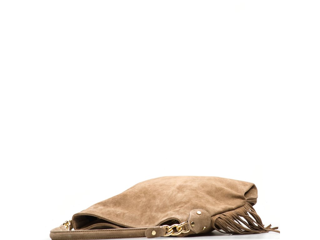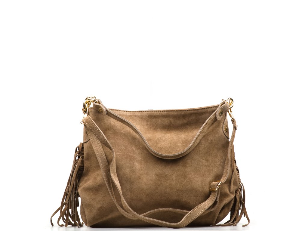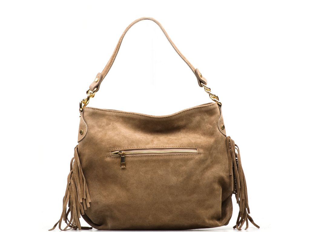Semišová kabelka přes rameno ve fango barvě je stylovým doplňkem, který spojuje originalitu a praktičnost. Má pevné ucho a posuvný přídavný popruh, díky čemuž ji lze pohodlně nosit v ruce, přes rameno nebo jako crossbody. Po bocích kabelku zdobí jemné třásně, které jí dodávají osobitý šmrnc. Na zadní straně se nachází praktická kapsa na zip, ideální pro drobnosti, které chcete mít po ruce. Interiér nabízí prostornou hlavní kapsu a menší přihrádky po stranách pro přehledné uspořádání věcí. Kabelka se uzavírá zipem a je perfektní volbou pro každodenní nošení i volný čas.