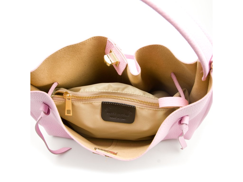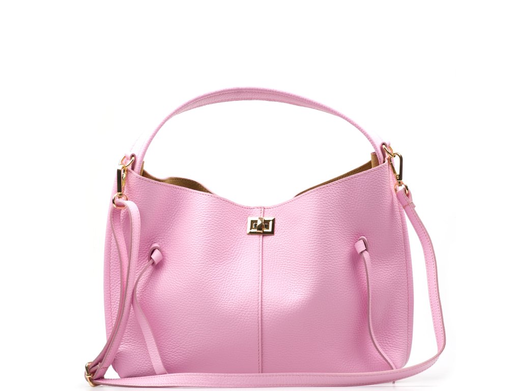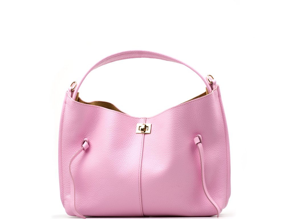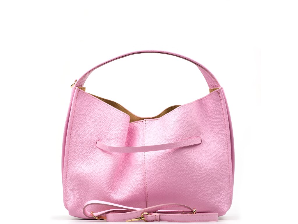 Minimalistická kožená kabelka v růžové barvě, kterou můžete nosit v ruce, přes rameno i jako crossbody díky přídavnému popruhu. Uvnitř najdete jednu velkou úložnou kapsu a další volnou kapsu na drobnosti, které chcete mít hned po ruce. Kabelka se uzavírá zlatým kováním, které jí dodává jemný, sofistikovaný šmrnc. Přední stranu zdobí kožený pásek, který podtrhuje čistý, minimalistický design.