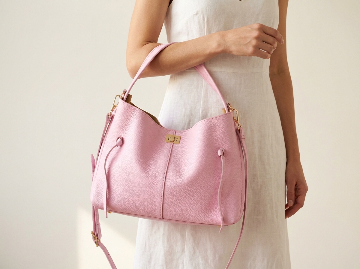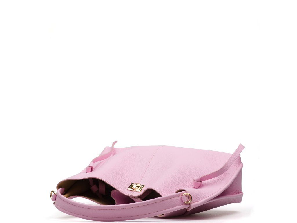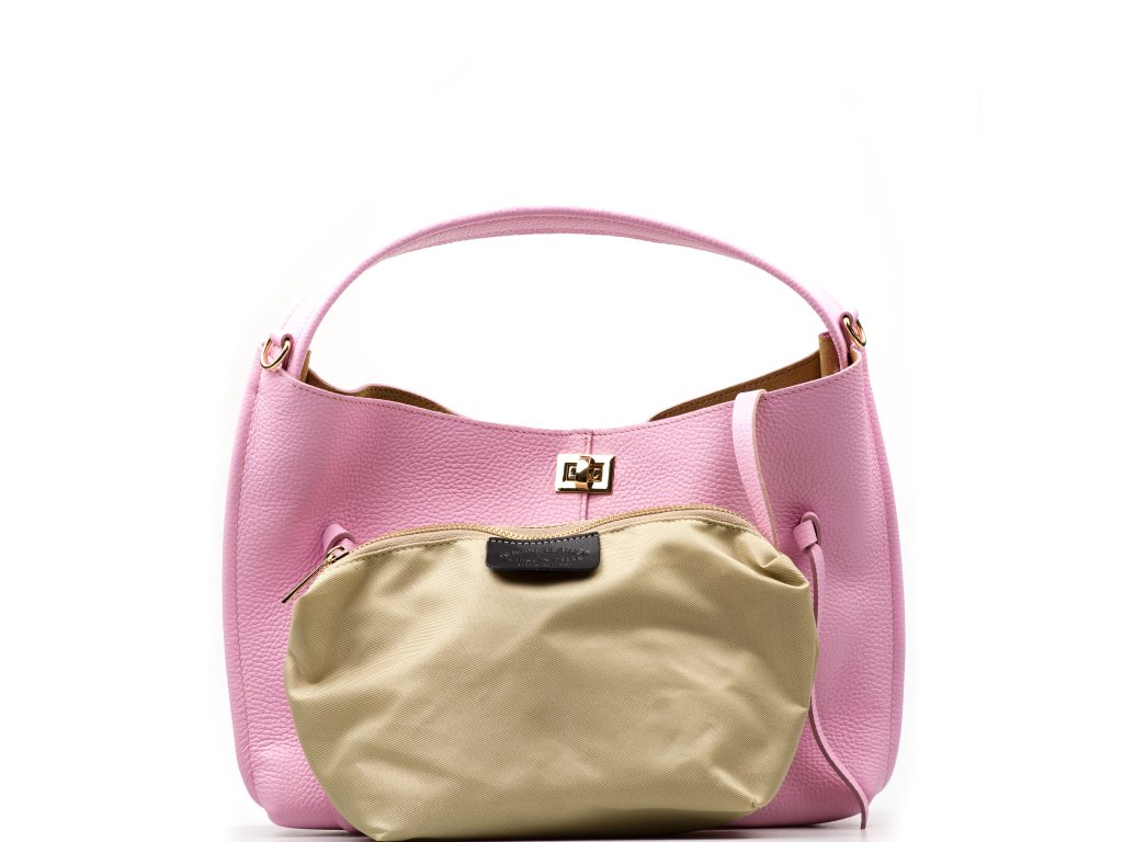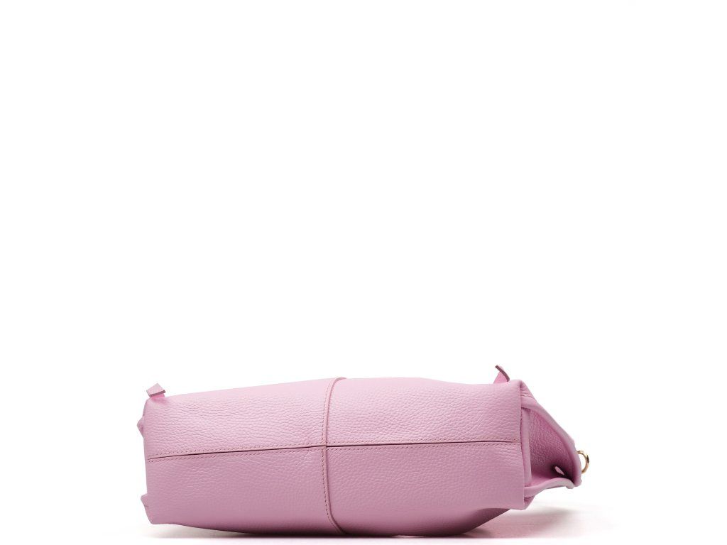 Minimalistická kožená kabelka v růžové barvě, kterou můžete nosit v ruce, přes rameno i jako crossbody díky přídavnému popruhu. Uvnitř najdete jednu velkou úložnou kapsu a další volnou kapsu na drobnosti, které chcete mít hned po ruce. Kabelka se uzavírá zlatým kováním, které jí dodává jemný, sofistikovaný šmrnc. Přední stranu zdobí kožený pásek, který podtrhuje čistý, minimalistický design.