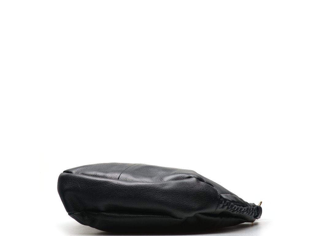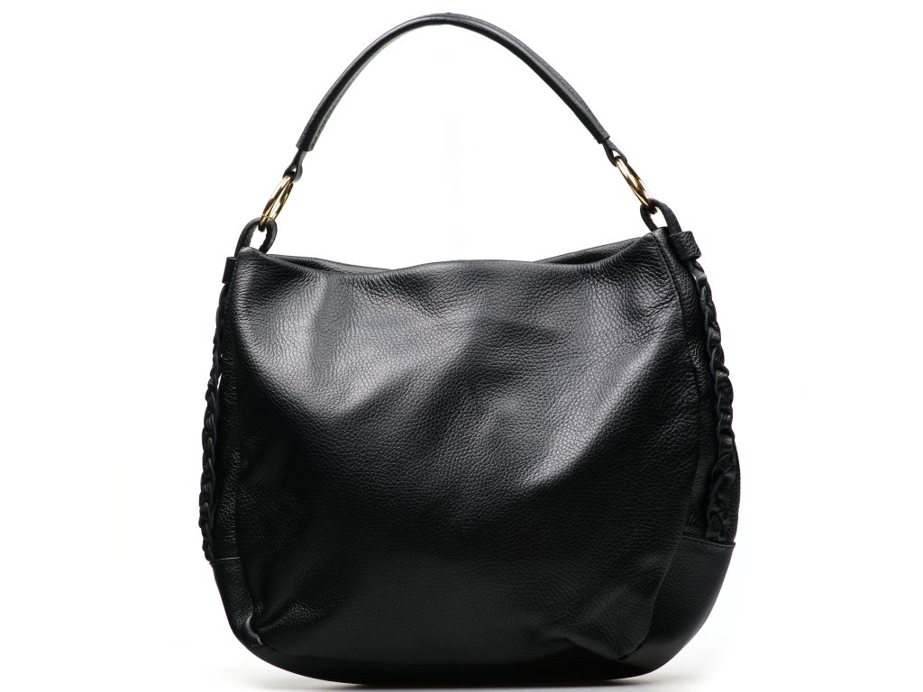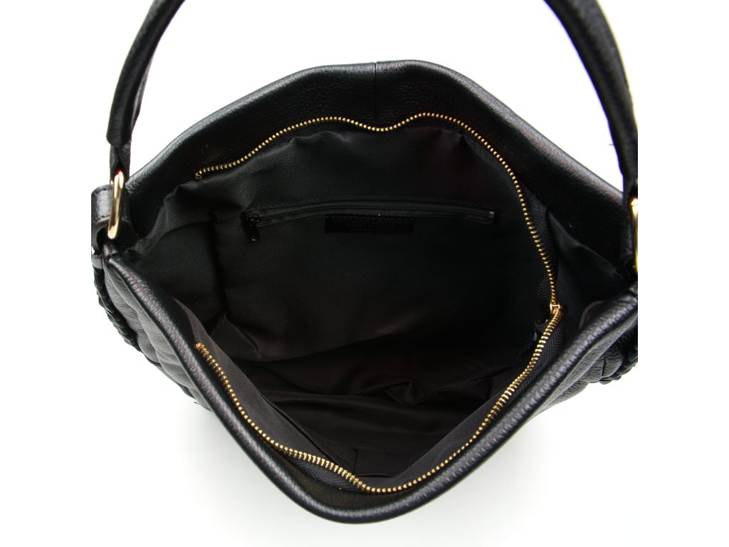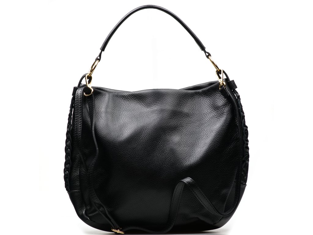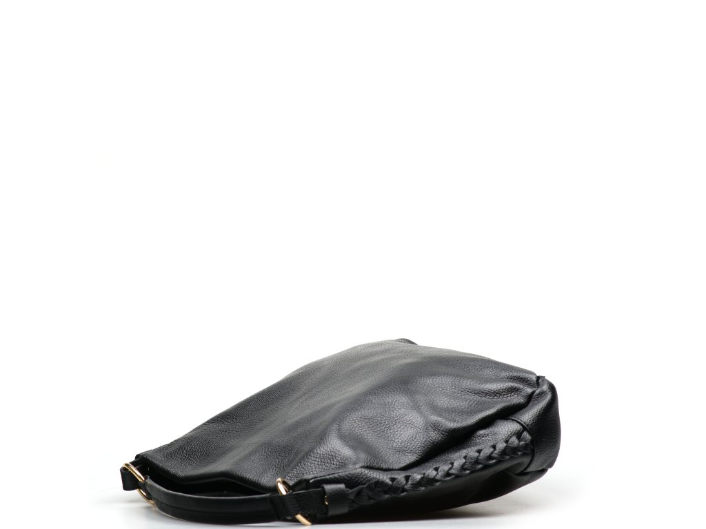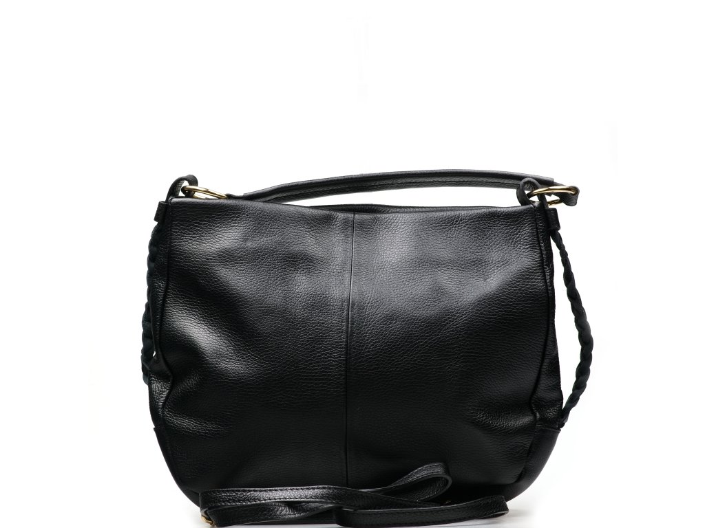 Kožená kabelka pro volný čas v černé barvě. Součástí kabelky je přídavný popruh s karabinami. Interiér kabelky disponuje jednou hlavní kapsou a třemi menšími po vnějších stranách. Kabelka je po bocích zdobena koženými copánky. Kabelka se uzavírá zipem.