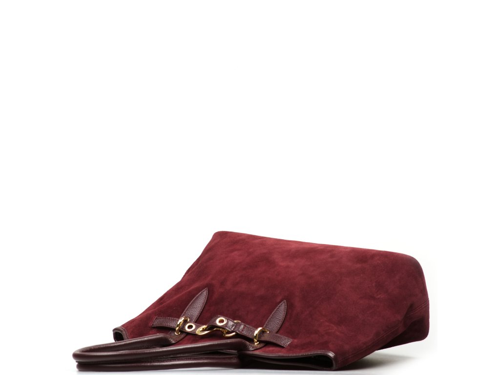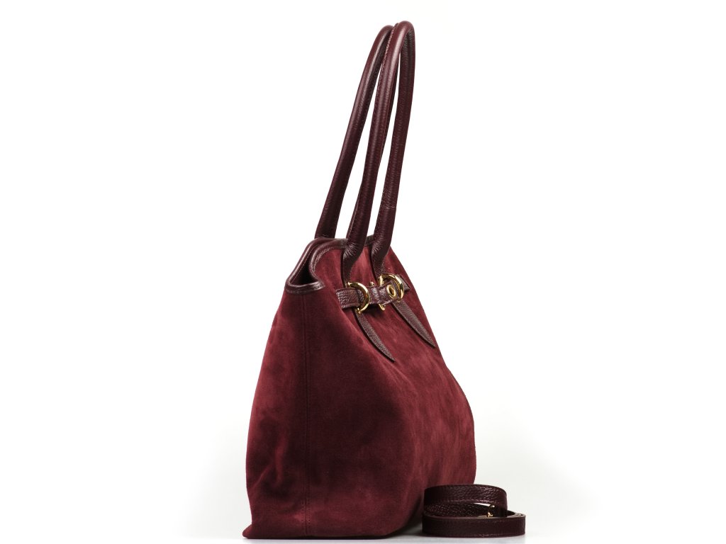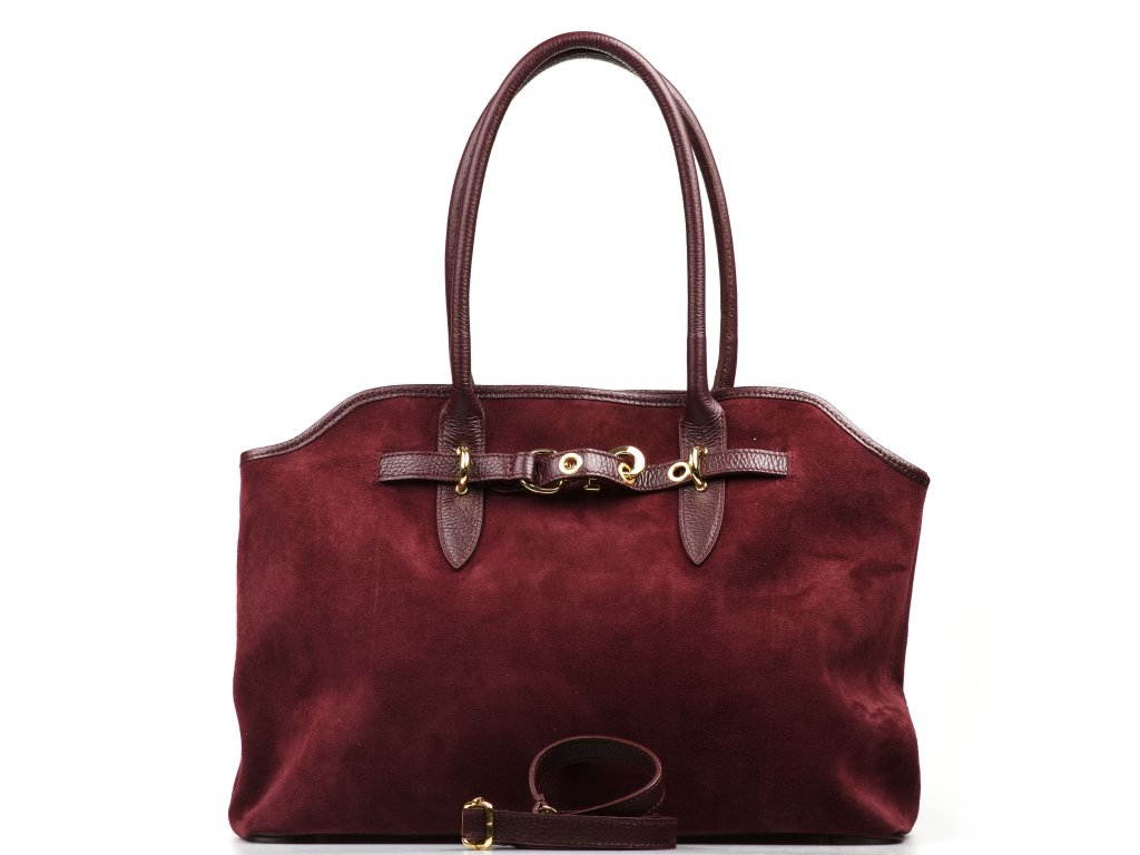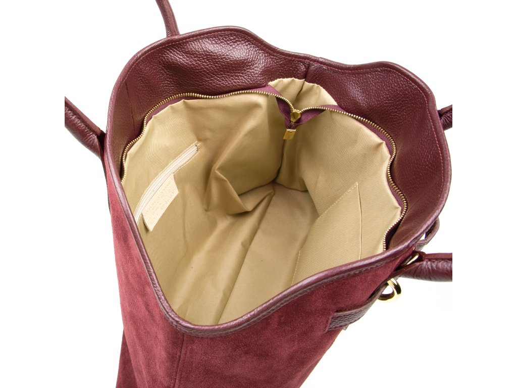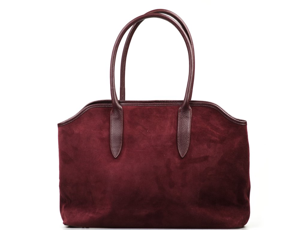 Elegantní semišová kožená kabelka v bordó barvě je ztělesněním nadčasového stylu a sofistikovanosti. Její matný semišový povrch doplňuje jemné kožené zdobení a zlaté kování, které podtrhuje její luxusní vzhled. Kabelku lze nosit v ruce nebo přes rameno. Interiér nabízí jednu prostornou hlavní kapsu a malé kapsy po bocích pro lepší uspořádání věcí. Uzavírá se zipem.
