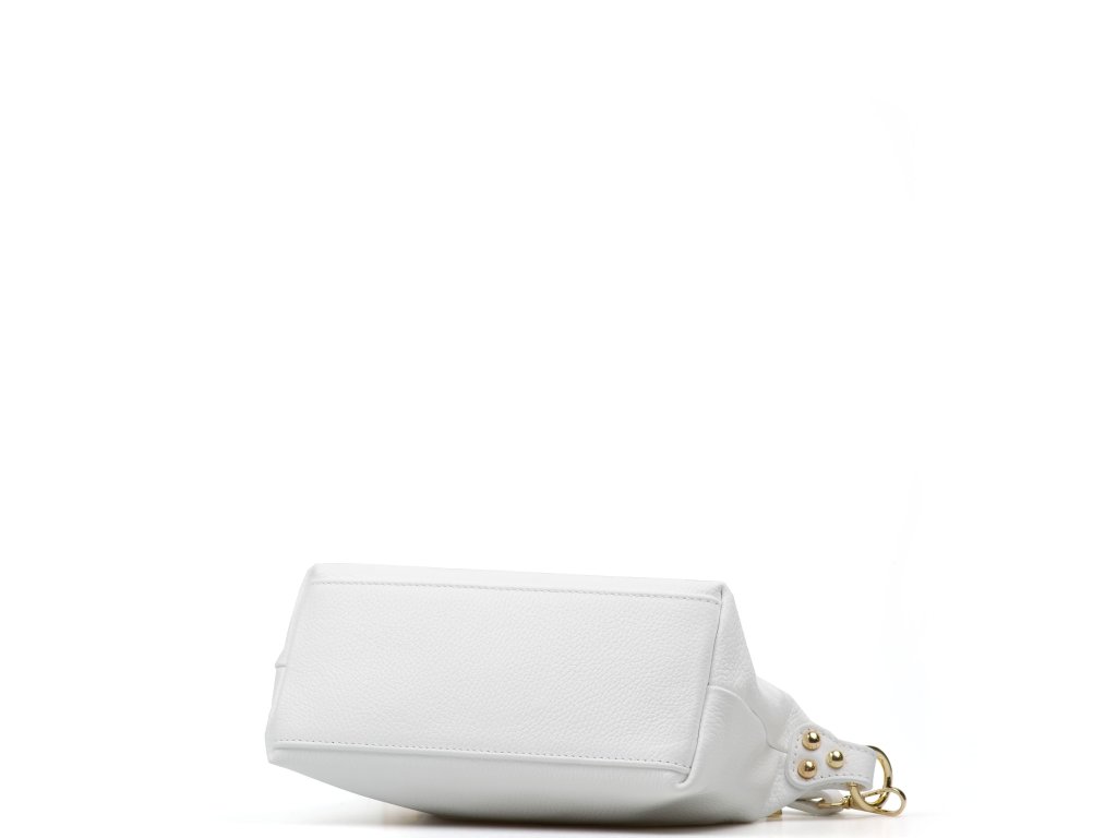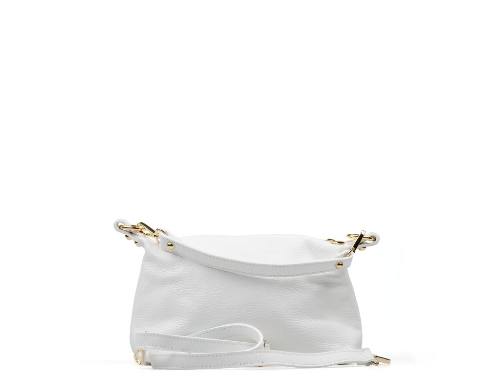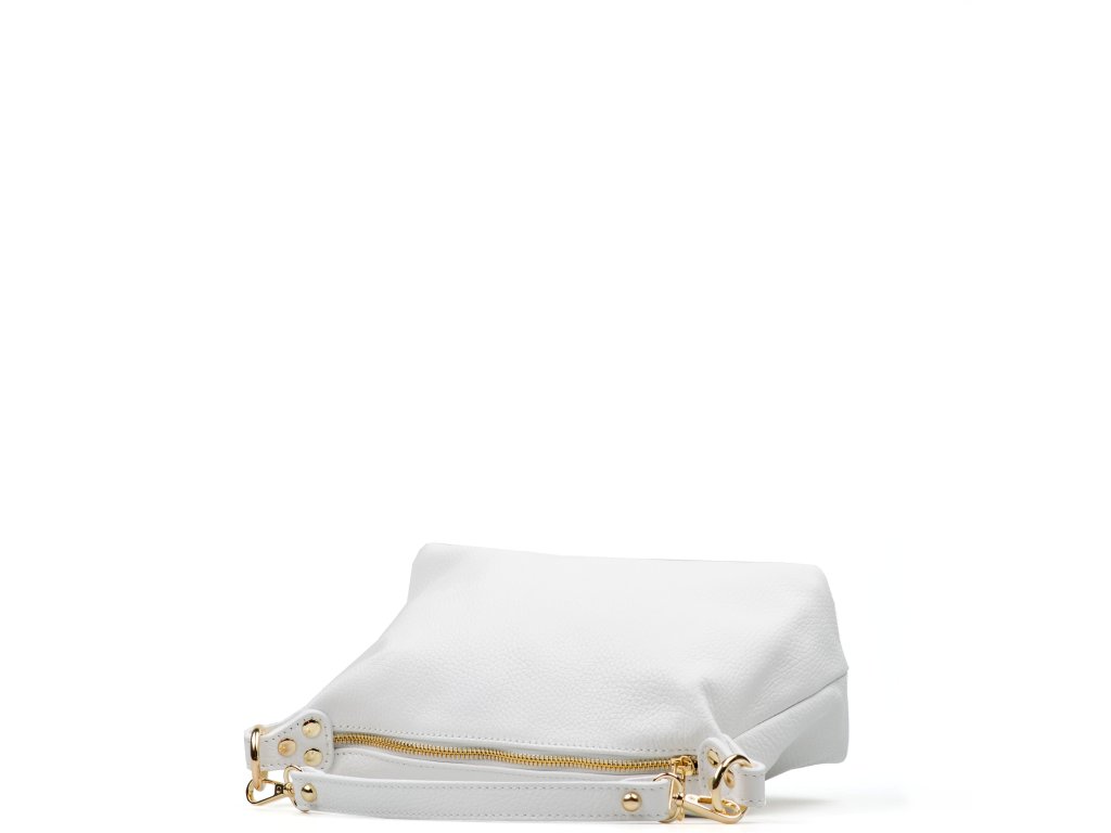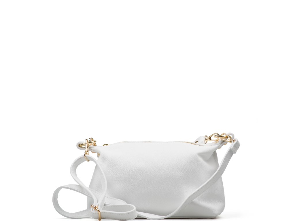 Elegantní bílá kožená kabelka, která se snadno sladí s každým outfitem. Uvnitř najdete jednu hlavní přihrádku a menší boční kapsu na zip – ideální na klíče, telefon nebo drobnosti, které chcete mít hned po ruce. Kabelka se zapíná na zip, takže vaše věci budou bezpečně uložené. Součástí jsou dva přídavné popruhy: kratší pro nošení v ruce nebo přes rameno a druhý, nastavitelný, pro pohodlné nošení přes tělo.