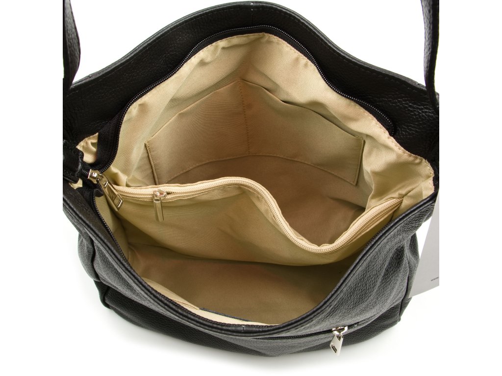 Dámská kožená kabelka pro volný čas, do ruky i přes rameno v černé barvě. Ozdobou jsou zipy na přední straně kabelky a přezky na držadle. Součástí je přídavný popruh s karabinami, kabelka skvěle vypadá i jako crossbody. Vnitřní část je vybavená třemi úložnými kapsami, uprostřed na zip.