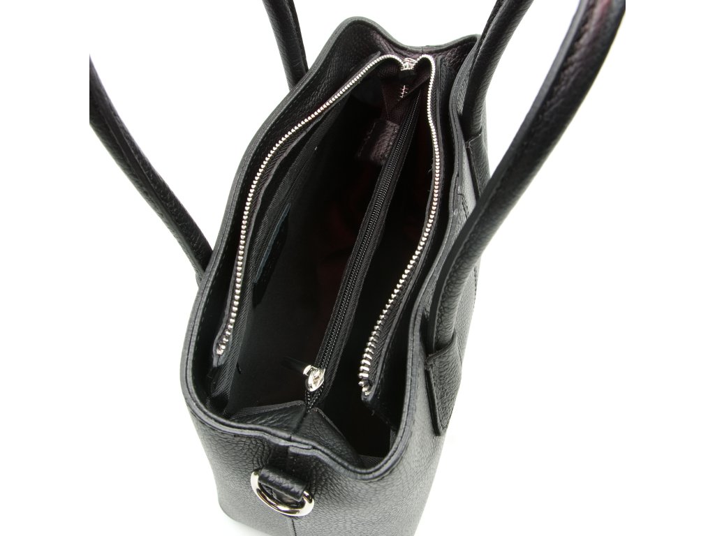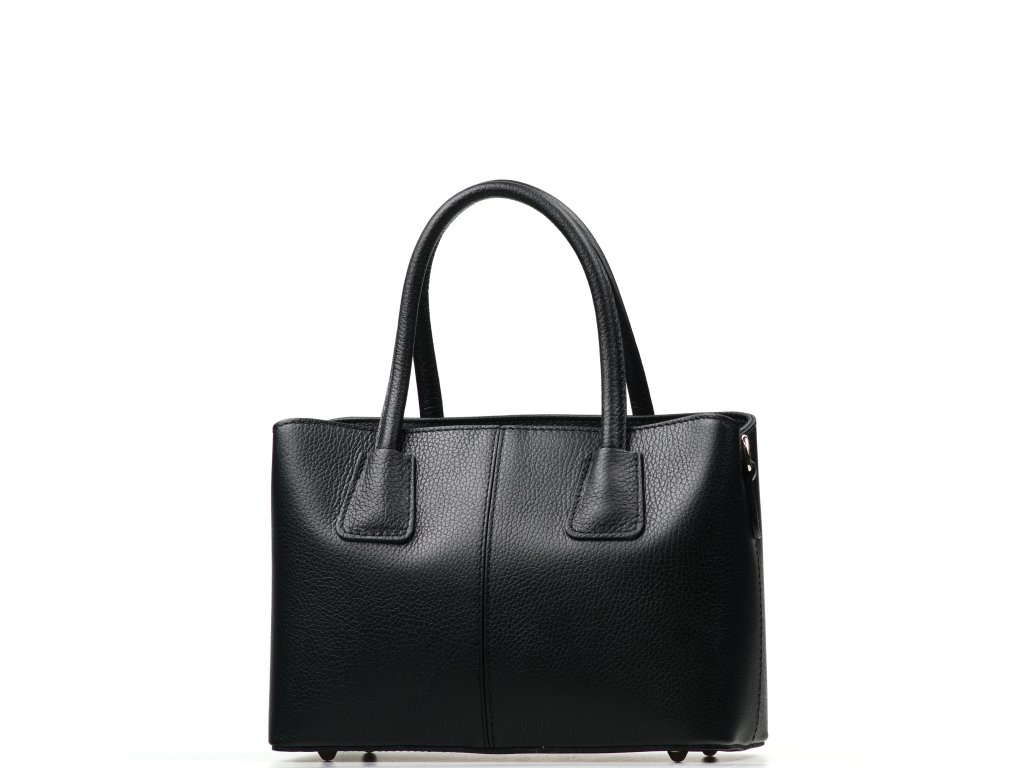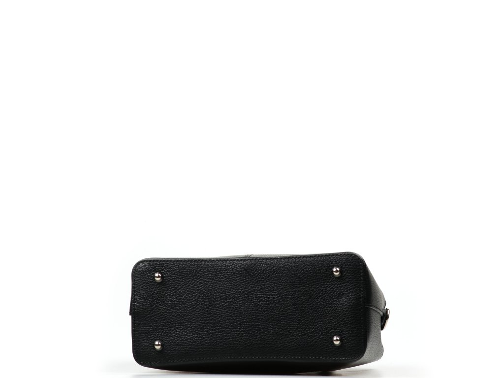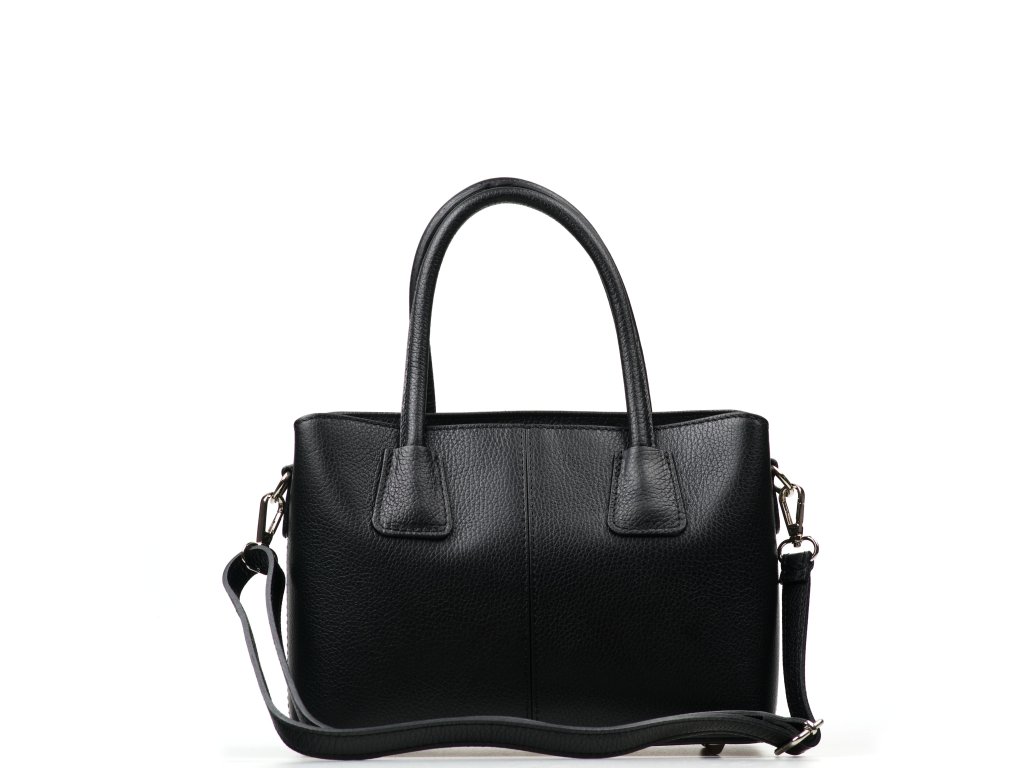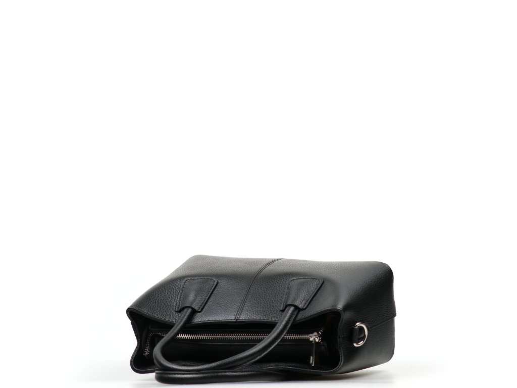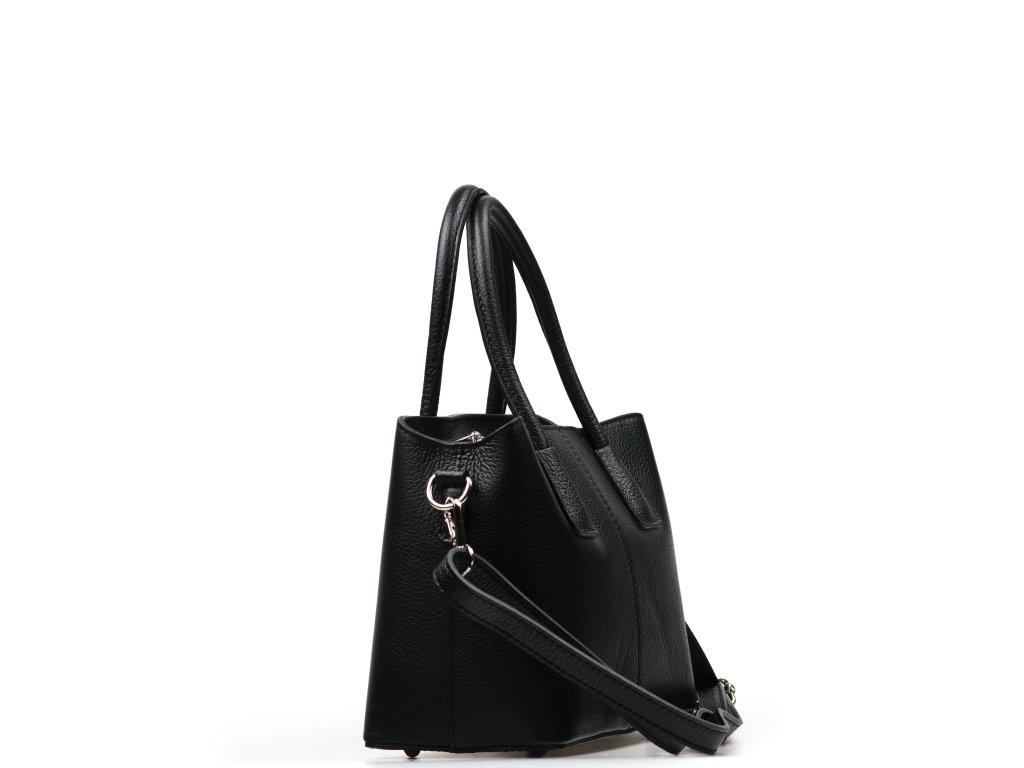 Kožená kabelka do ruky i přes rameno v černé barvě. Interiér kabelky disponuje třemi úložnými kapsami, přičemž jedna je uzavíratelná na zip a dvěma malými bočními. Součástí kabelky je přídavný popruh s karabinami s nastavitelnou délkou. Kabelka se uzavírá zipem.