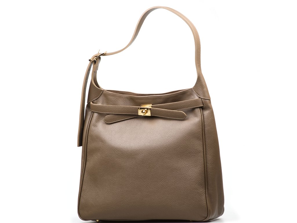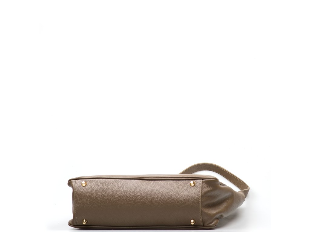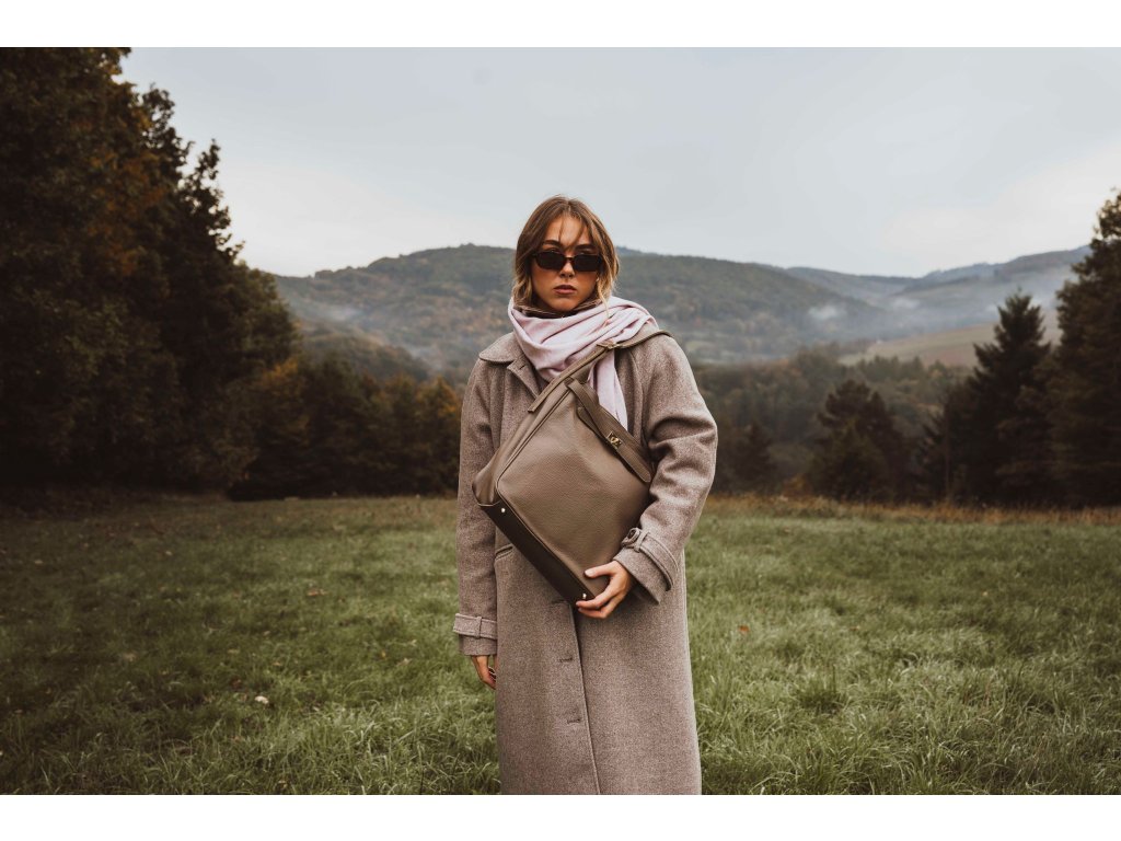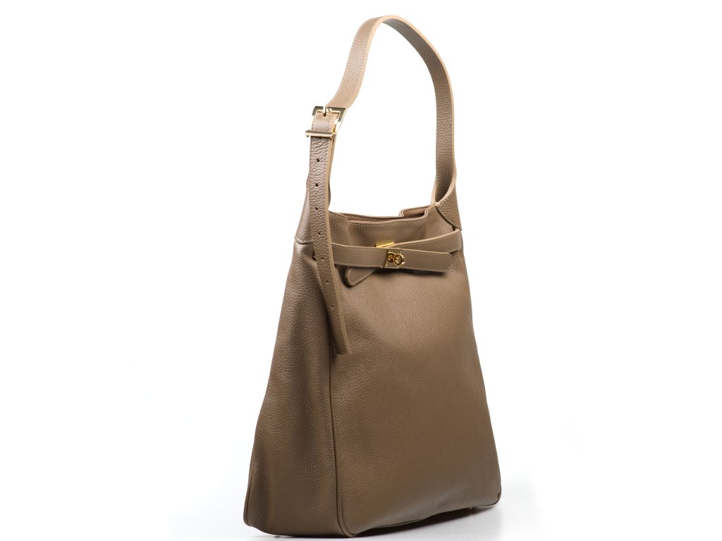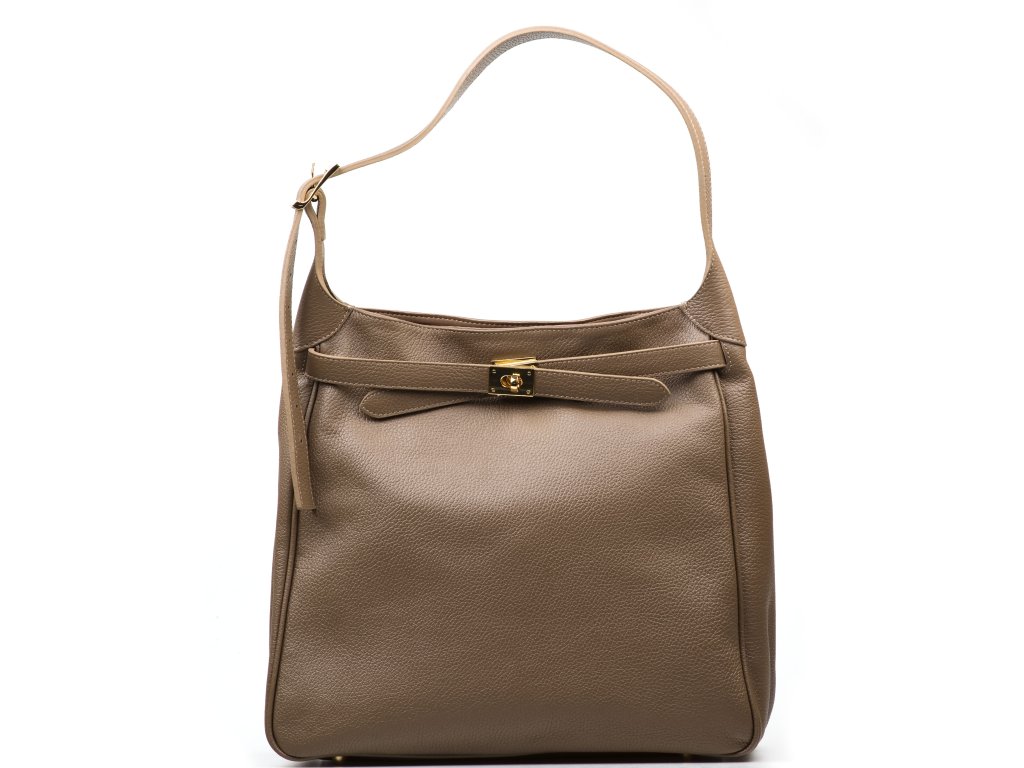 Velká kožená kabelka přes rameno ve fango barvě je ideálním spojením elegance a praktičnosti. Nabízí prostorný interiér s jednou hlavní kapsou a menší boční kapsou na drobnosti, která se uzavírá zipem. Hlavní část kabelky je chráněna stylovým ozdobným klipem, jenž dodává celkovému designu sofistikovaný a moderní vzhled. Perfektní doplněk pro každodenní nošení i výjimečné příležitosti.