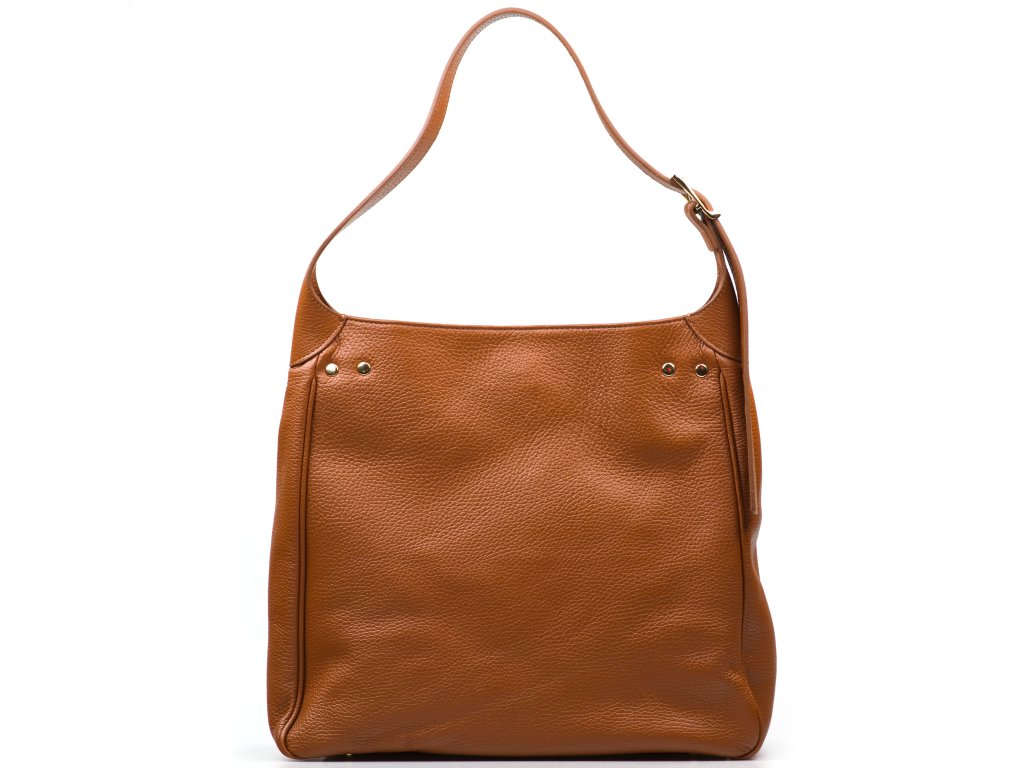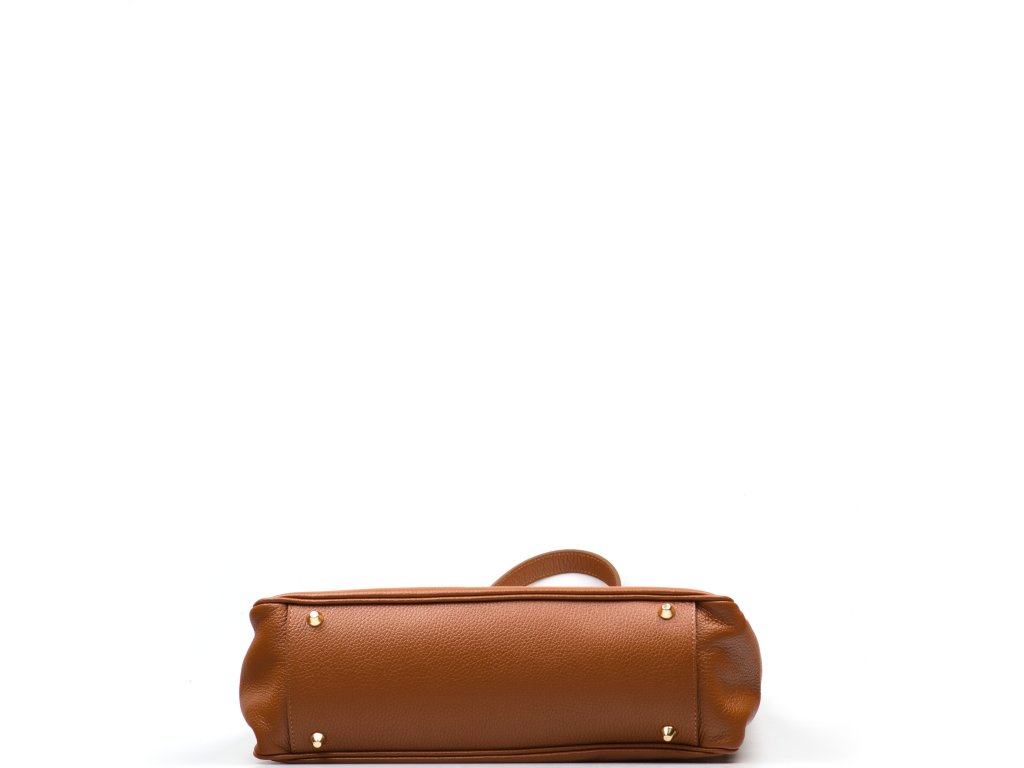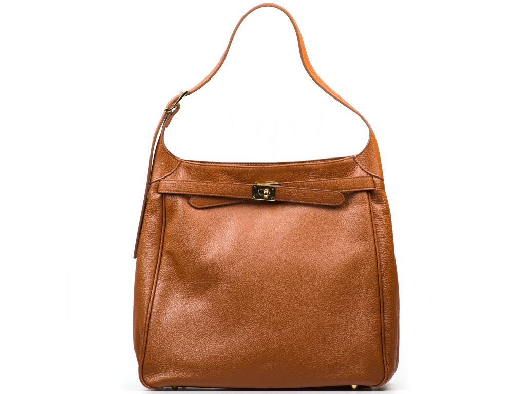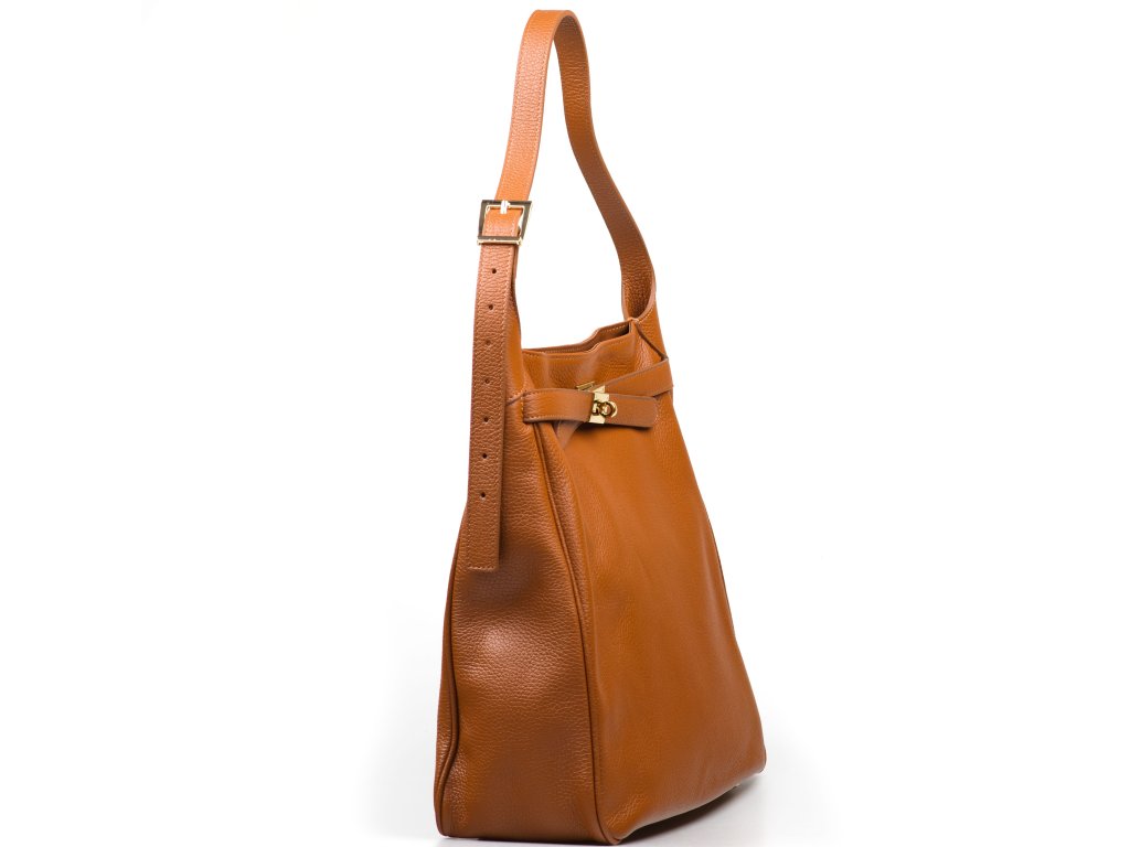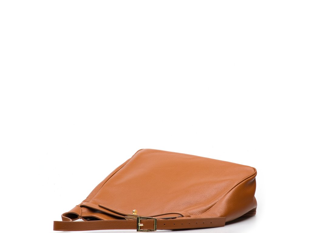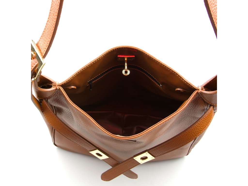 Velká kožená kabelka přes rameno v koňakově hnědé barvě je ideálním spojením elegance a praktičnosti. Nabízí prostorný interiér s jednou hlavní kapsou a menší boční kapsou na drobnosti, která se uzavírá zipem. Hlavní část kabelky je chráněna stylovým ozdobným klipem, jenž dodává celkovému designu sofistikovaný a moderní vzhled. Perfektní doplněk pro každodenní nošení i výjimečné příležitosti.