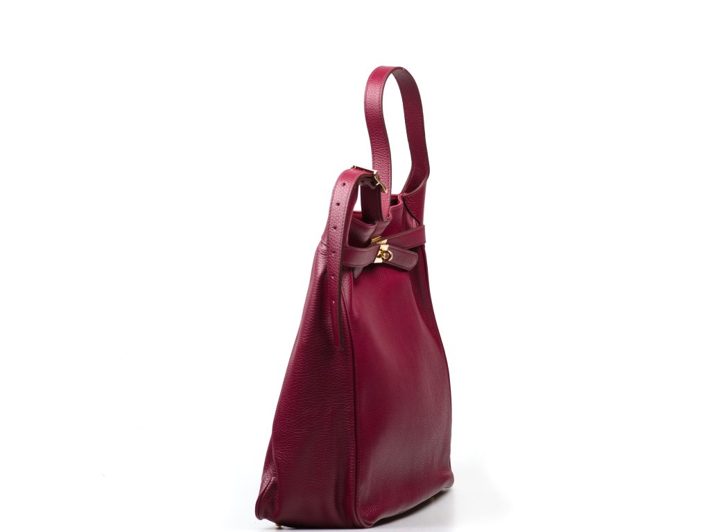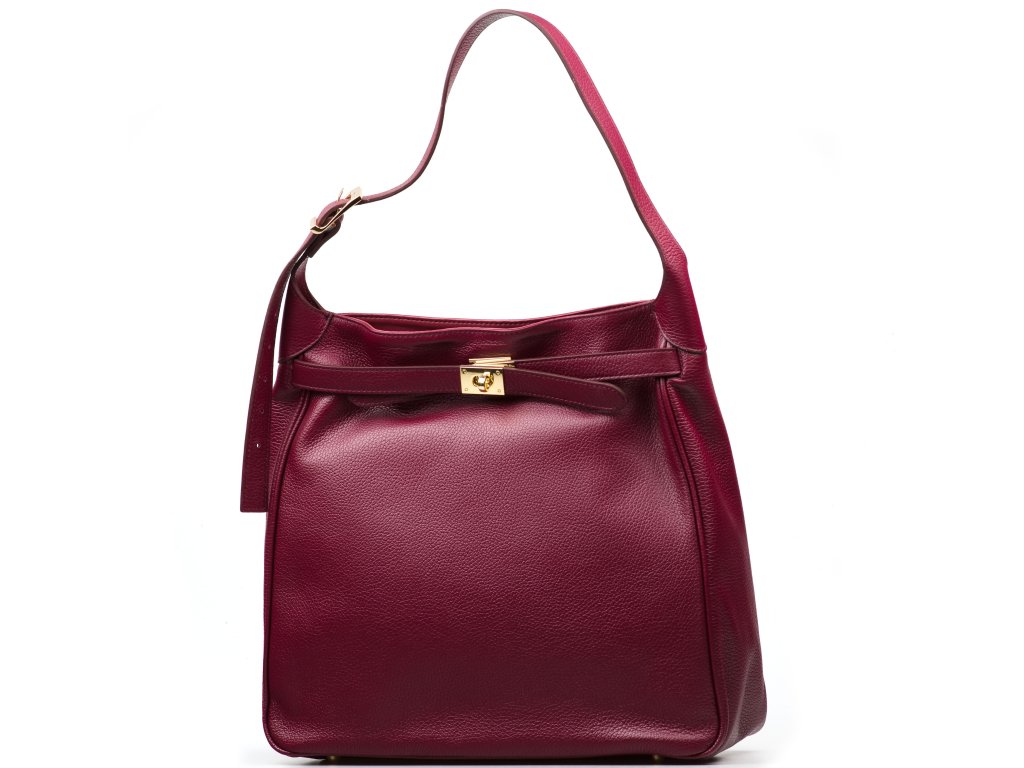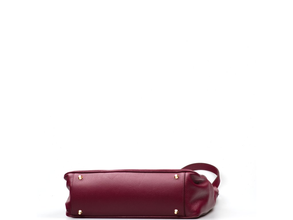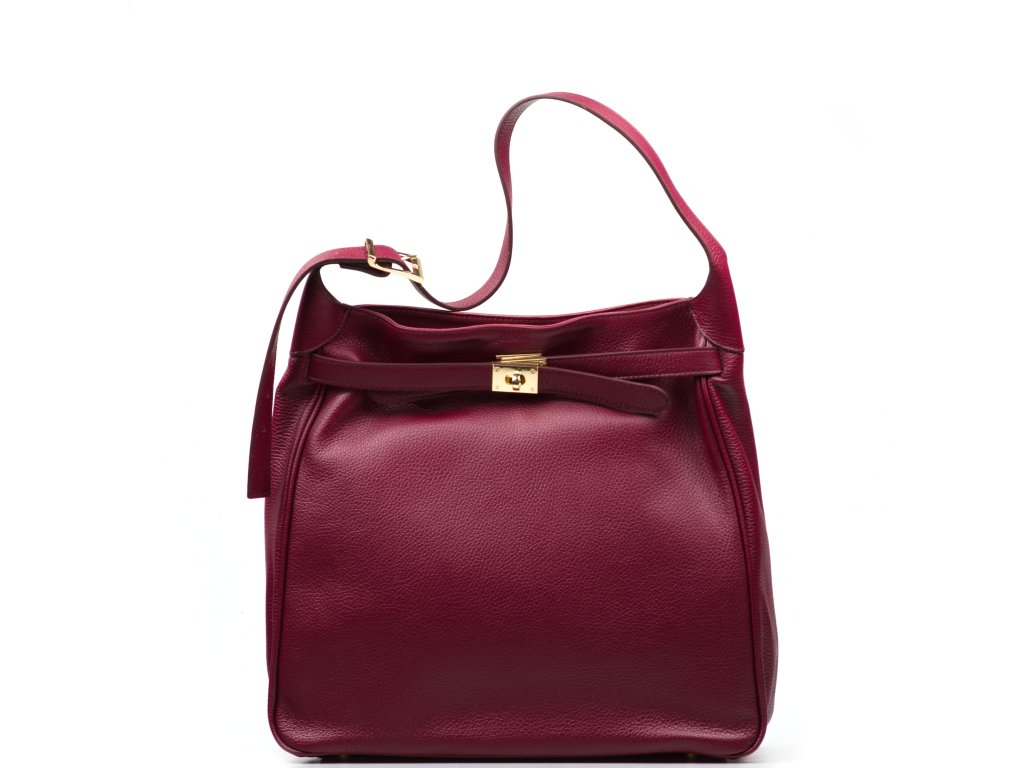 Velká kožená kabelka přes rameno ve vínově červené barvě je ideálním spojením elegance a praktičnosti. Nabízí prostorný interiér s jednou hlavní kapsou a menší boční kapsou na drobnosti, která se uzavírá zipem. Hlavní část kabelky je chráněna stylovým ozdobným klipem, jenž dodává celkovému designu sofistikovaný a moderní vzhled. Perfektní doplněk pro každodenní nošení i výjimečné příležitosti.