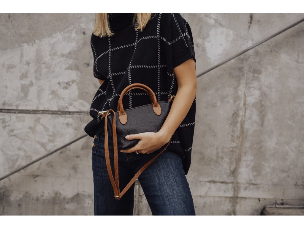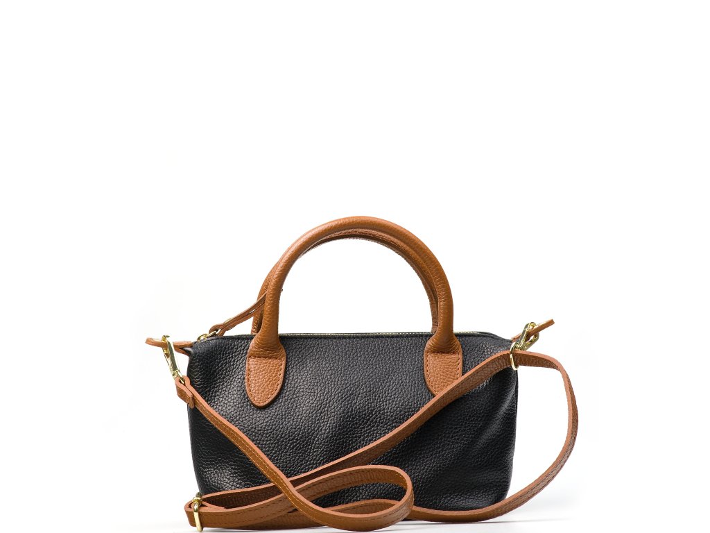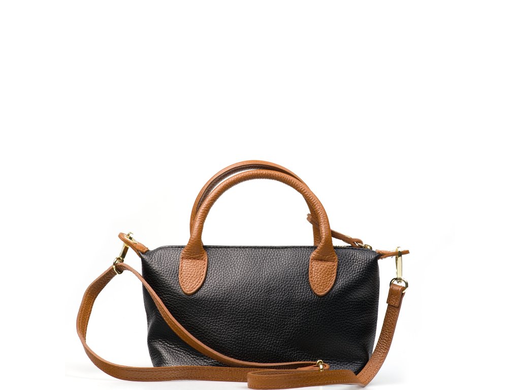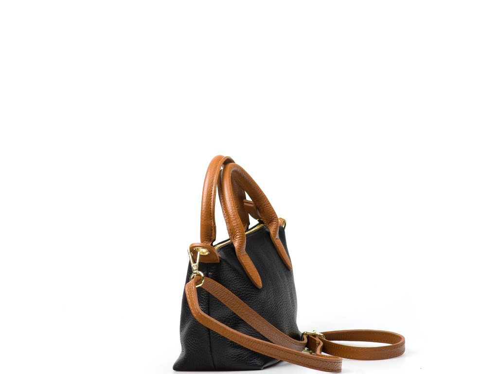 Kožená kabelka pro volný čas v černé barvě. Kabelka má ucha v koňakové barvě. Interiér kabelky disponuje jednou úložnou kapsou. Kabelka disponuje nastavitelným přídavným popruhem. Kabelka se uzavírá zipem.