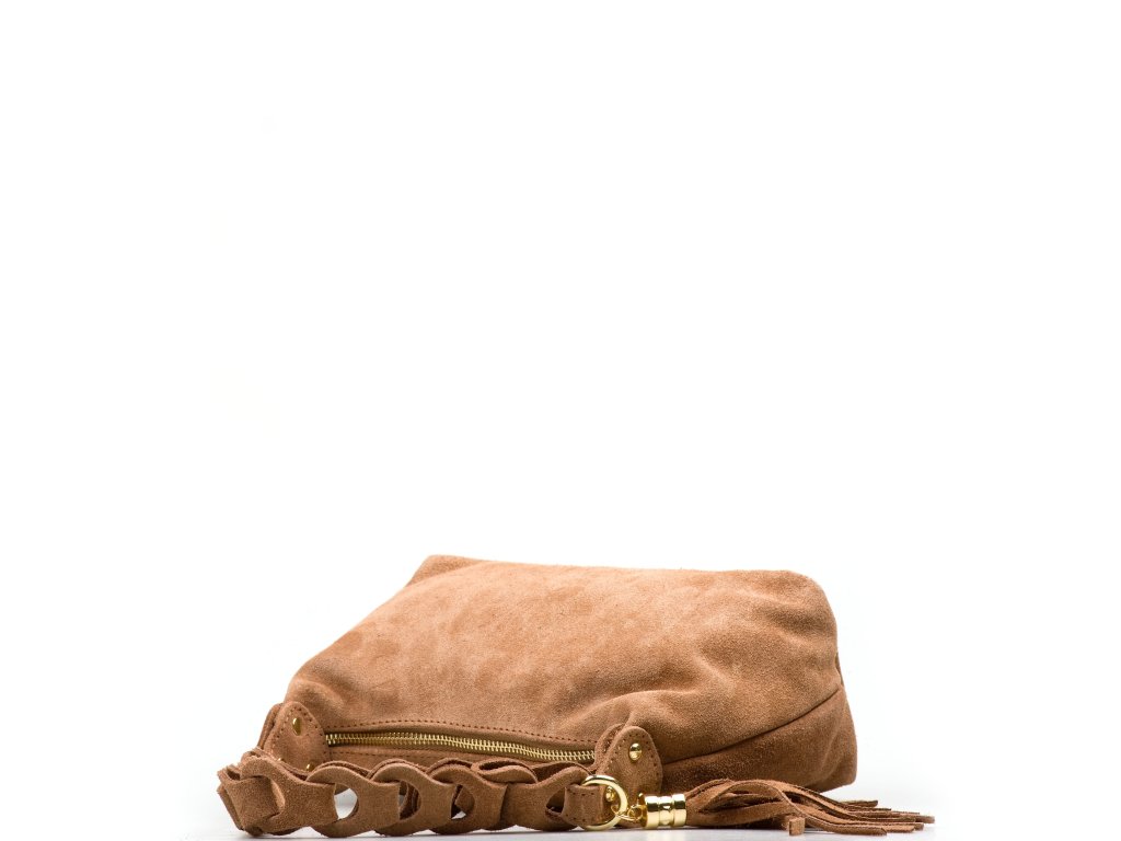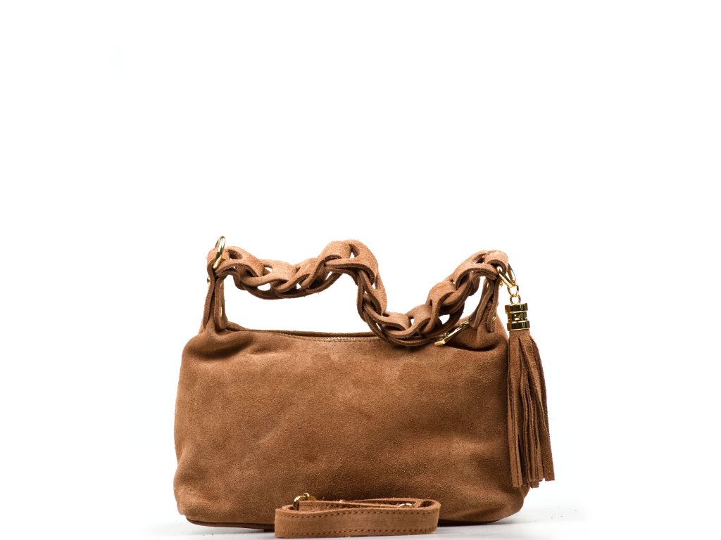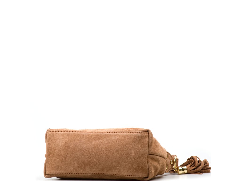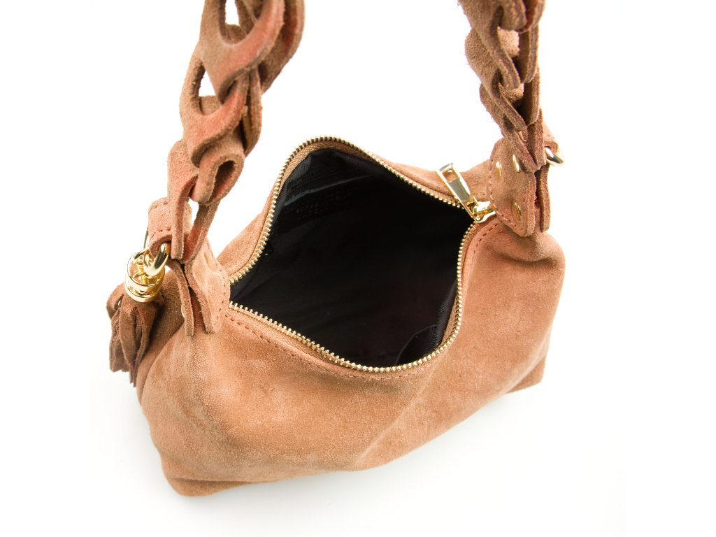 Semišová kabelka ve světle hnědé barvě je stylovým doplňkem, který zaujme svým originálním designem. Kabelku zdobí její Součástí kabelky je přídavný popruh, díky kterému ji lze pohodlně nosit přes tělo. Kabelka se uzavírá zipem a háčkem, což zajišťuje bezpečné uložení všech věcí. Elegantní a praktický kousek, který skvěle doplní každý outfit.