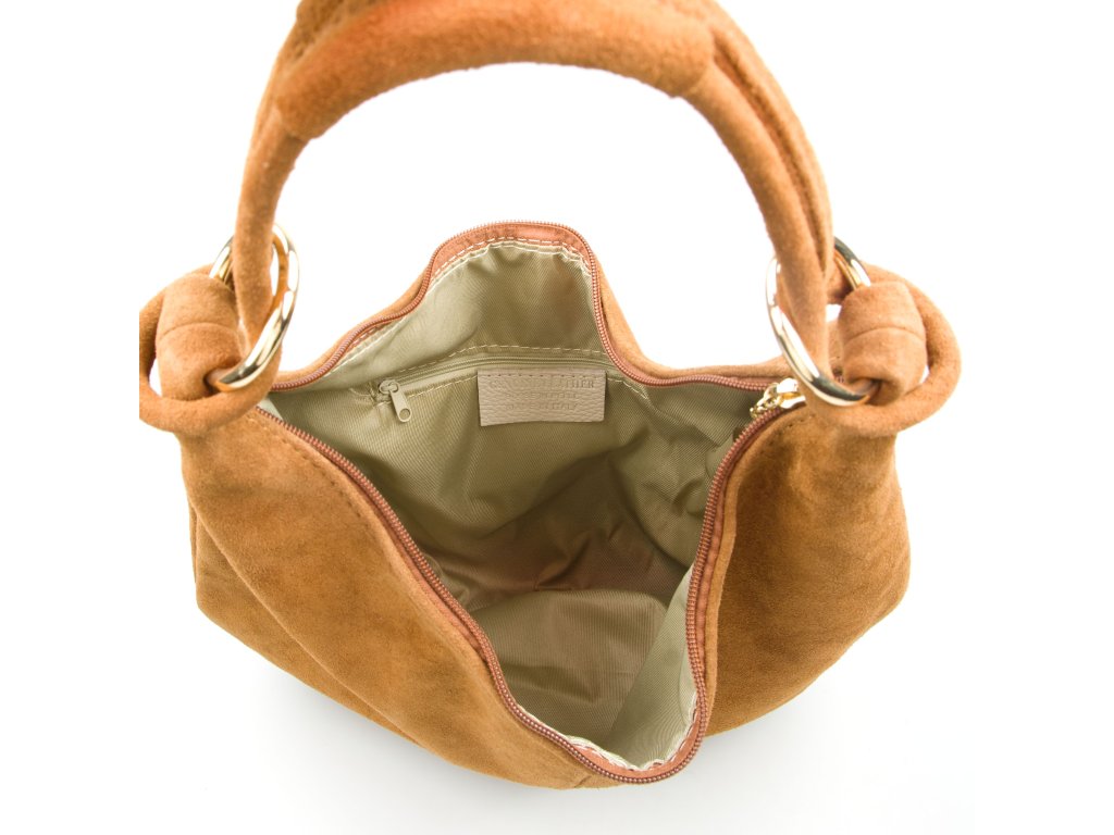 Praktická, minimalistická kabelka ze semišové kůže přes rameno v koňakově hnědé barvě, která se hodí na každý den i volný čas. Uvnitř najdete jednu úložnou kapsu pro přehledné uspořádání drobností, které chcete mít rychle po ruce (např. klíče, telefon nebo karty). Kabelka se bezpečně uzavírá zipem, takže vaše věci zůstanou tam, kde mají.