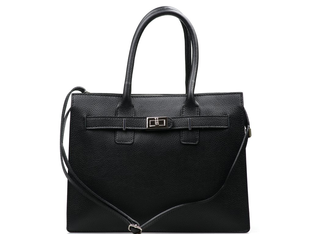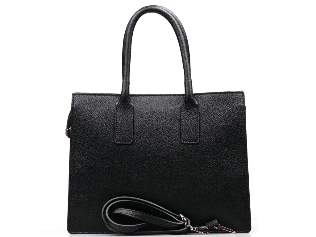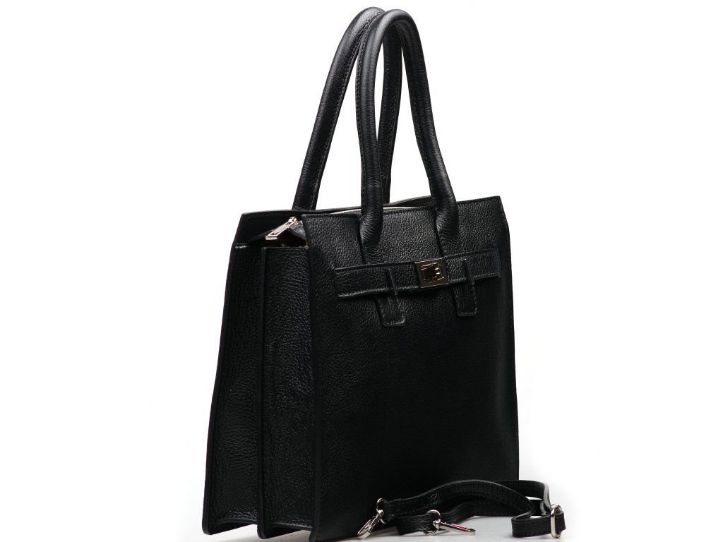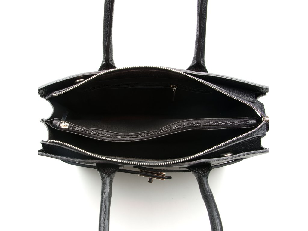 Kožená kabelka do ruky i přes rameno v černé barvě. Interiér kabelky disponuje třemi úložnými kapsami, přičemž jedna je uzavíratelná na zip a dvěma malými bočními. Součástí kabelky je přídavný popruh s karabinami s nastavitelnou délkou. Horní část kabelky zdobí kožený popruh se stříbrnými sponami.