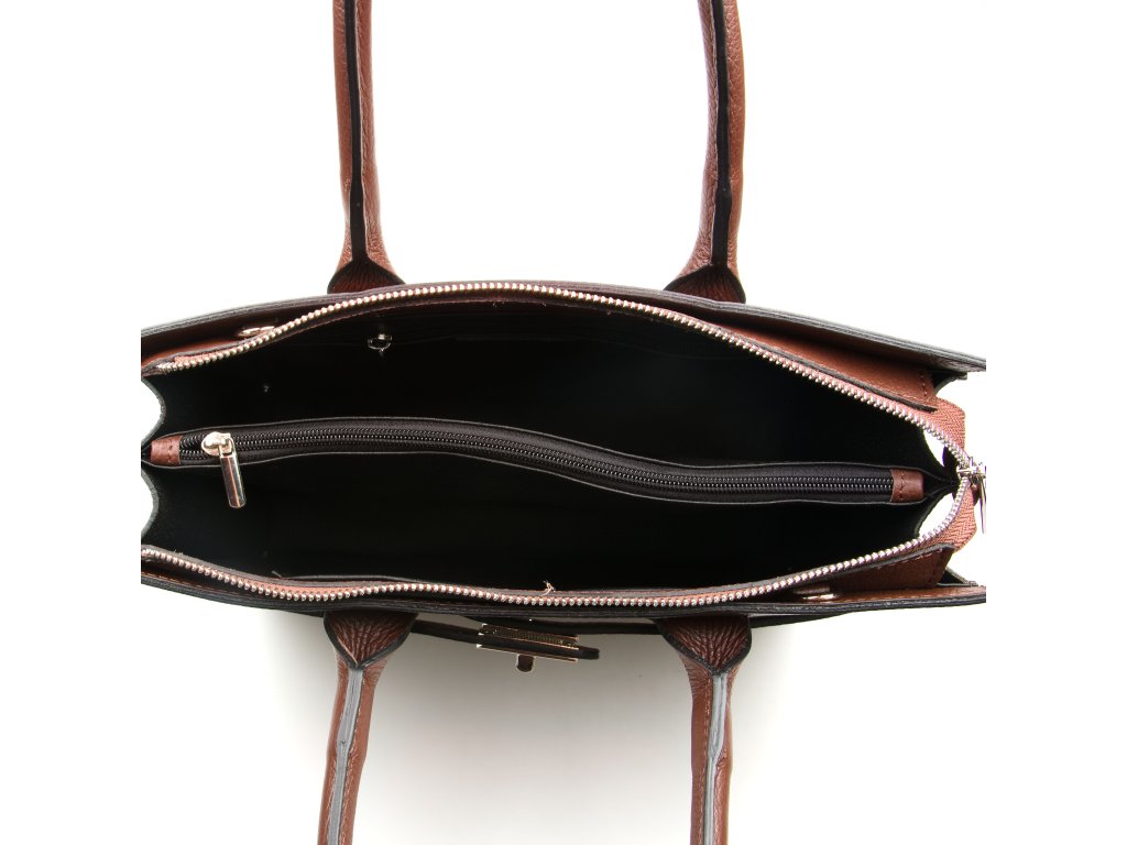 Kožená kabelka do ruky i přes rameno v hnědé barvě. Interiér kabelky disponuje třemi úložnými kapsami, přičemž jedna je uzavíratelná na zip a dvěma malými bočními. Součástí kabelky je přídavný popruh s karabinami s nastavitelnou délkou. Horní část kabelky zdobí kožený popruh se stříbrnými sponami.