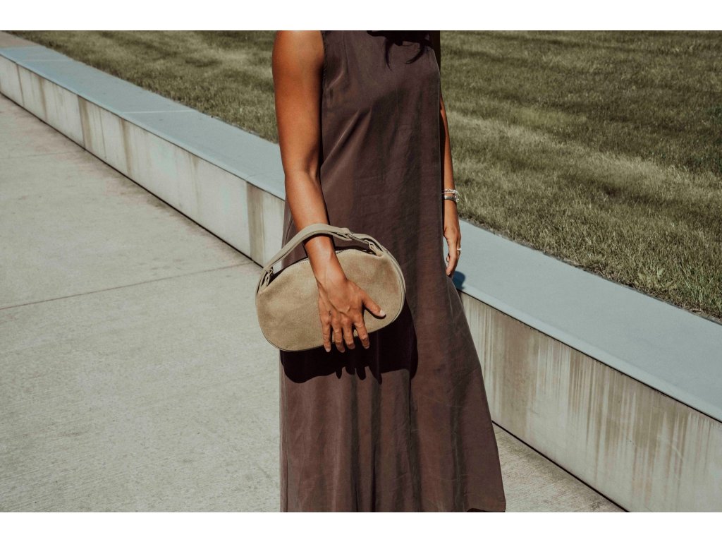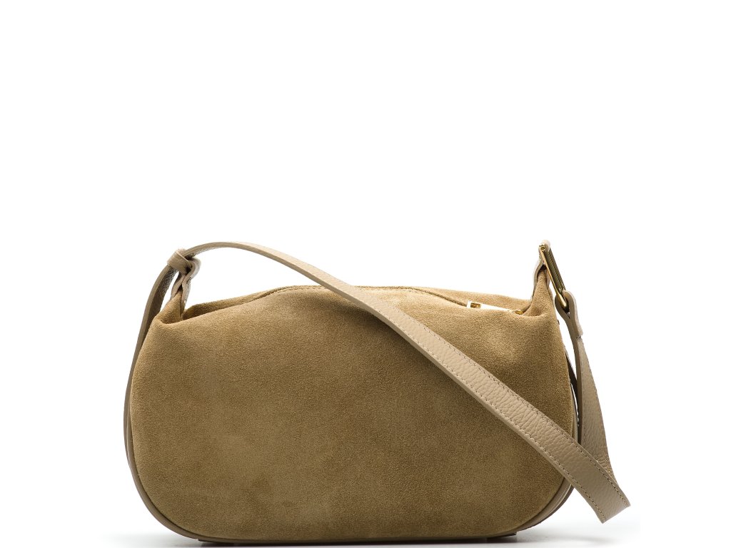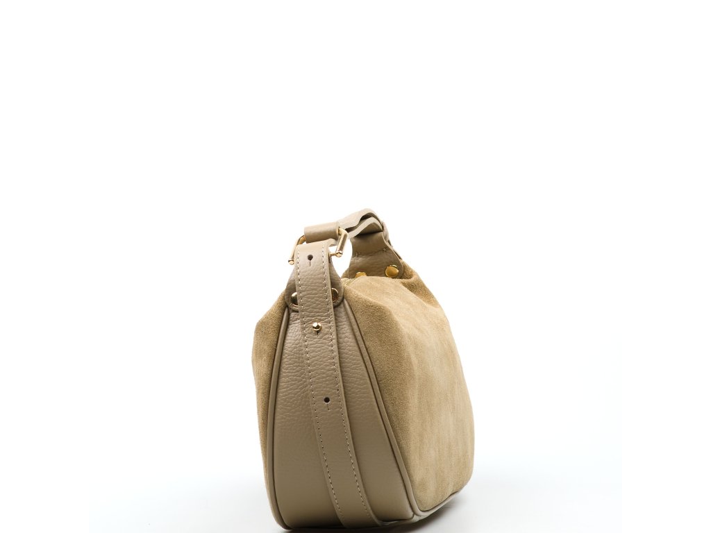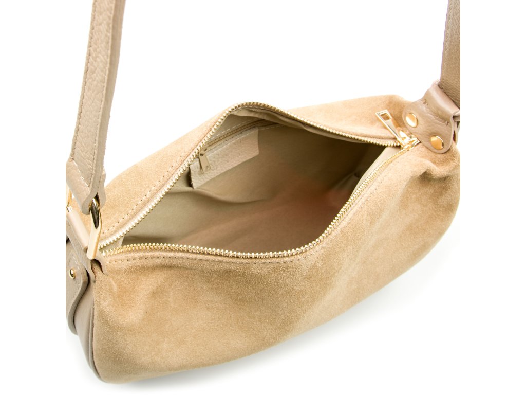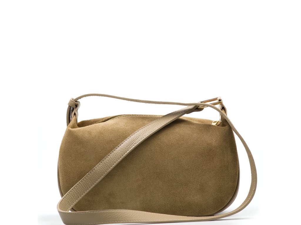 Elegantní kožená kabelka v taupe barvě v kombinaci semiš a kůže. Interiér kabelky disponuje jednou hlavní kapsou a jednou malou boční, jež je uzavíratelná zipem. Kabelka má pevný popruh, který lze nastavit pro nošení v ruce, přes rameno či jako crossbody. Kabelka je uzavíratelná zipem.