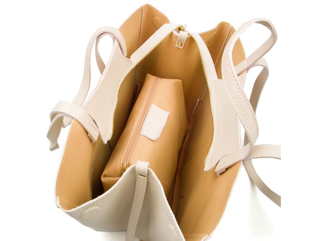Minimalistická kožená kabelka do ruky či přes rameno v béžové barvě. Kabelku lze nosit ve dvou tvarových variantách. Interiér disponuje jednou velkou úložnou kapsou a přídavnou volnou kapsou. Kabelka se uzavírá zipem.