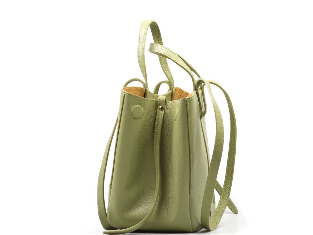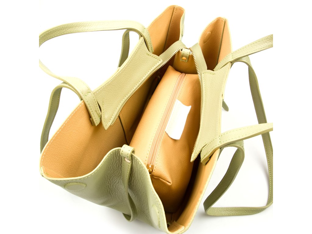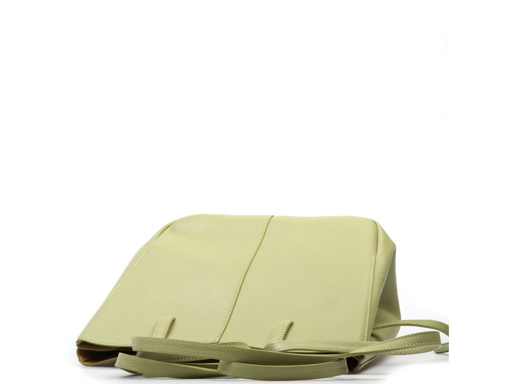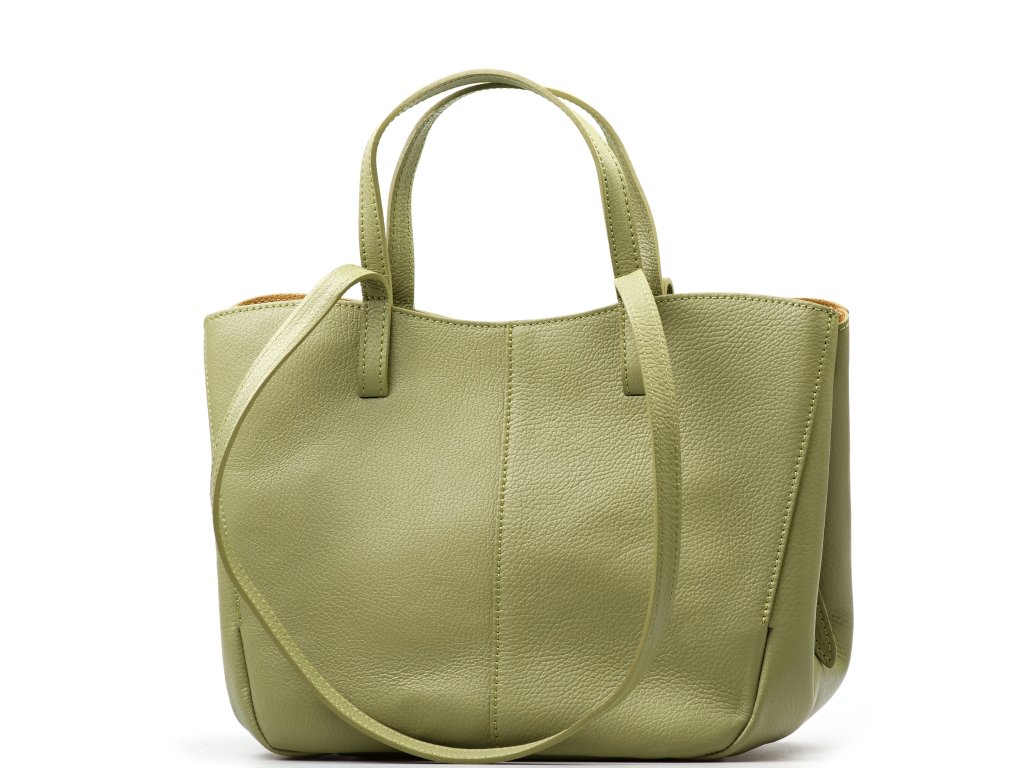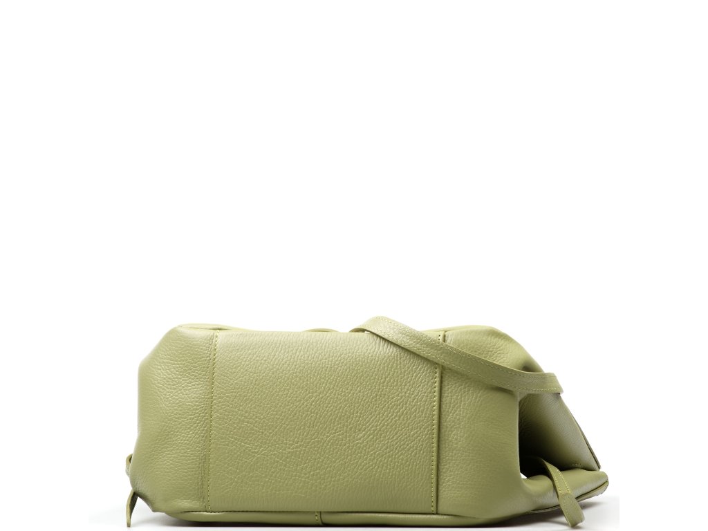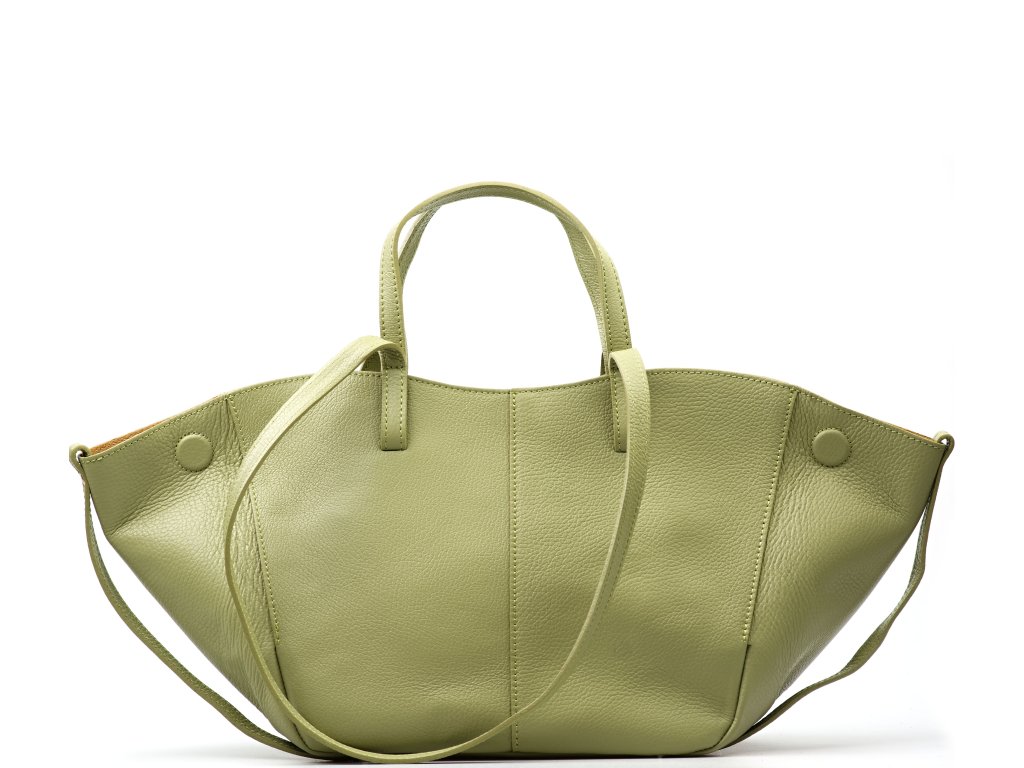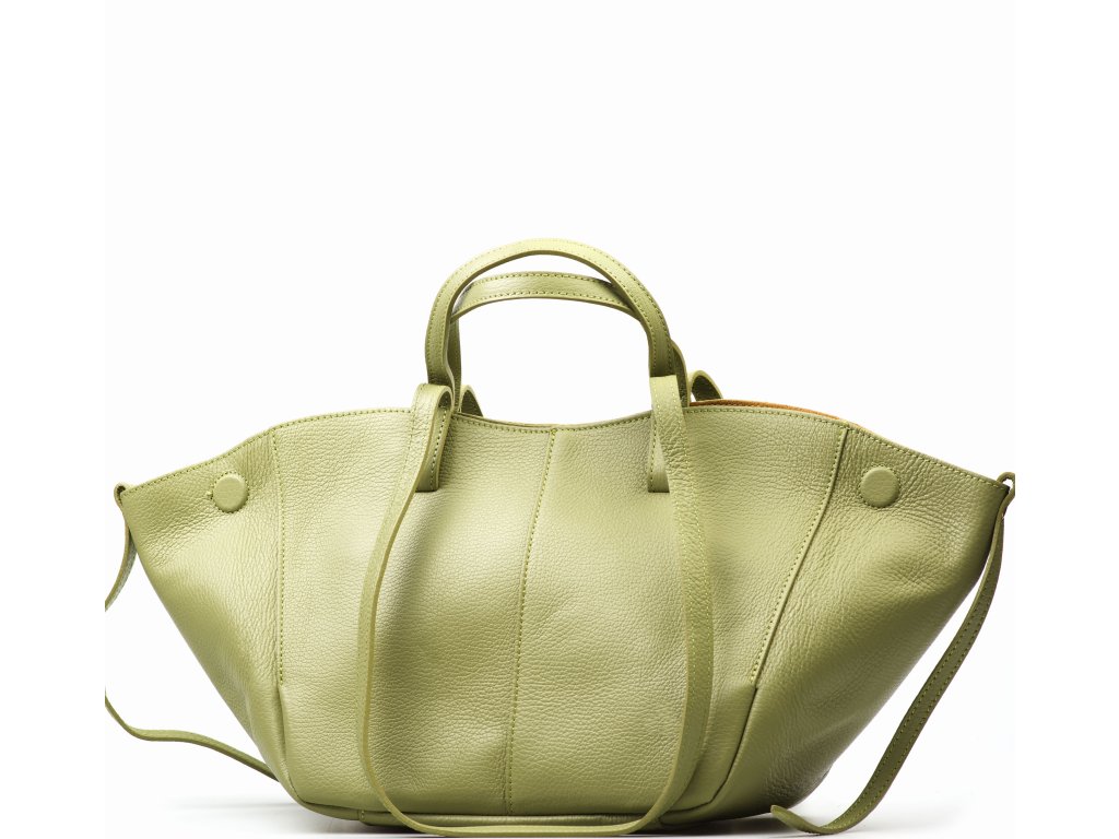 Minimalistická kožená kabelka do ruky či přes rameno v zelené barvě. Kabelku lze nosit ve dvou tvarových variantách. Interiér disponuje jednou velkou úložnou kapsou a přídavnou volnou kapsou. Kabelka se uzavírá zipem.