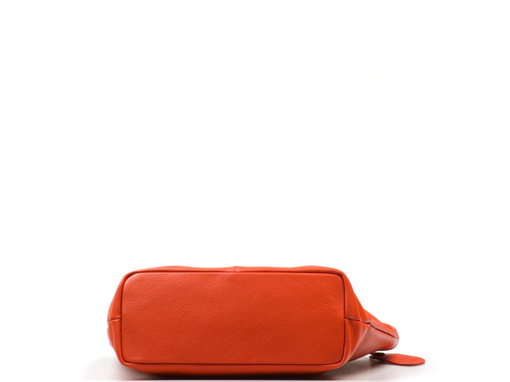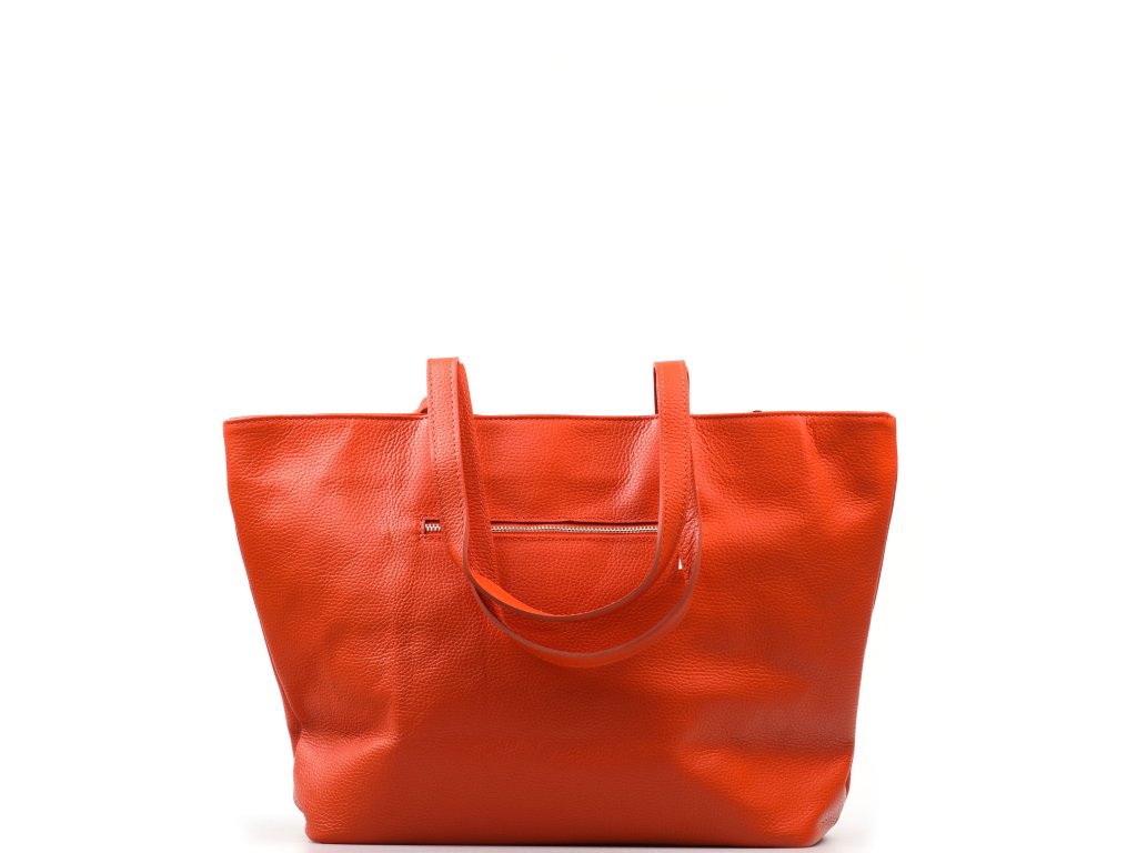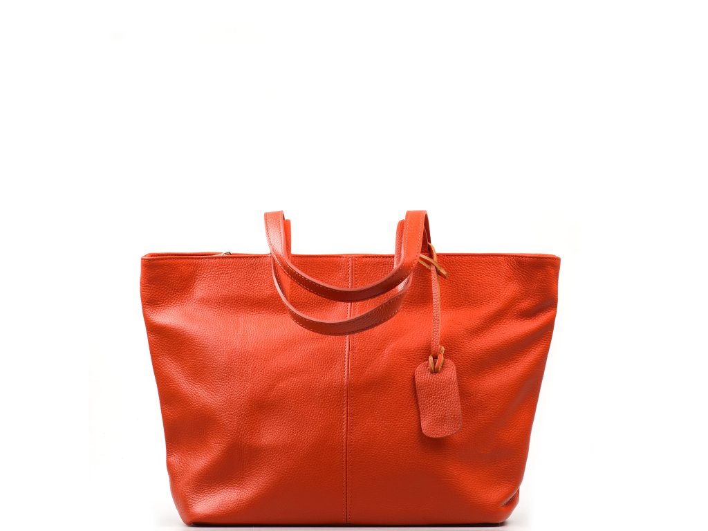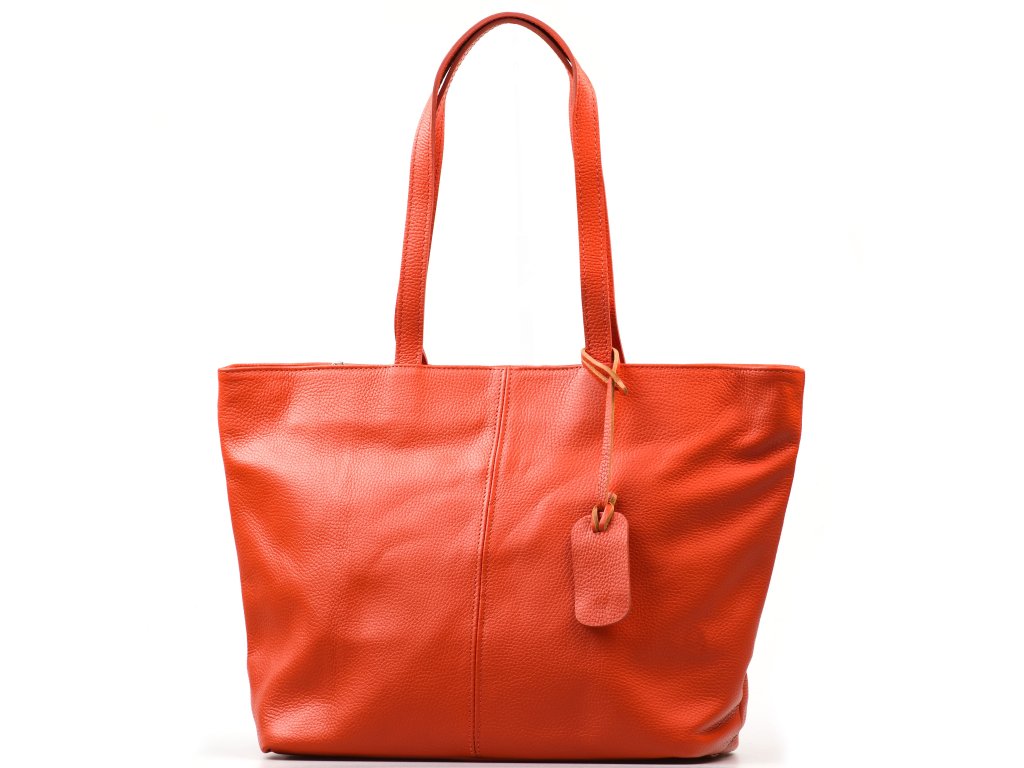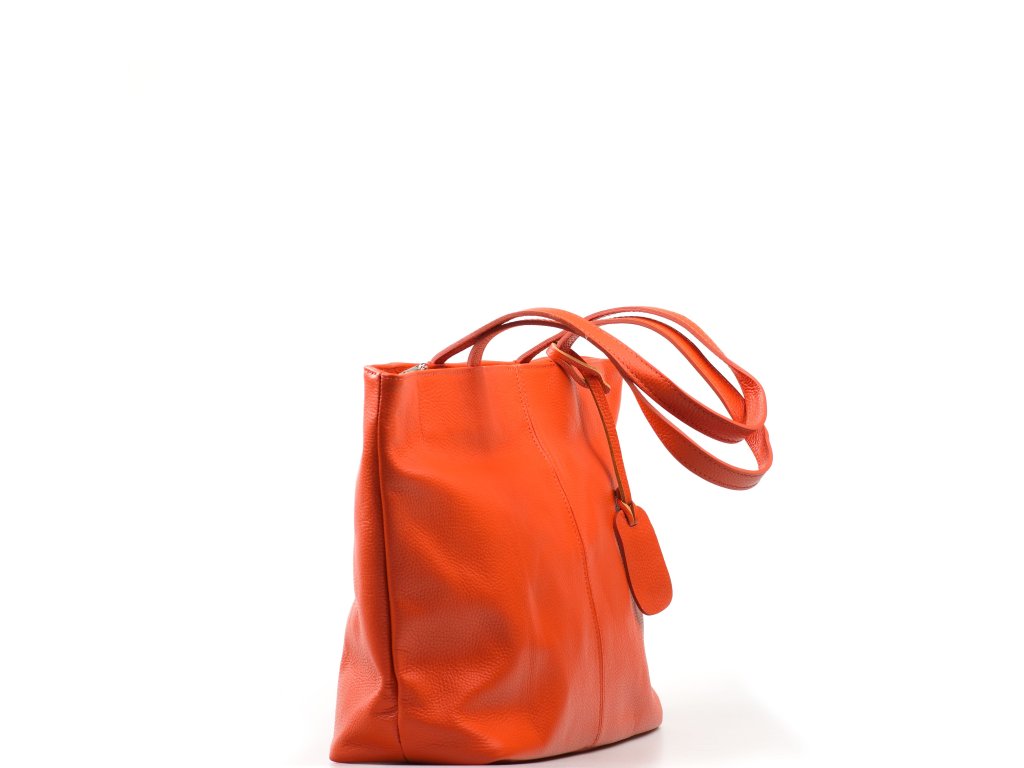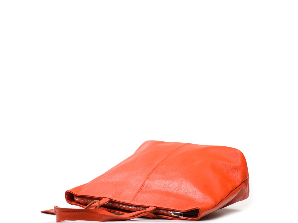 Dámská minimalistická kožená kabelka pro volný čas, do ruky i přes rameno v oranžové barvě. Vnitřní část disponuje jednou hlavní kapsou a dvěma bočními, jež je jedna uzavíratelná zipem.