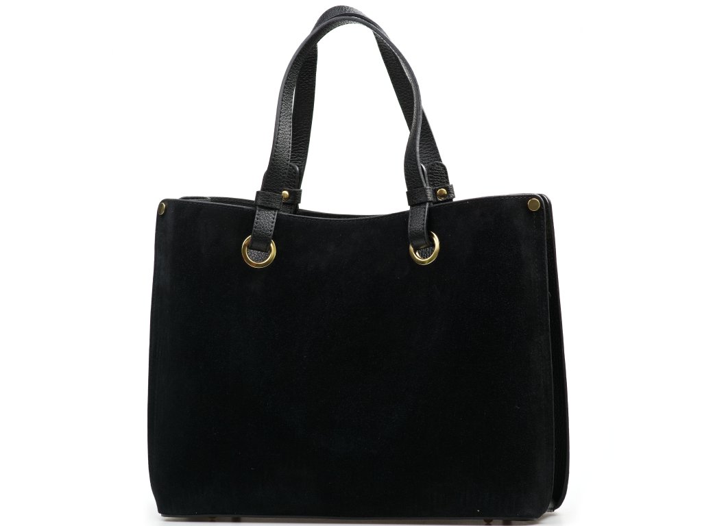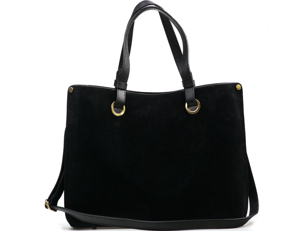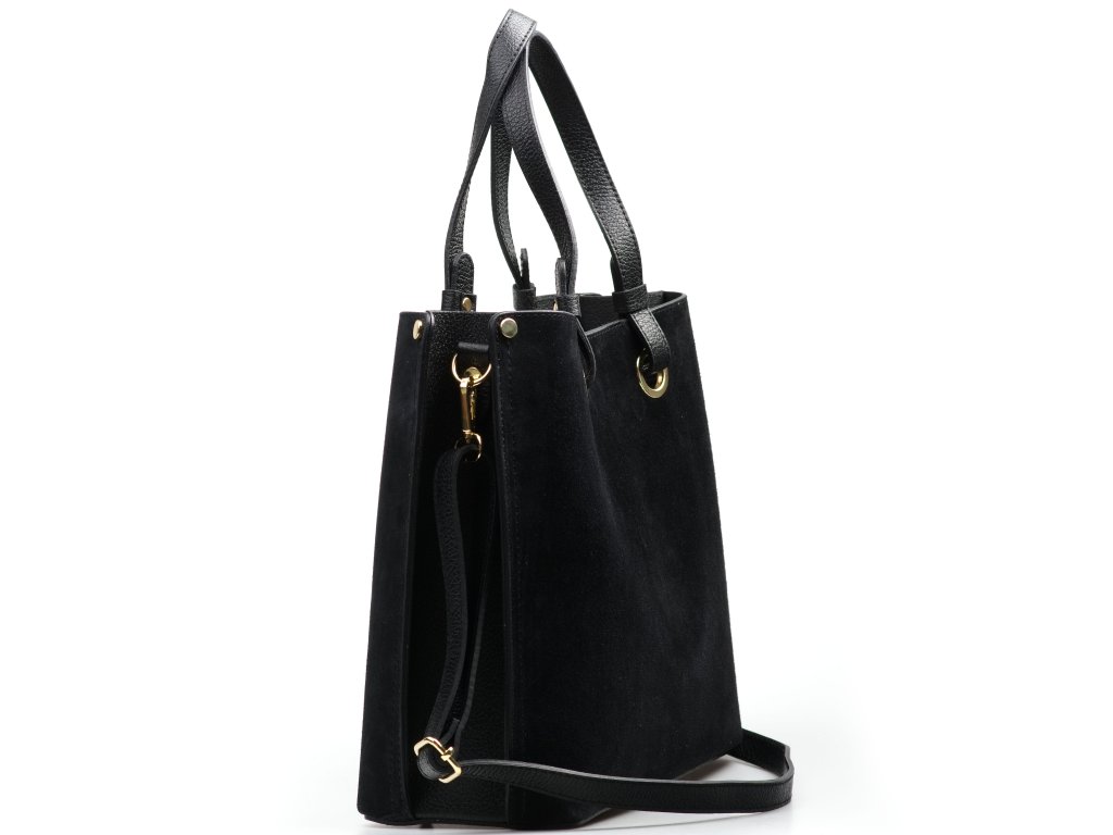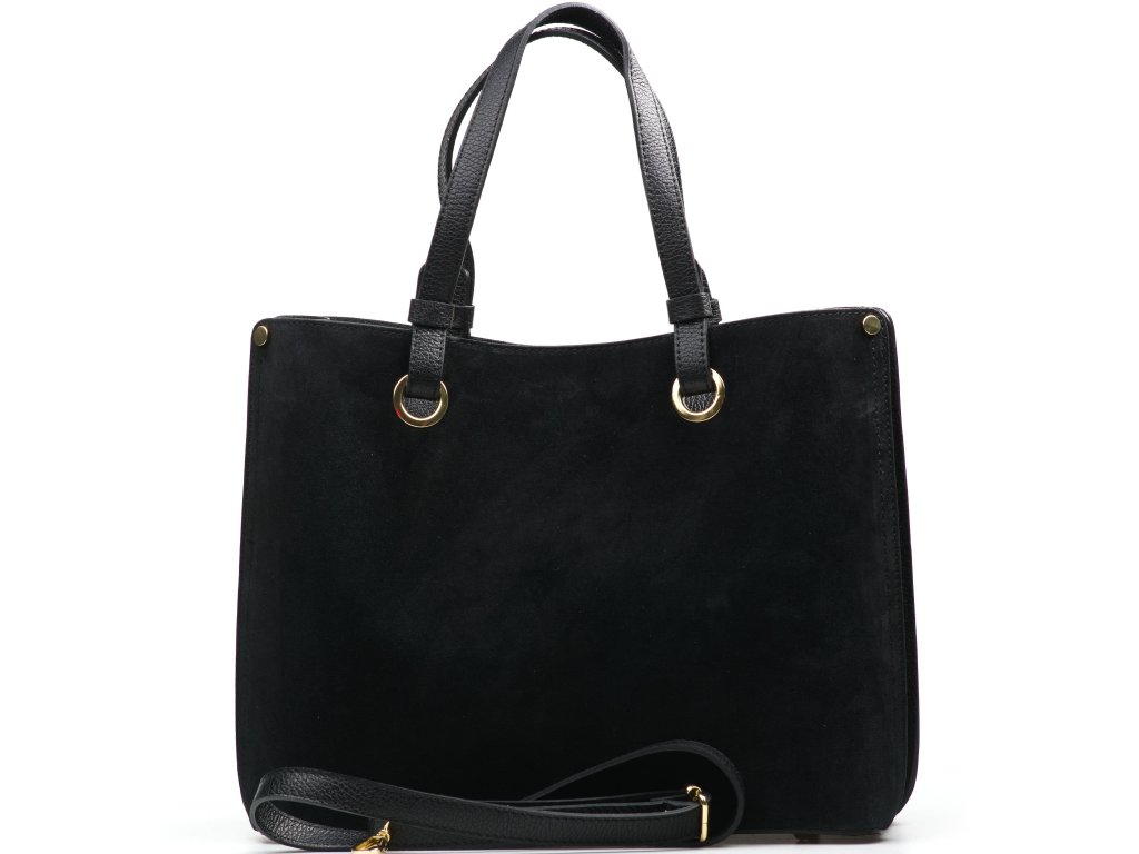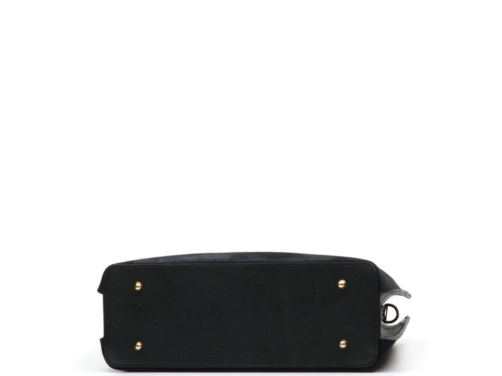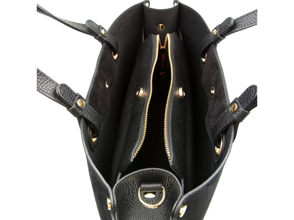 Kožená kabelka do ruky i přes rameno v černé barvě. Interiér kabelky disponuje třemi úložnými kapsami, přičemž jedna je uzavíratelná na zip a jedna malá boční. Součástí kabelky je přídavný popruh s karabinami s nastavitelnou délkou. kabelka je uzavíratelná zipem a cvoky.