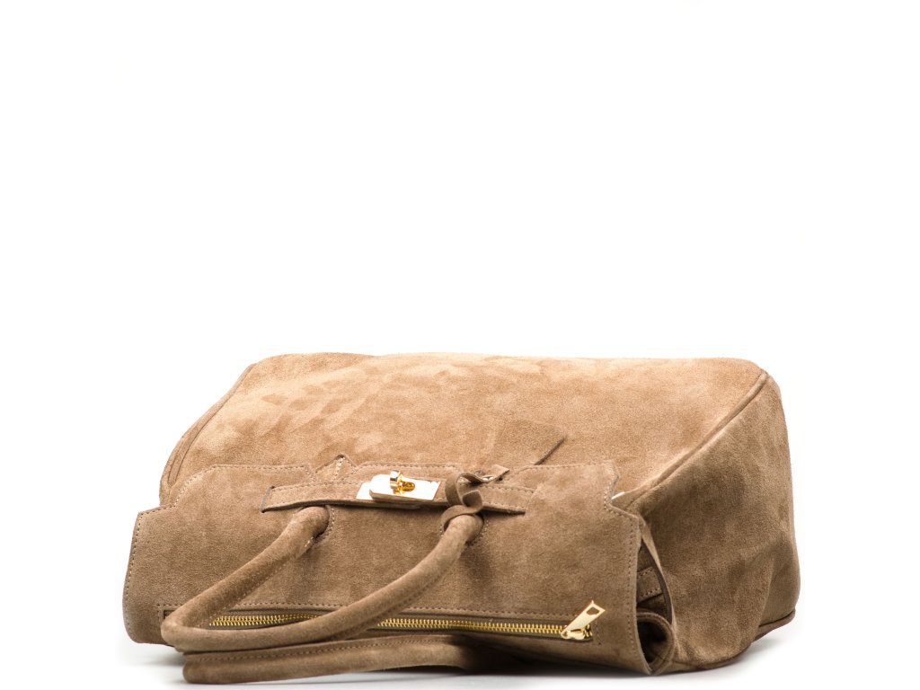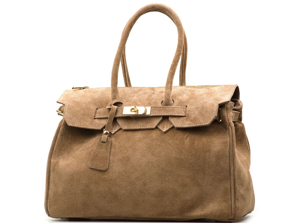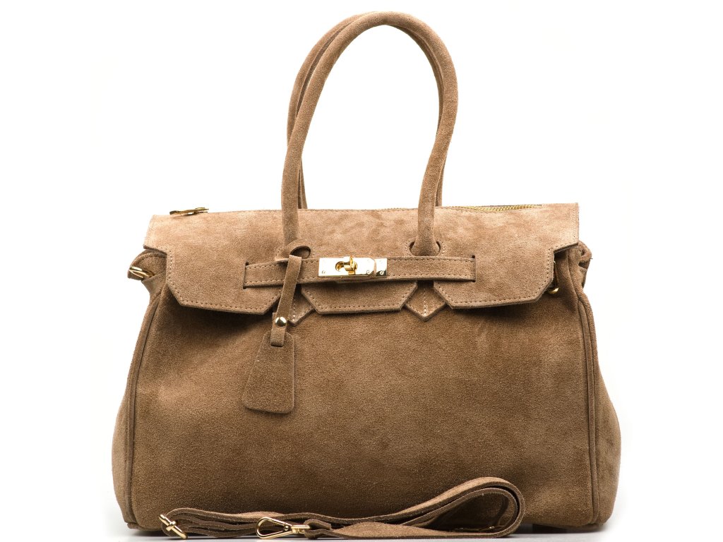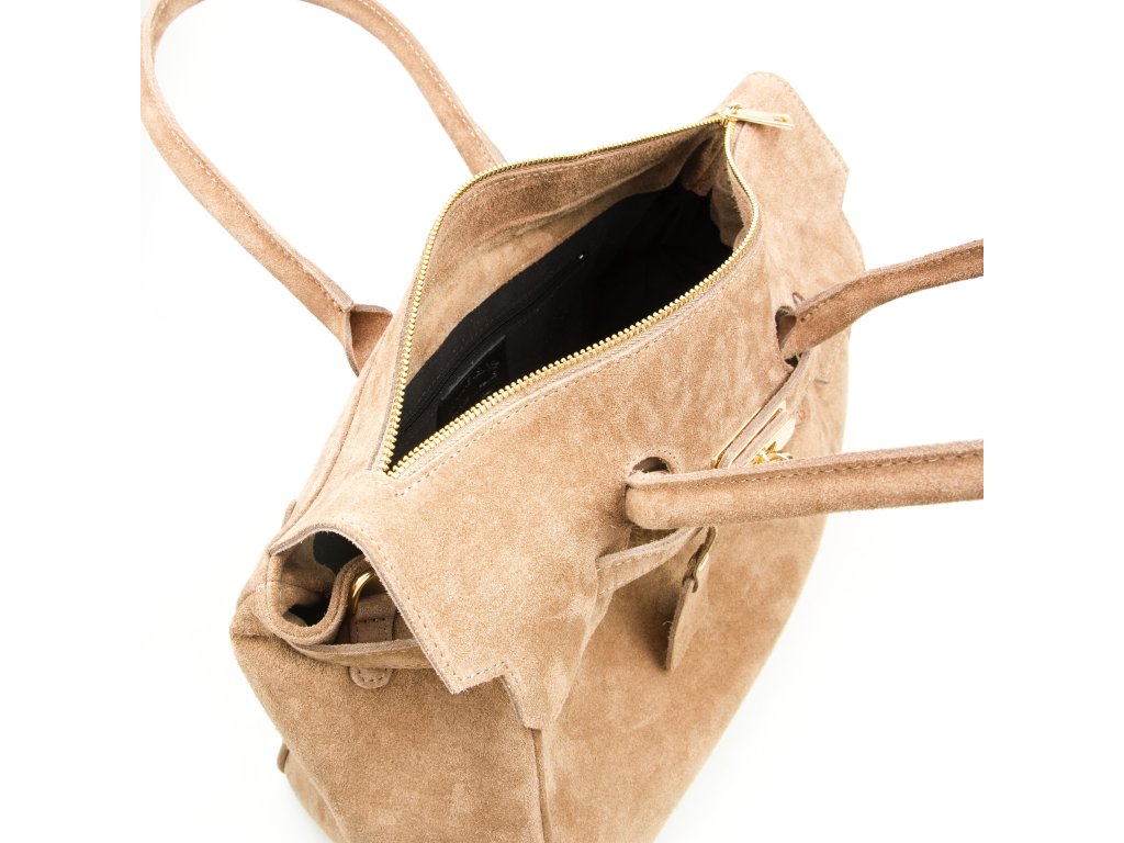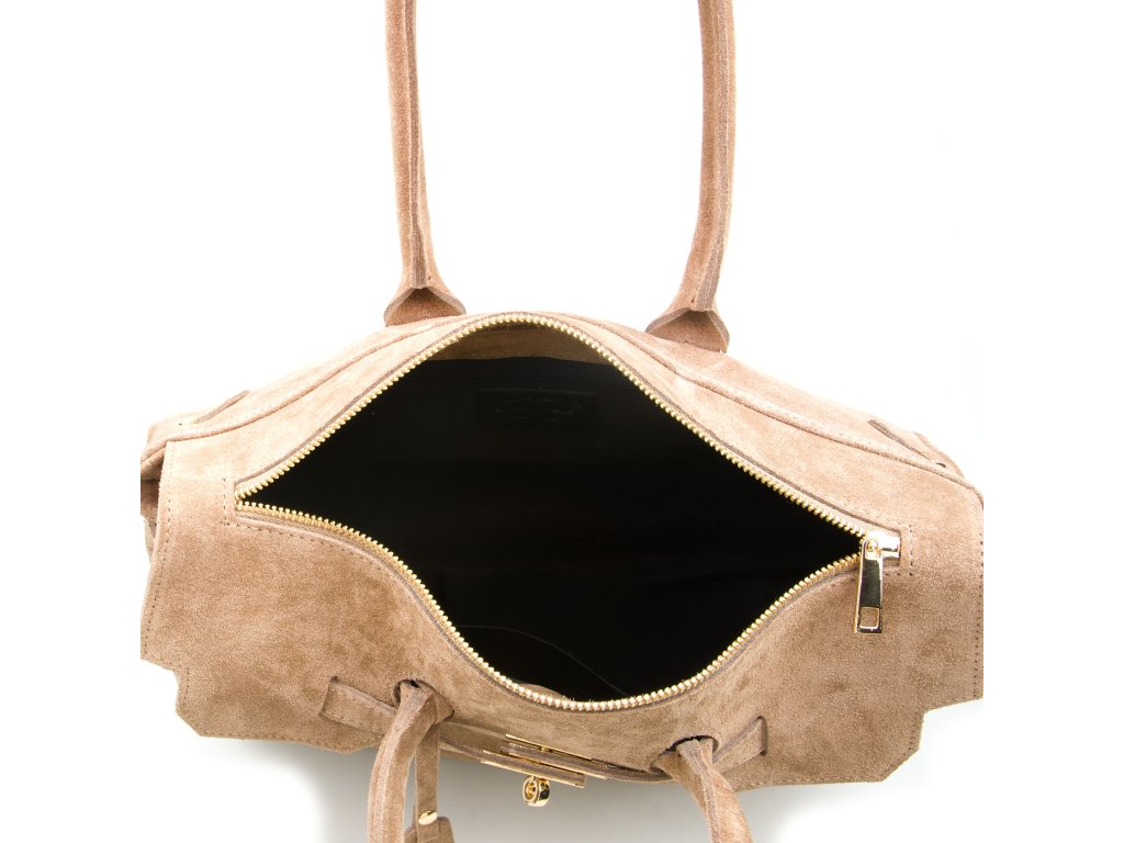 Semišová kožená kabelka do ruky i přes rameno ve fango barvě. Interiér kabelky disponuje jednou hlavní úložnou kapsou a jednou malou boční. Horní část kabelky zdobí kožený popruh se zlatými sponami. Součástí kabelky je přídavný popruh na nošení přes tělo. Kabelka se uzavírá pomocí zipu nebo klopy.