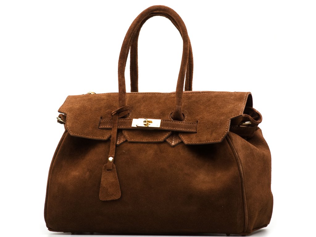 Semišová kožená kabelka do ruky i přes rameno v hnědé barvě. Interiér kabelky disponuje jednou hlavní úložnou kapsou a jednou malou boční. Horní část kabelky zdobí kožený popruh se zlatými sponami. Součástí kabelky je přídavný popruh na nošení přes tělo. Kabelka se uzavírá pomocí zipu nebo klopy.