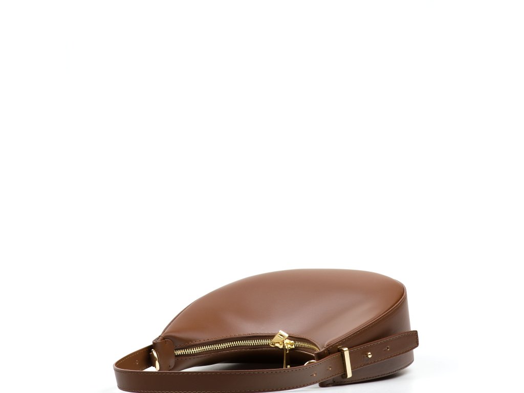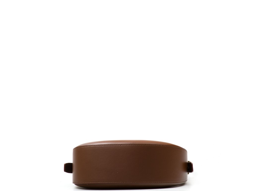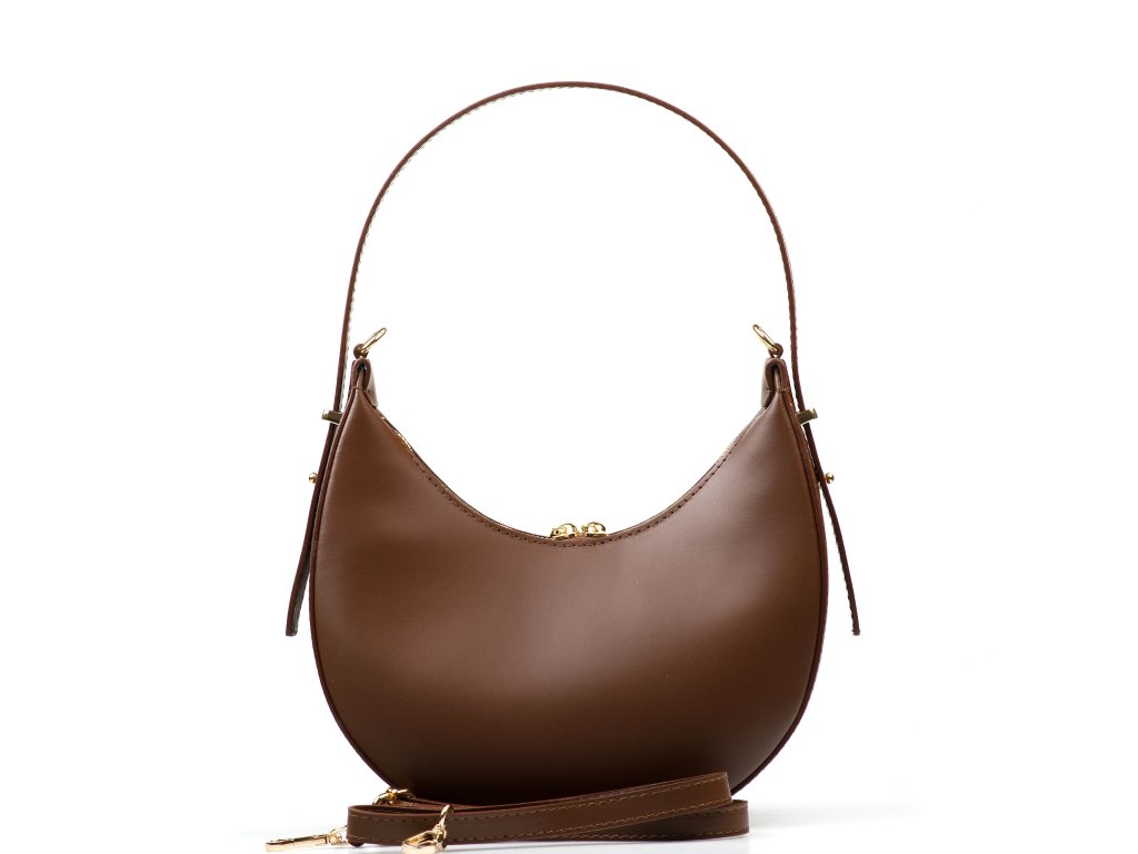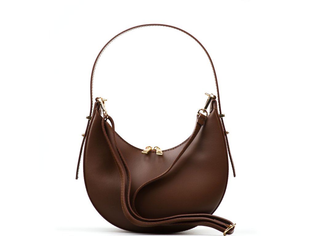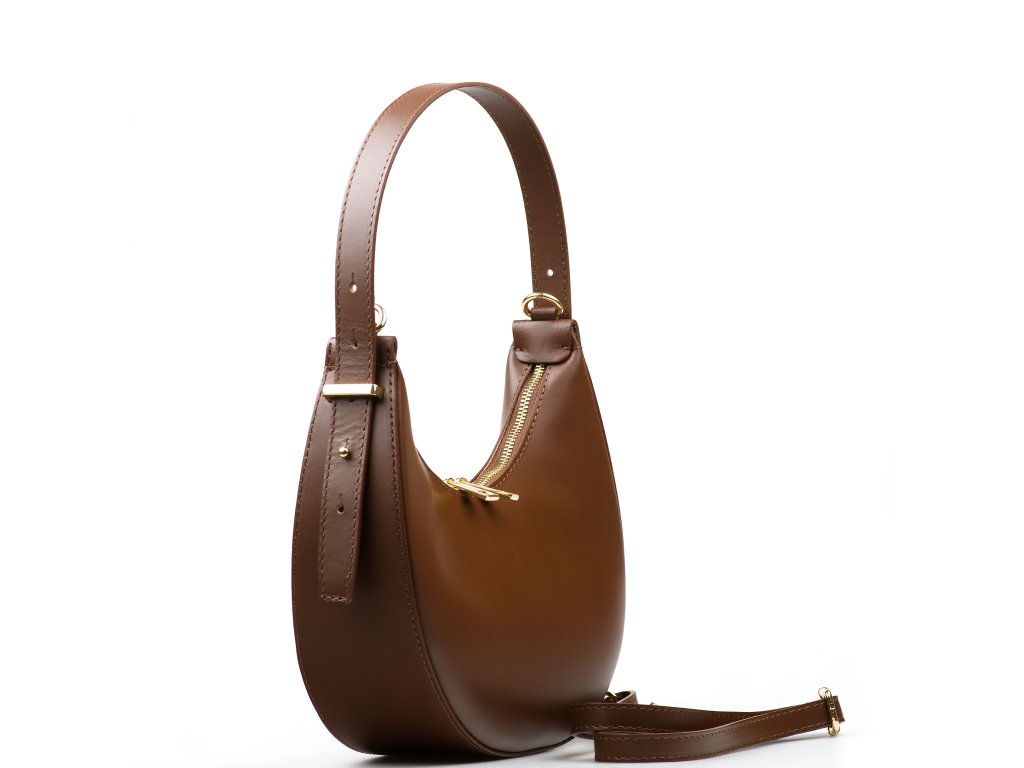 Kožená kabelka minimalistického stylu v hnědé barvě. Interiér kabelky disponuje jednou hlavní kapsou a jednou menší kapsou, jež je uzavíratelná na zip. Kabelka je zdobena zlatým kováním. Kabelku můžete nosit v ruce, přes rameno či jako crossbody. Kabelka je uzavíratelná zipem.