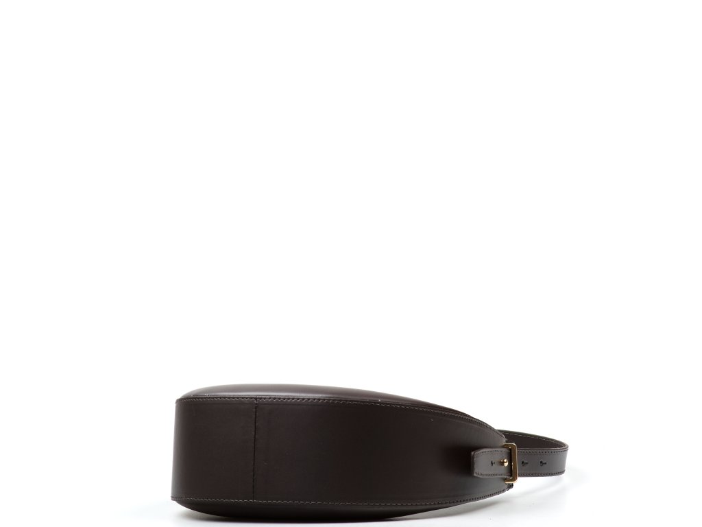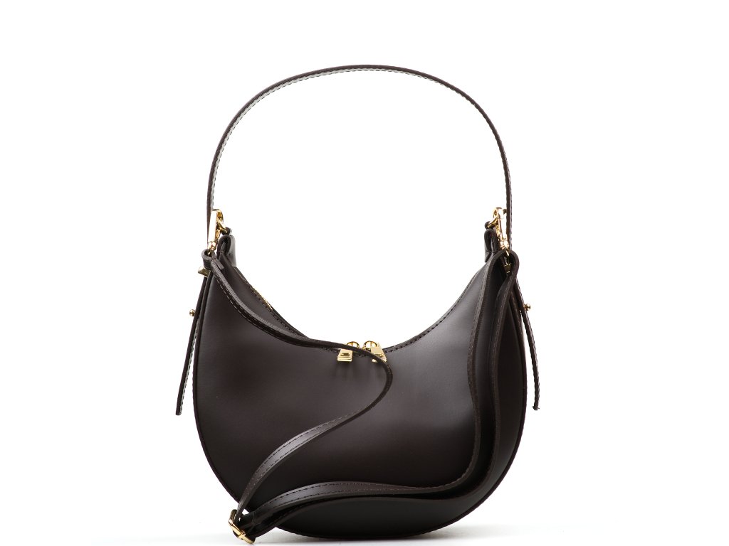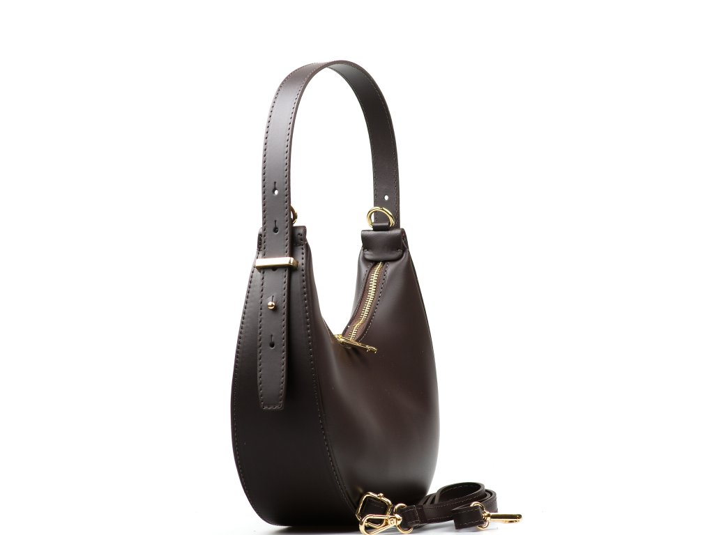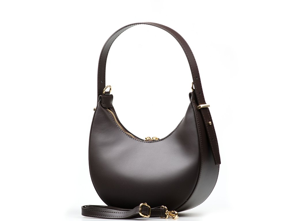 Kožená kabelka minimalistického stylu v tmavě hnědé barvě. Interiér kabelky disponuje jednou hlavní kapsou a jednou menší kapsou, jež je uzavíratelná na zip. Kabelka je zdobena zlatým kováním. Kabelku můžete nosit v ruce, přes rameno či jako crossbody. Kabelka je uzavíratelná zipem.