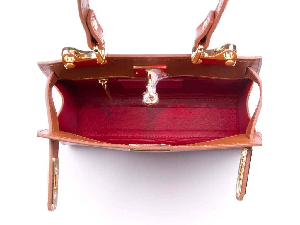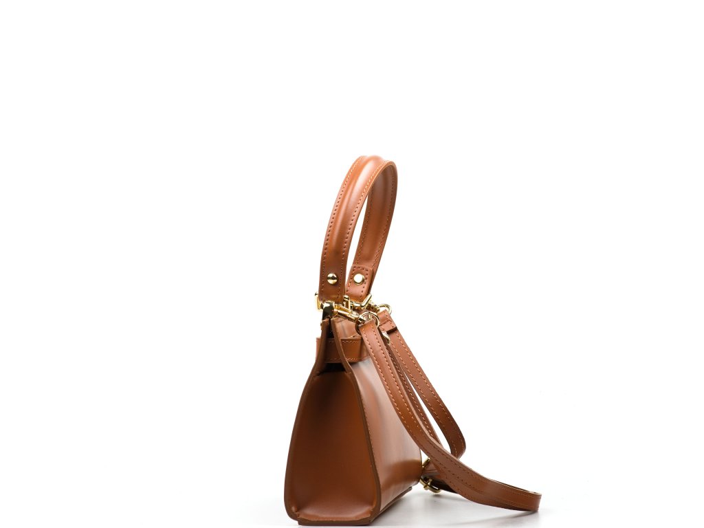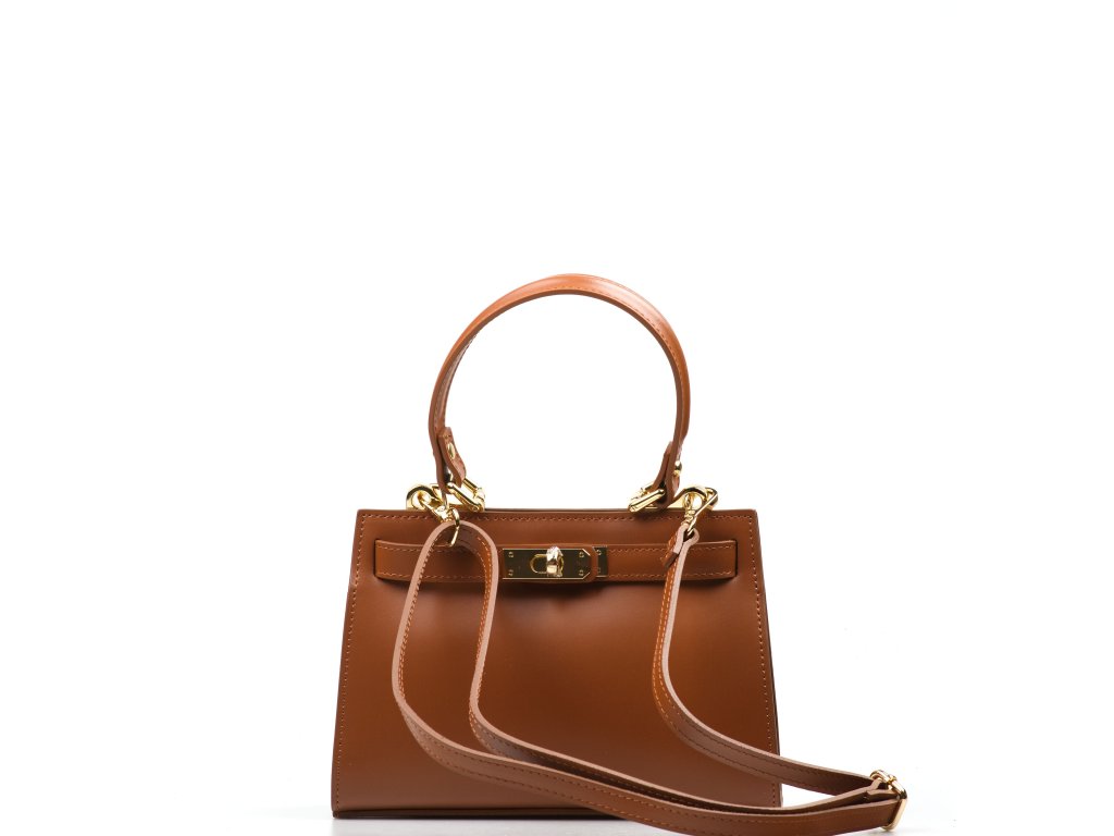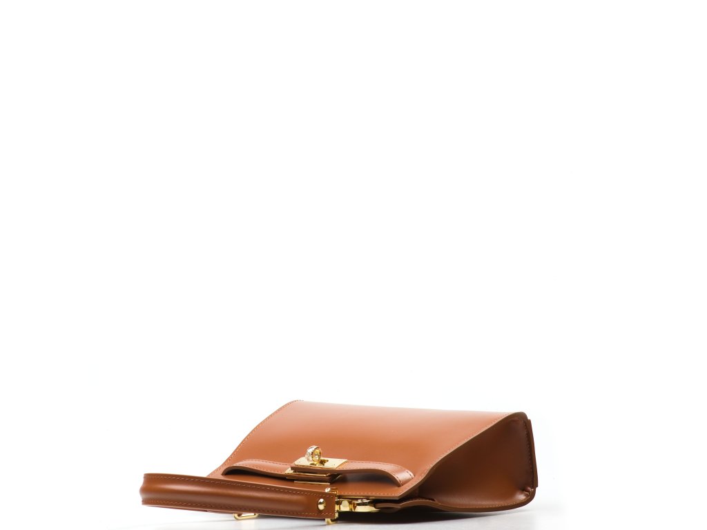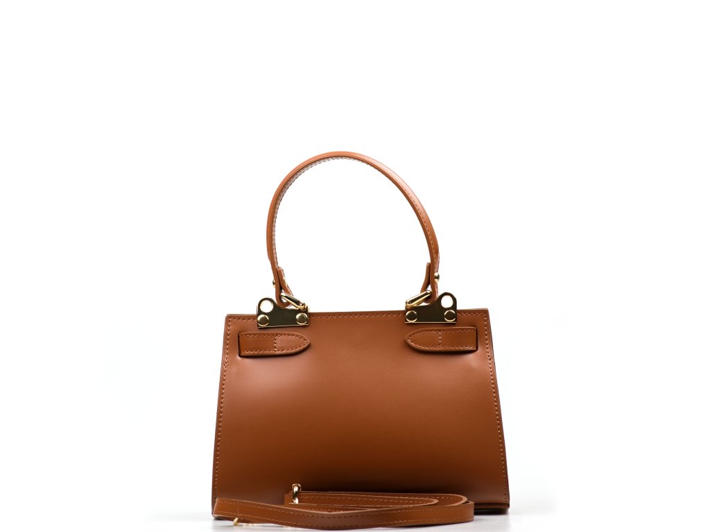 Minimalistická kožená kabelka v koňakově hnědé barvě v hladké kůži. Interiér kabelky disponuje jednou hlavní kapsou a jednou malou zadní, která je uzavíratelná zipem. Kabelku můžete nosit v ruce, přes tělo či přes rameno. Kabelku zdobí zlaté kování, kterým se kabelka zapíná. Kabelka je uzavíratelná klopou.