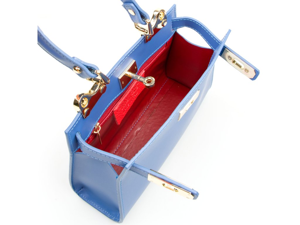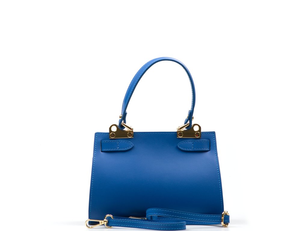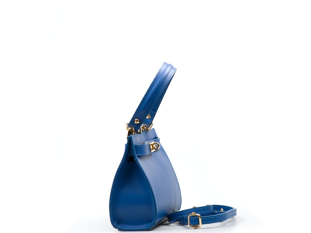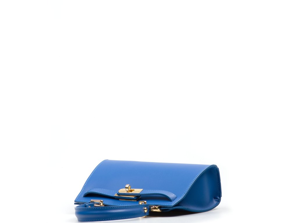 Minimalistická kožená kabelka v modré barvě v hladké kůži. Interiér kabelky disponuje jednou hlavní kapsou a jednou malou zadní, která je uzavíratelná zipem. Kabelku můžete nosit v ruce, přes tělo či přes rameno. Kabelku zdobí zlaté kování, kterým se kabelka zapíná. Kabelka je uzavíratelná klopou.
