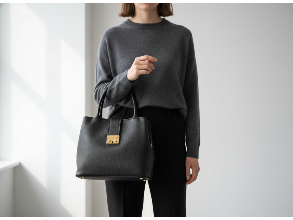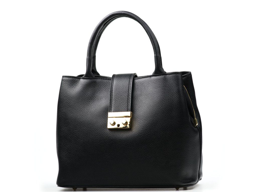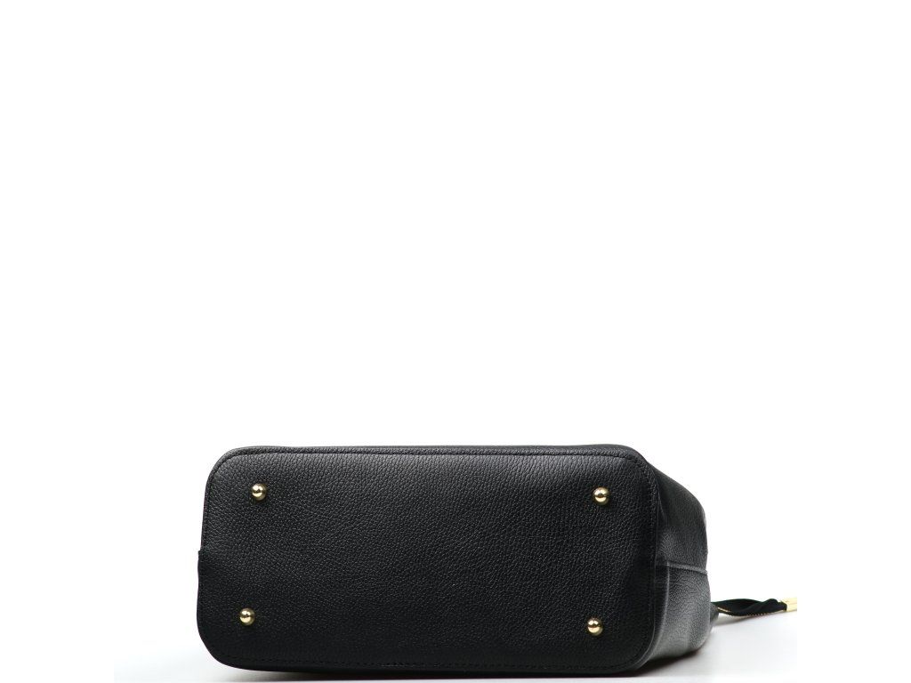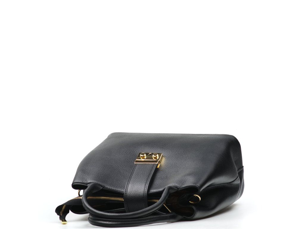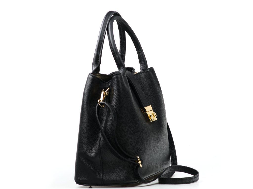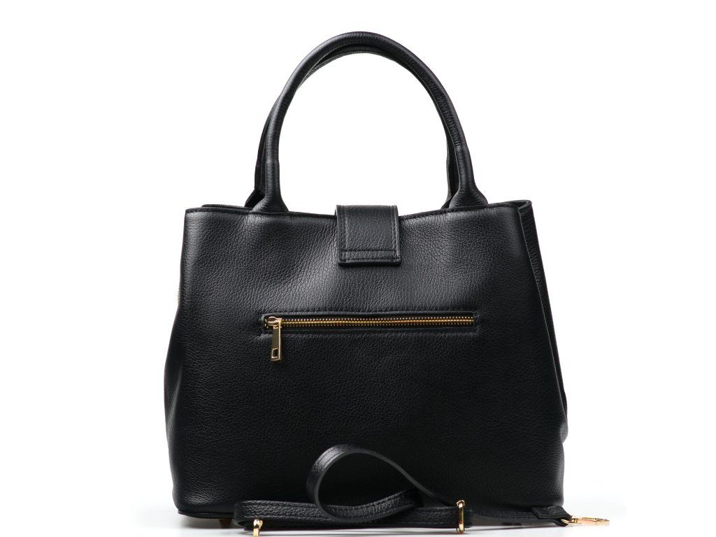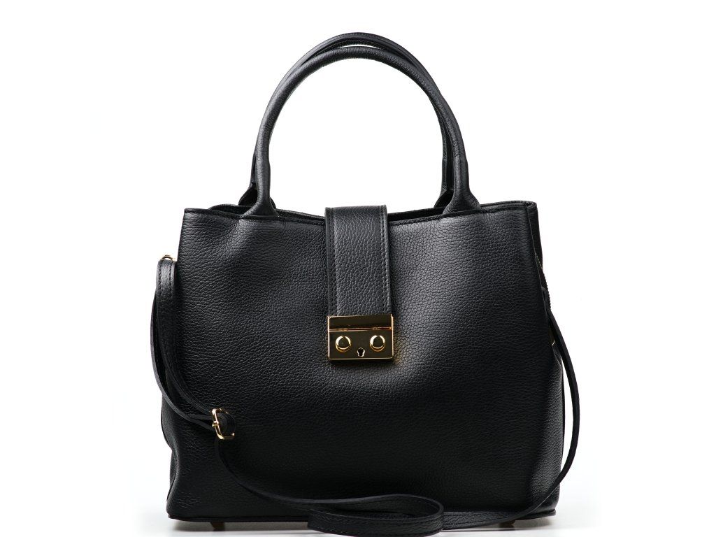 Kožená kabelka do ruky i přes rameno v černé barvě. Interiér kabelky disponuje třemi úložnými kapsami, přičemž jedna je uzavíratelná na zip a dvěma malými bočními. Součástí kabelky je přídavný popruh s karabinami s nastavitelnou délkou. Kabelku zdobí zlaté kování na klopě.