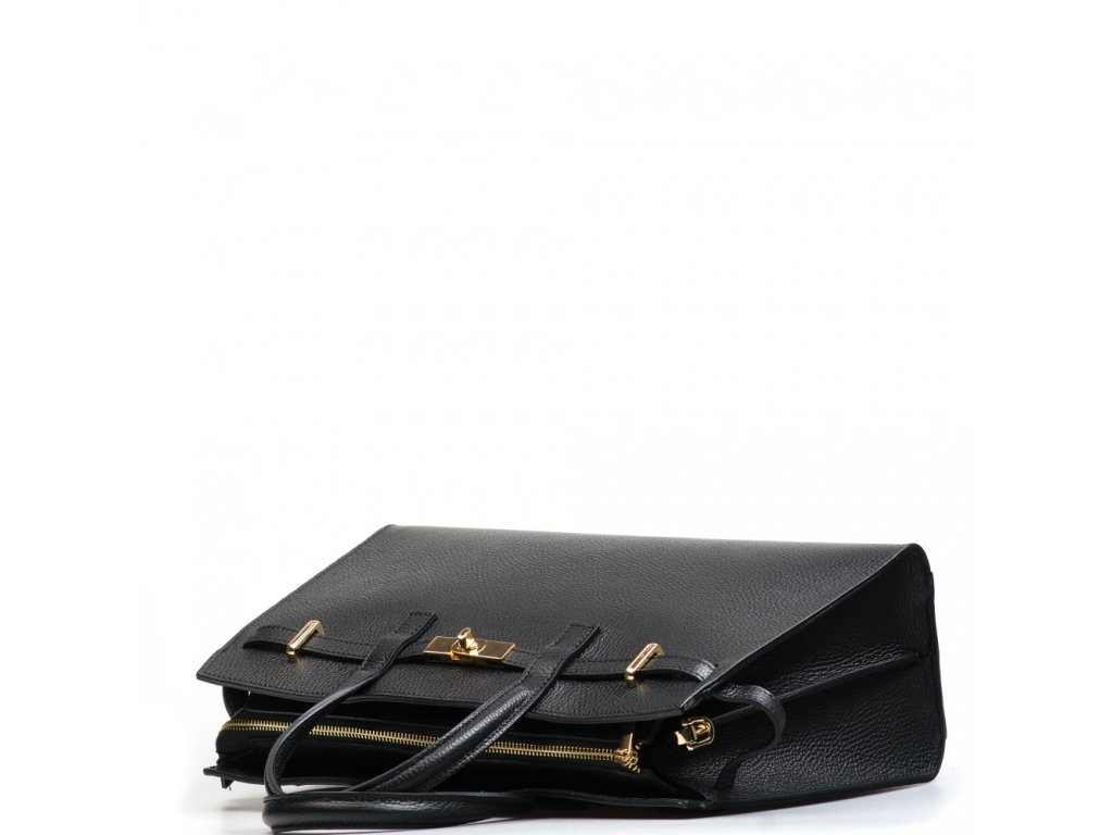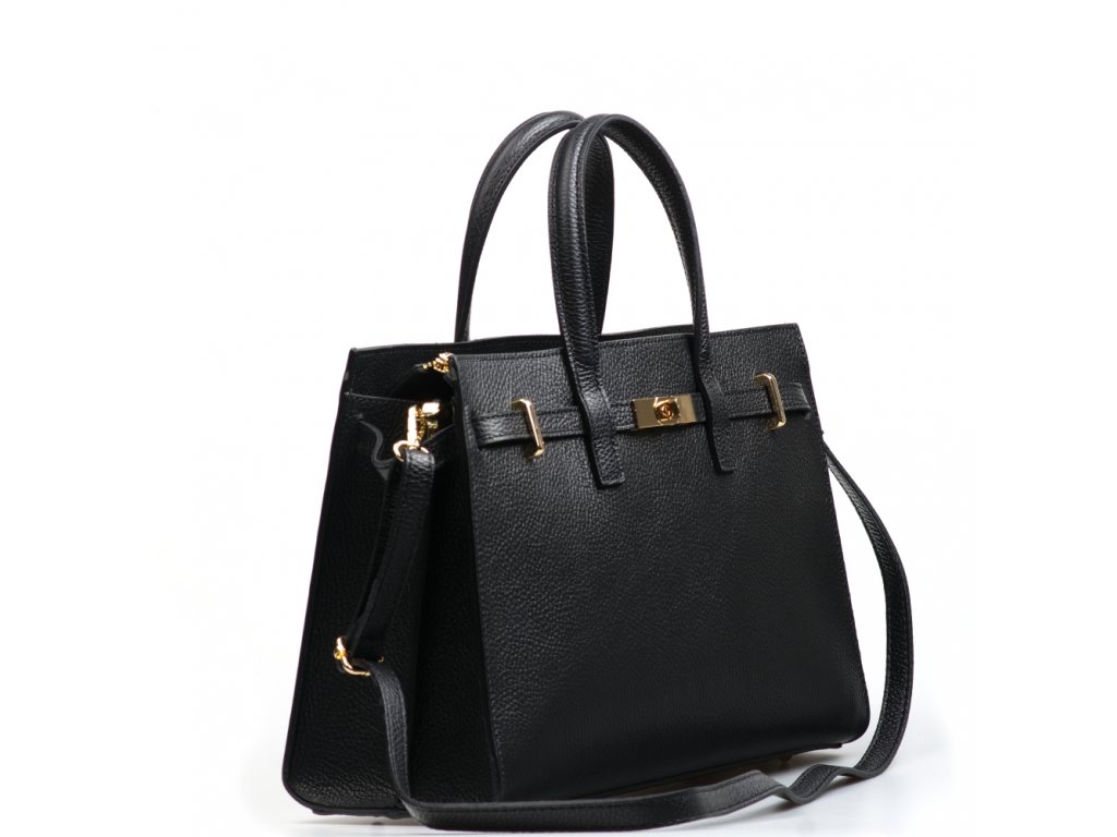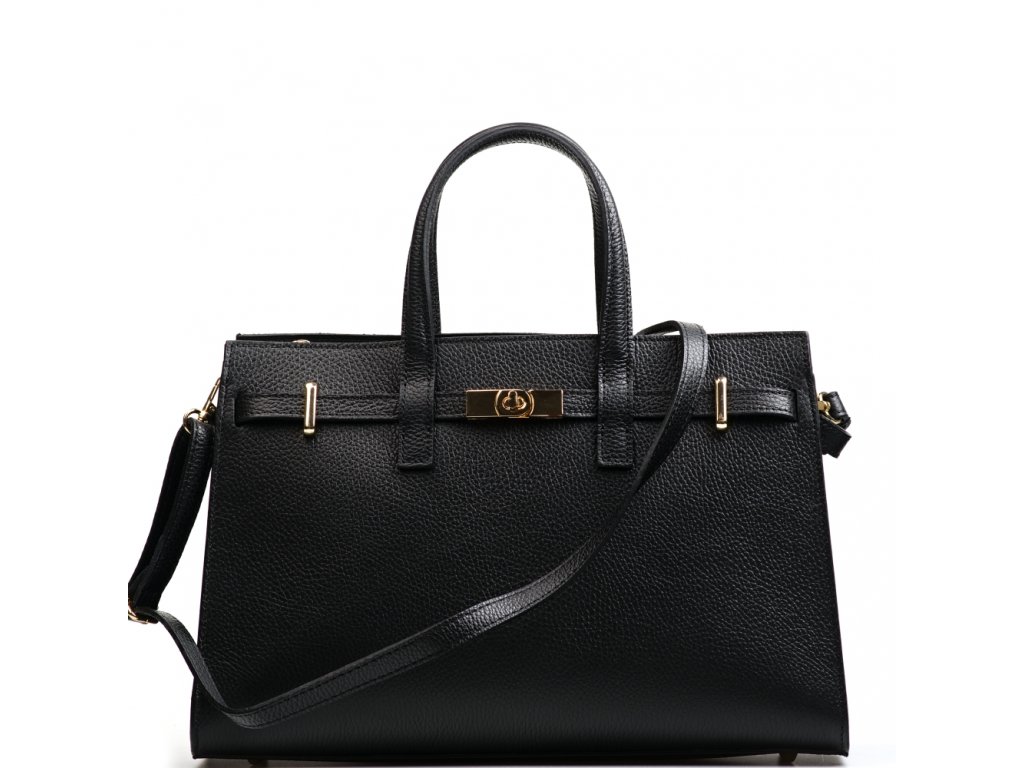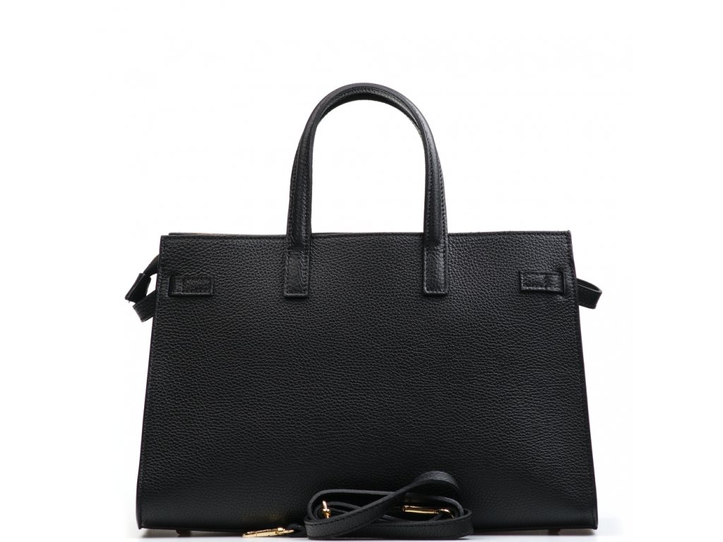 Kožená kabelka do ruky i přes rameno v černé barvě. Interiér kabelky disponuje třemi úložnými kapsami, přičemž jedna je uzavíratelná na zip a dvěma malými bočními. Součástí kabelky je přídavný popruh s karabinami s nastavitelnou délkou. Horní část kabelky zdobí kožený popruh se zlatými sponami.
