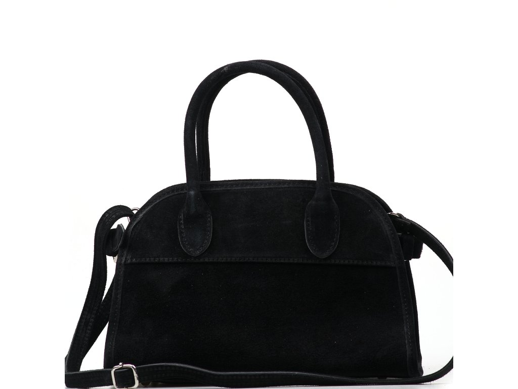 Kožená kabelka do ruky v černé barvě. Povrch kabelky má matnou semišovou úpravu, která podtrhuje její elegantní vzhled. Tvar je zaoblený, což zaručuje dostatek prostoru. Kabelka je zdobená kovovými detaily ve stříbrné barvě. Kabelka má k dispozici přídavný popruh pro nošení přes rameno. Interiér disponuje jednou velkou úložnou kapsou a malými po vnitřních bocích. Kabelka se uzavírá zipem.