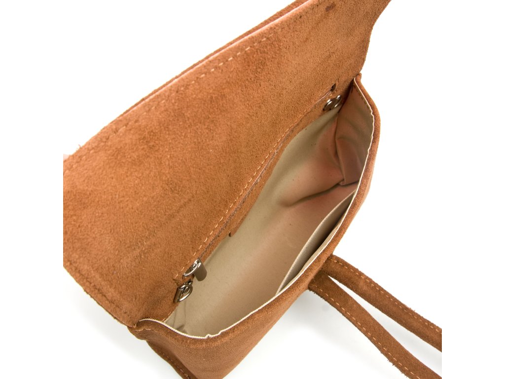 Dámská kožená kabelka v koňakově hnědé barvě. Minimalistická kabelka vyrobená z matné kůže. Součástí kabelky je přídavný popruh s karabinami, přičemž ji můžete nosit i jako psaníčko. Interiér disponuje jednou velkou a jednou malou úložnou kapsou.