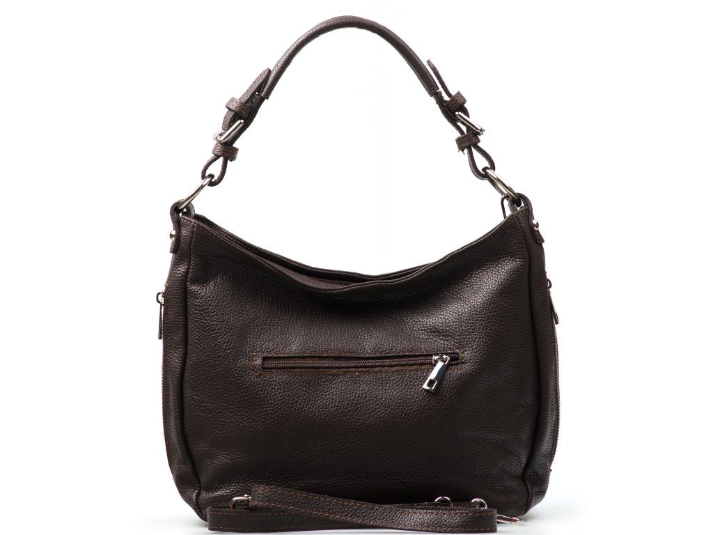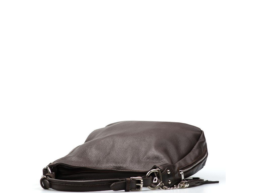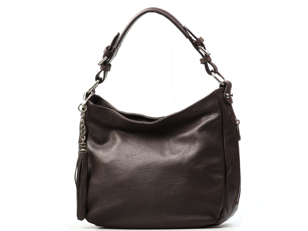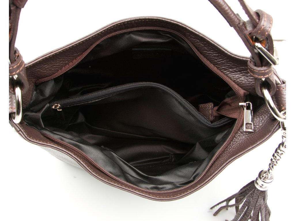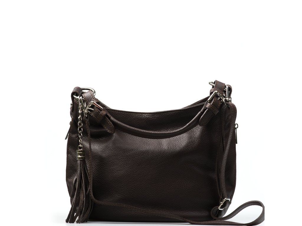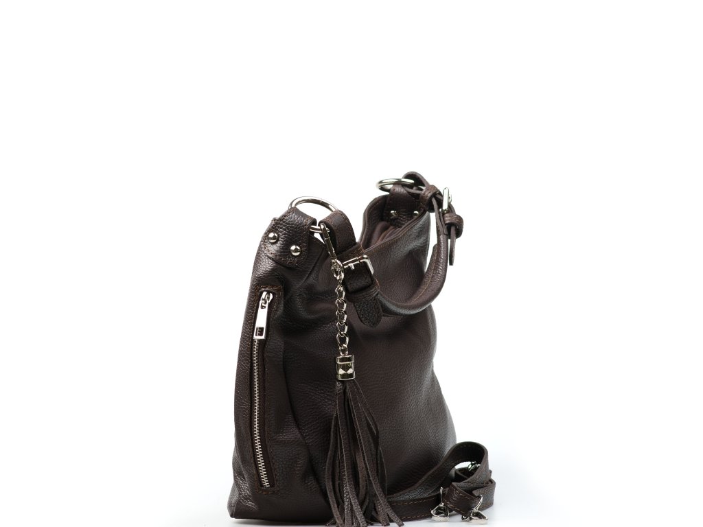 Kožená kabelka střední velikosti pro volný čas v hnědé barvě. Kabelka je zdobená odnímatelným střapcem na řetízku. Součástí kabelky je přídavný popruh s karabinami. Zadní strana kabelky má k dispozici úložnou kapsu na zip. Interiér kabelky má tři úložné kapsy, uprostřed na zip. Kabelka se uzavírá zipem.