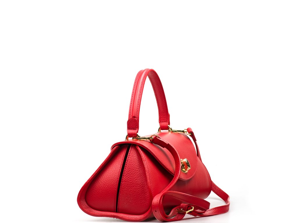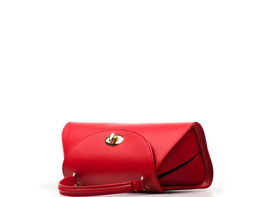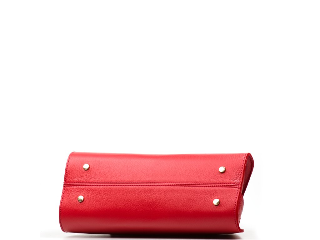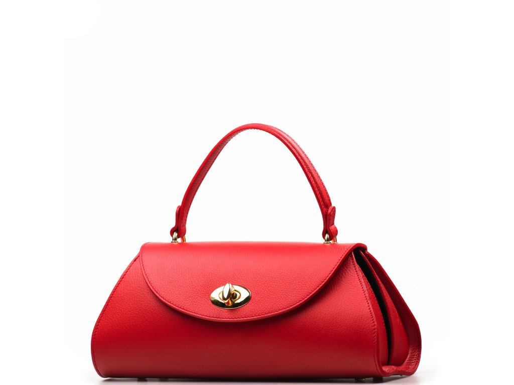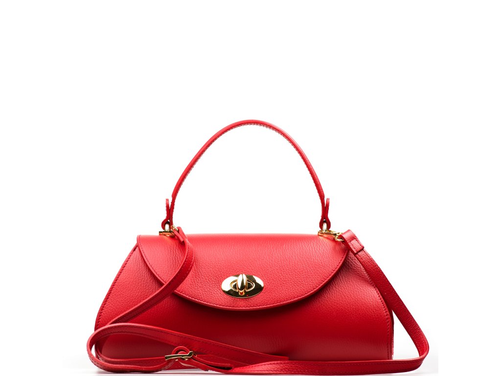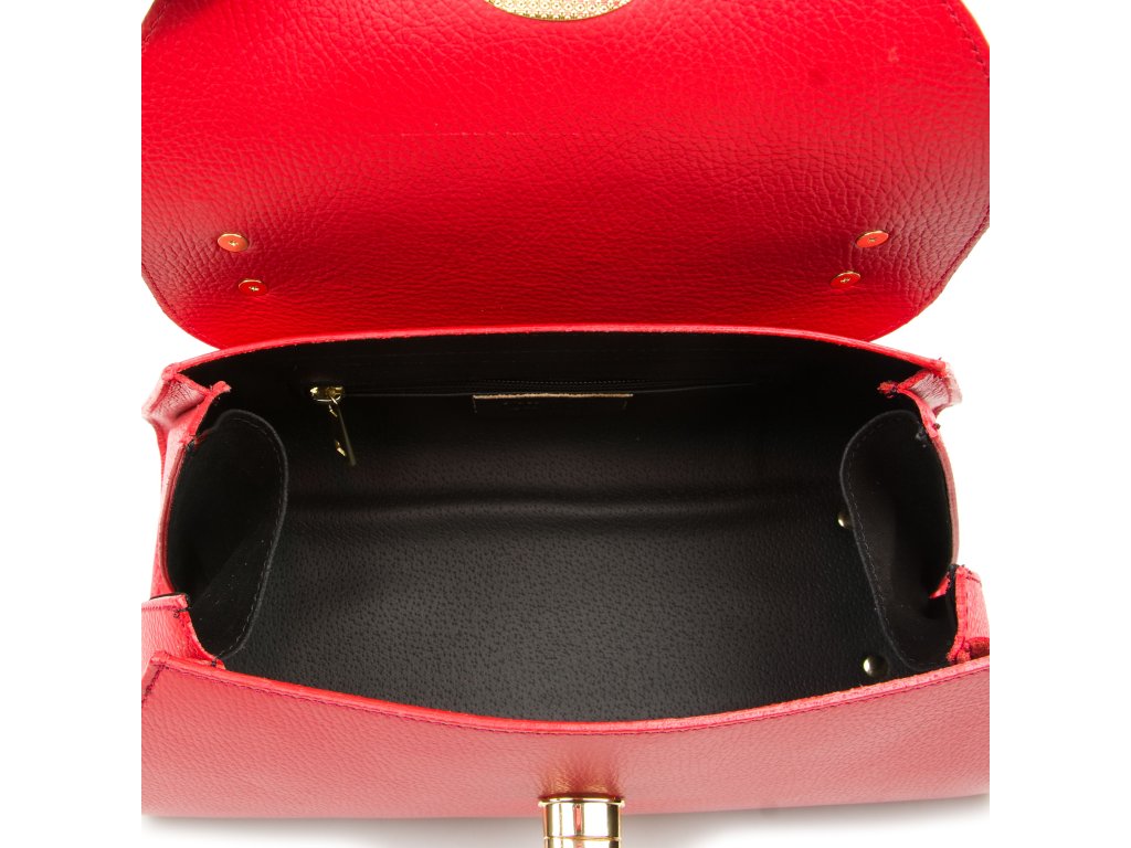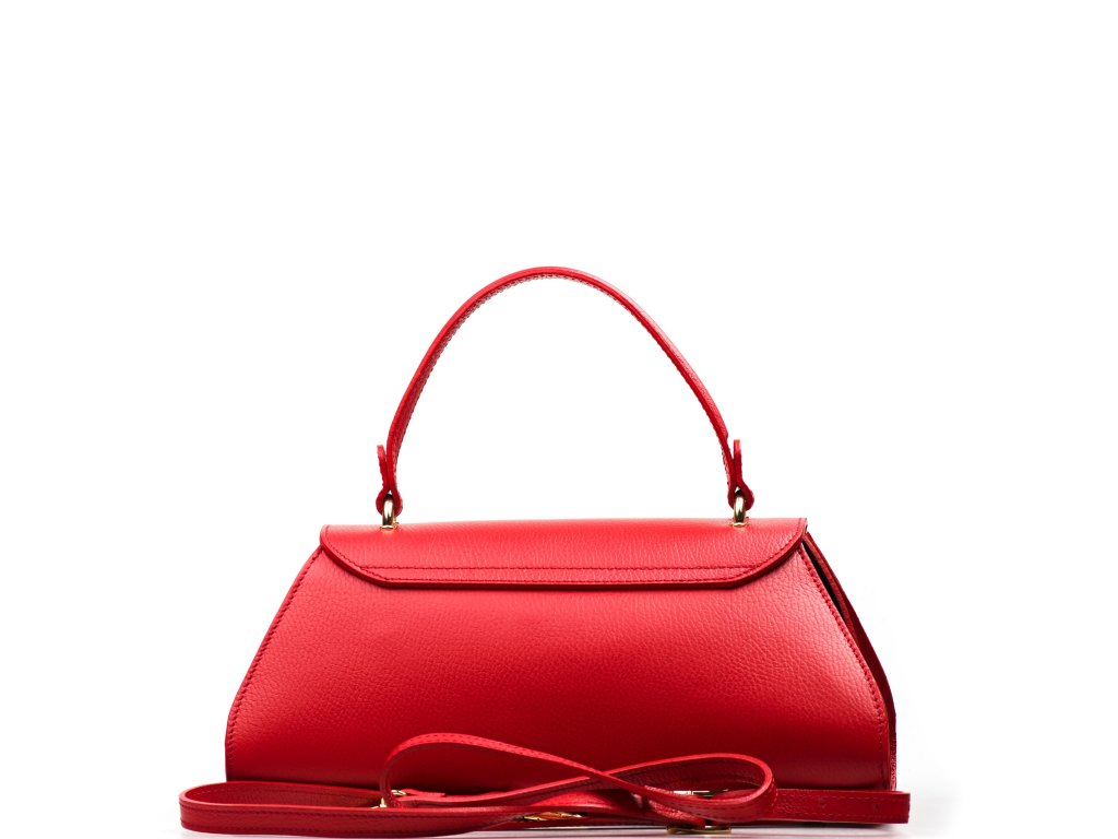 Kožená elegantní kabelka do ruky i přes rameno v červené barvě. Součástí kabelky je přídavný popruh s možností regulace délky. Interiér disponuje jednou velkou úložnou kapsou a malou boční na zip. Kabelka se uzavírá klopou.