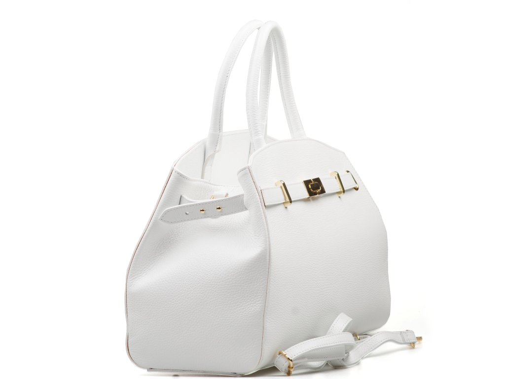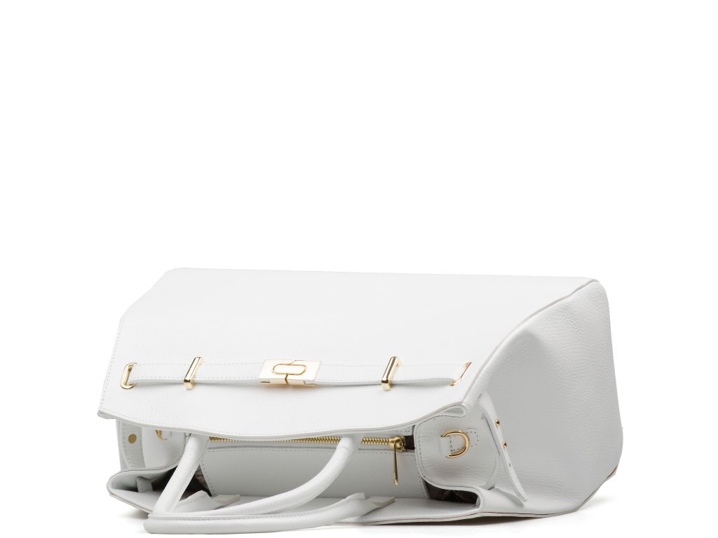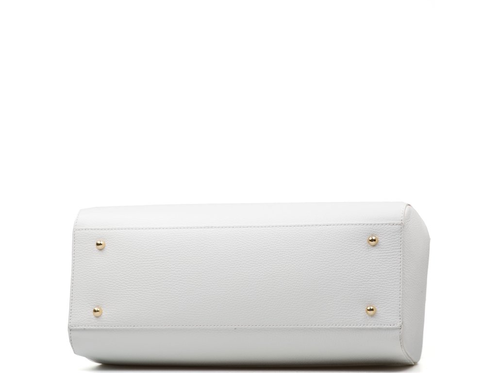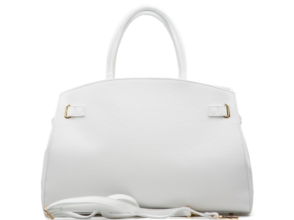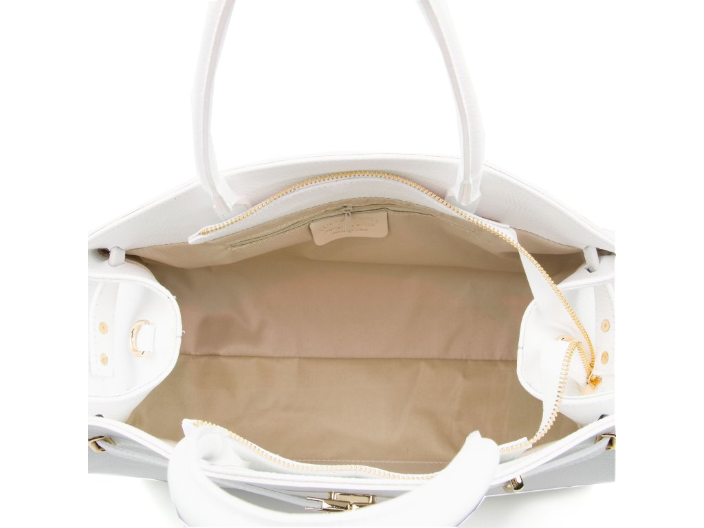 Kožená kabelka v bílé barvě je elegantním a nadčasovým doplňkem, který lze nosit v ruce i přes rameno. Interiér nabízí jednu prostornou hlavní kapsu a menší boční kapsu pro přehledné uložení drobností. Horní část kabelky zdobí kožený popruh se zlatými sponami, který podtrhuje její sofistikovaný vzhled. Uzavírání na zip zajišťuje, že všechny osobní věci zůstanou bezpečně uložené. Kabelka disponuje přídavným popruhem. Stylový a praktický kousek, který snadno doplní každý outfit.