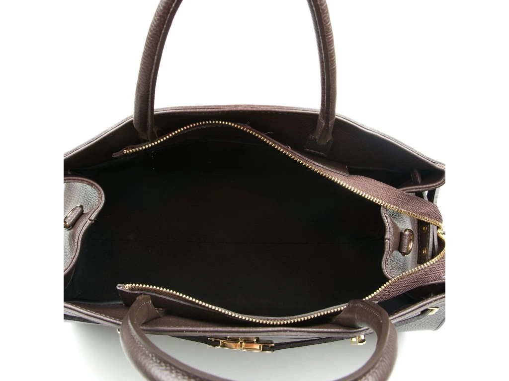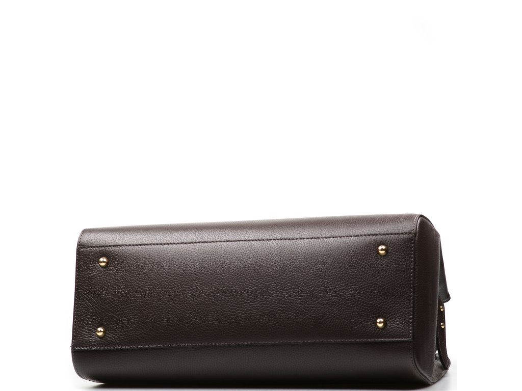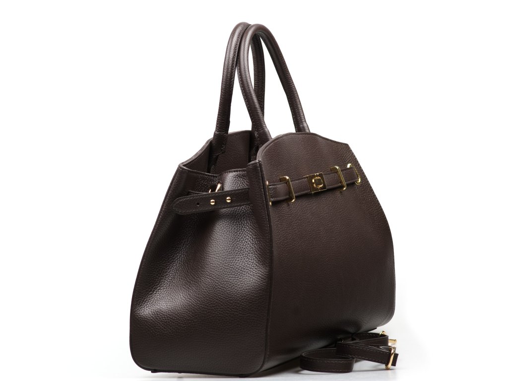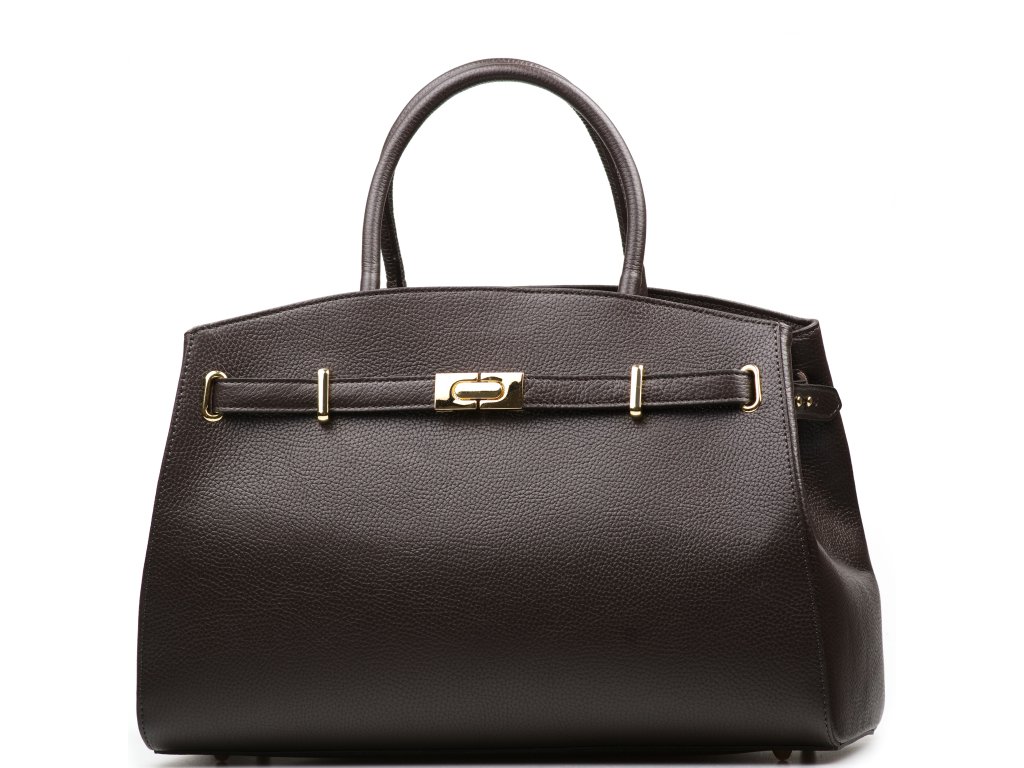 Kožená kabelka v tmavě hnědé barvě je elegantním a nadčasovým doplňkem, který lze nosit v ruce i přes rameno. Interiér nabízí jednu prostornou hlavní kapsu a menší boční kapsu pro přehledné uložení drobností. Horní část kabelky zdobí kožený popruh se zlatými sponami, který podtrhuje její sofistikovaný vzhled. Uzavírání na zip zajišťuje, že všechny osobní věci zůstanou bezpečně uložené. Kabelka disponuje přídavným popruhem. Stylový a praktický kousek, který snadno doplní každý outfit.