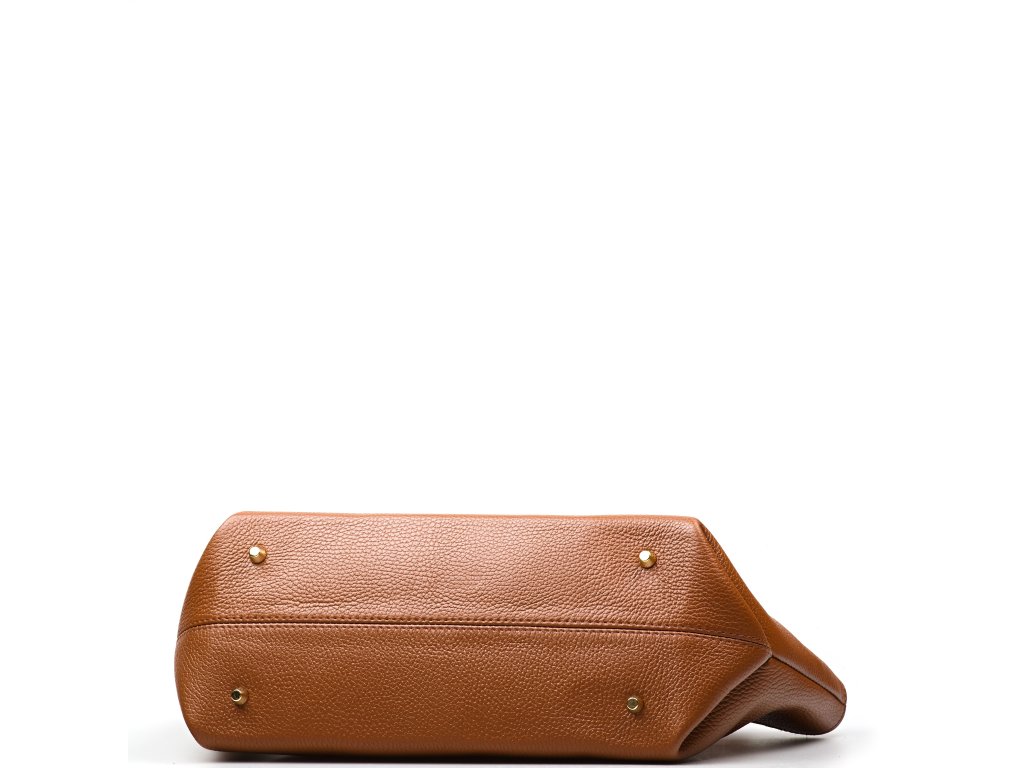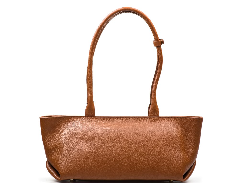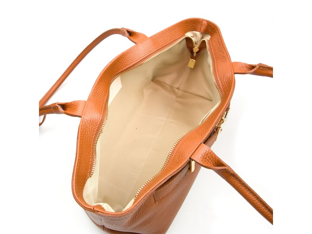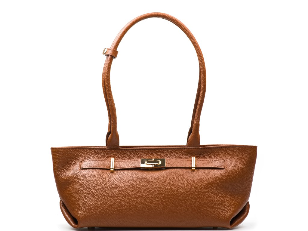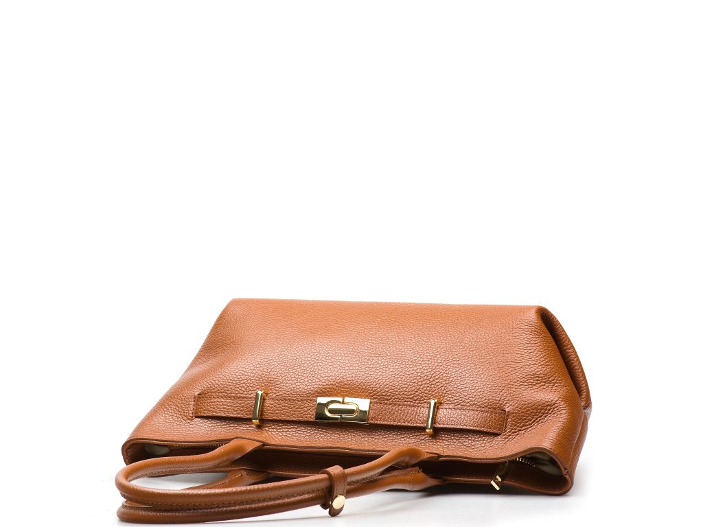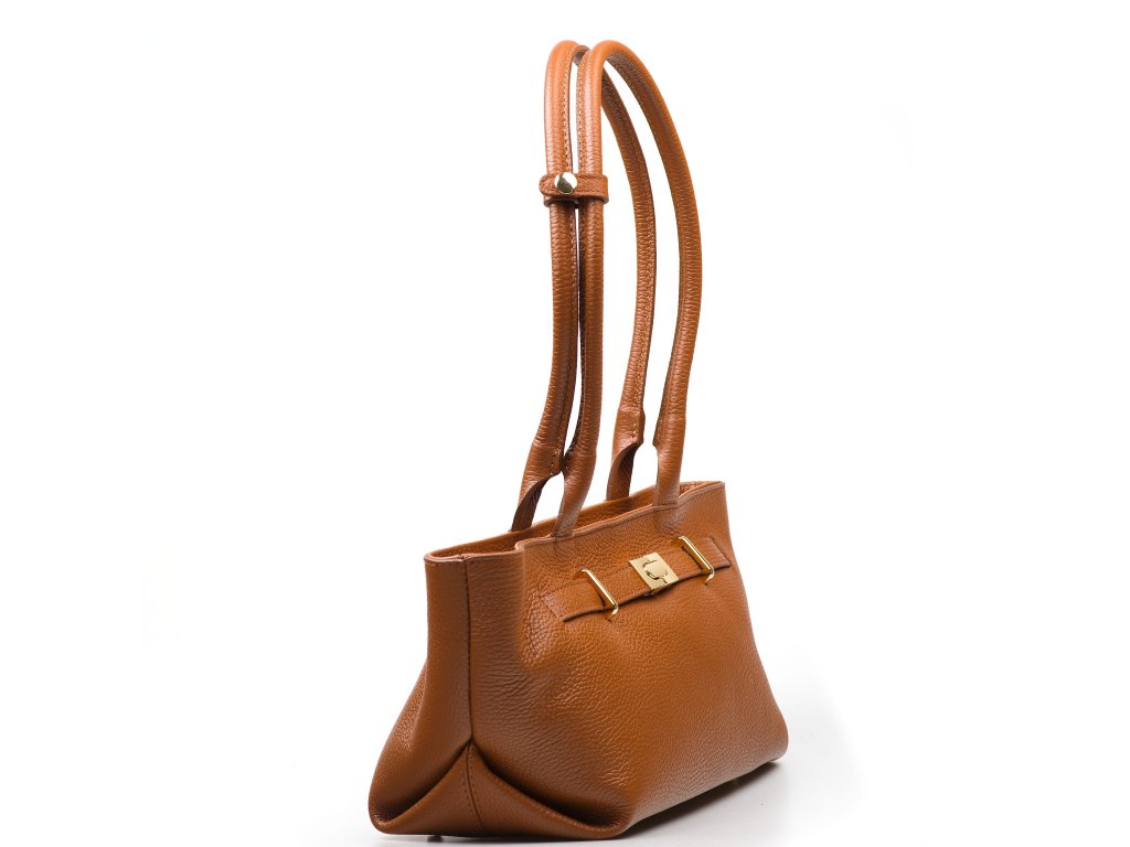 Kožená kabelka do ruky i přes rameno v koňakově hnědé barvě. Interiér kabelky disponuje jednou úložnou kapsou a jednou malou boční. Součástí kabelky je přídavný popruh s karabinami s nastavitelnou délkou. Horní část kabelky zdobí kožený popruh se zlatými sponami.
