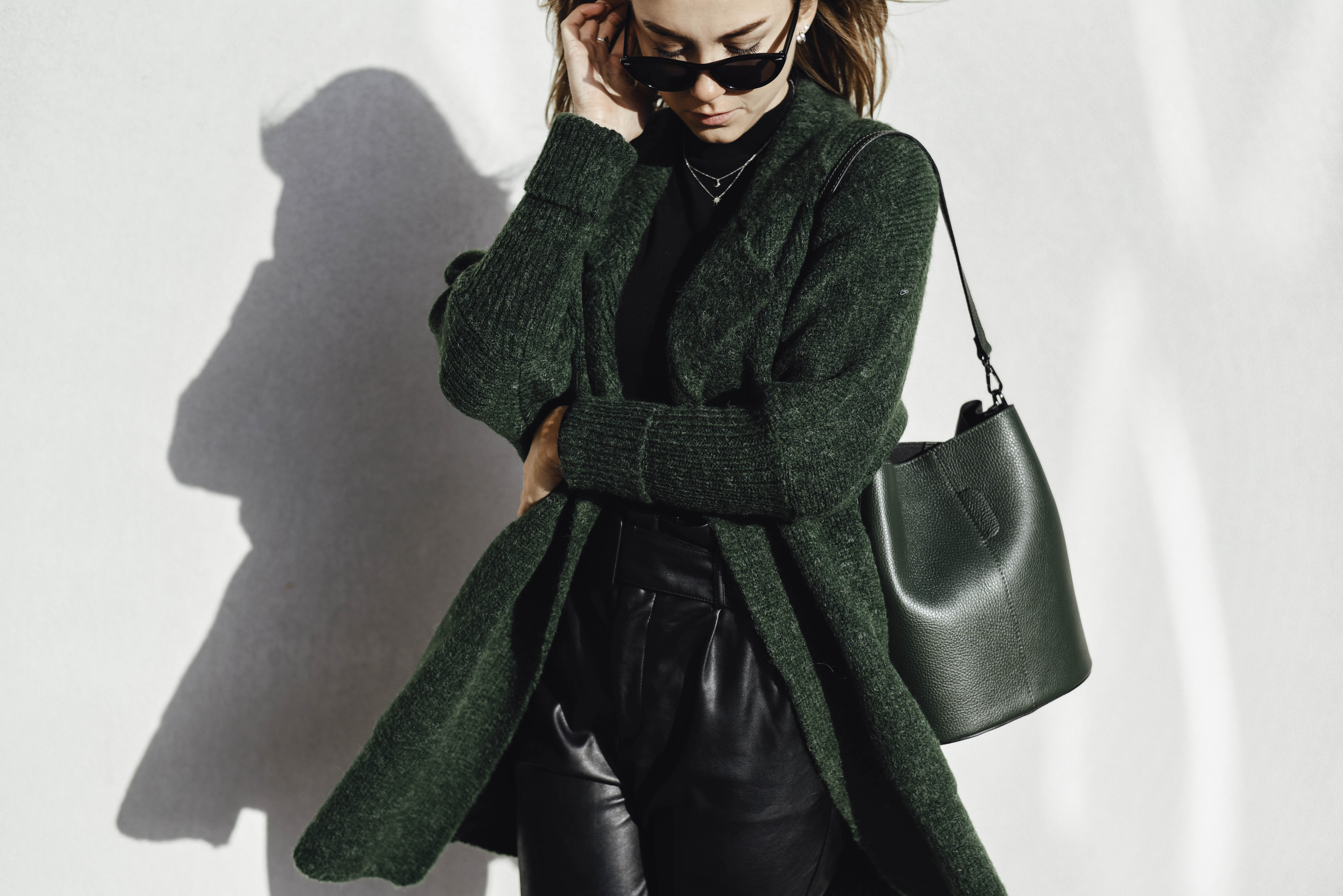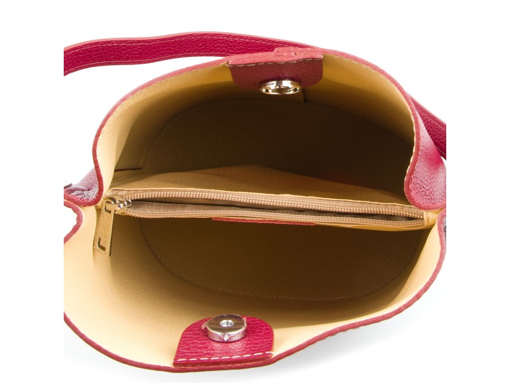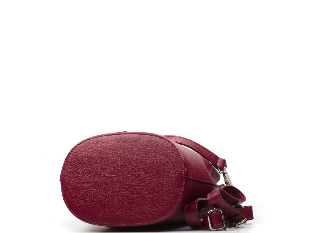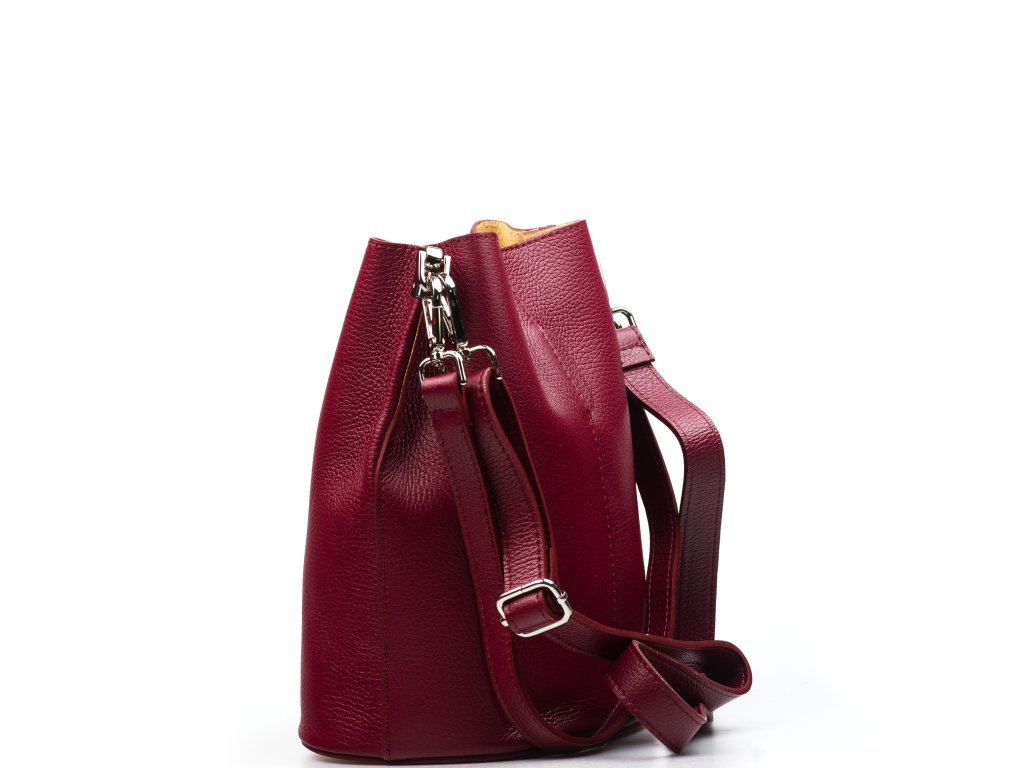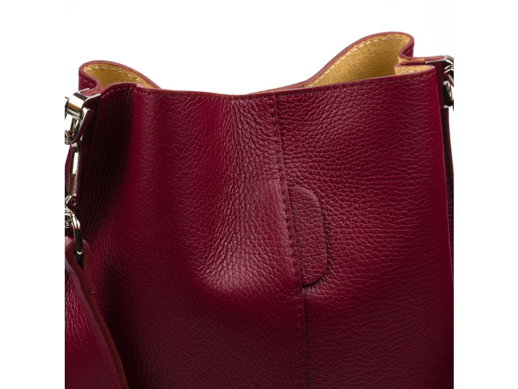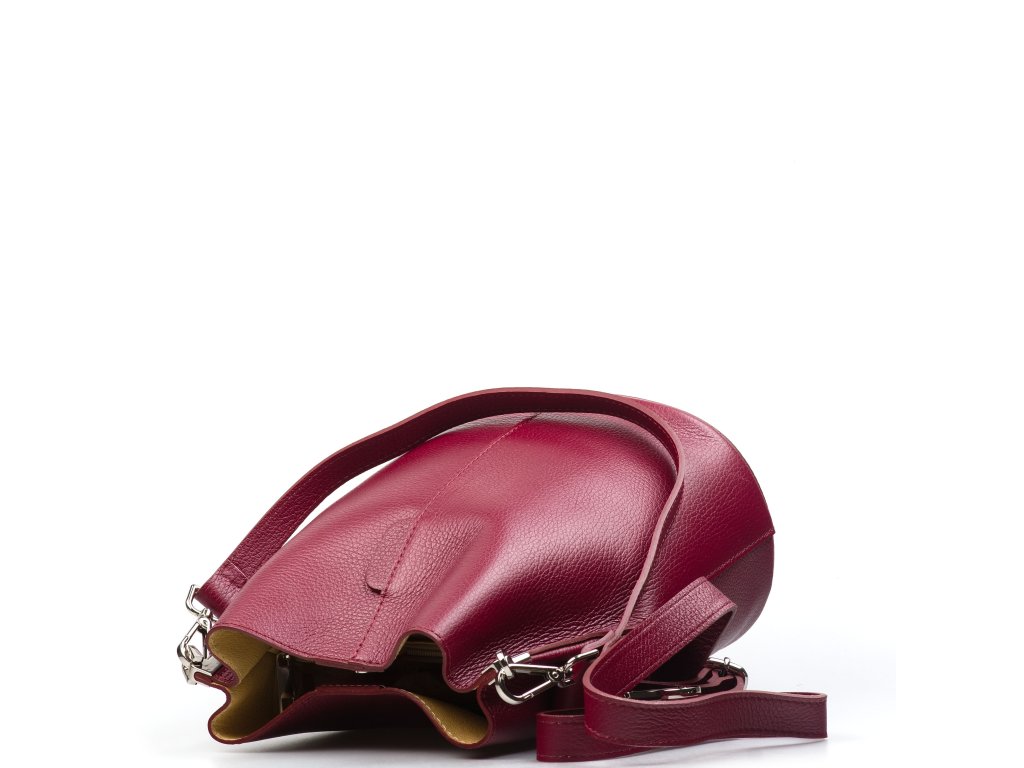 Módní kožená kabelka přes rameno ve tvaru pytlíku v bordó barvě. Součástí kabelky jsou dva odnímatelné popruhy s karabinami. Interiér kabelky má k dispozici tři úložné kapsy, uprostřed na zip. Kabelka se uzavírá cvočkem.