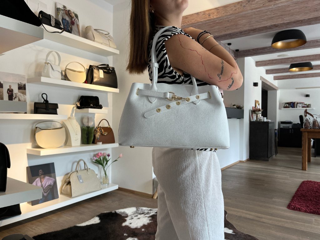 Kožená kabelka do ruky i přes rameno v bílé barvě. Interiér kabelky disponuje jednou úložnou kapsou a jednou malou boční. Součástí kabelky je přídavný popruh s karabinami s nastavitelnou délkou. Horní část kabelky zdobí kožený popruh se zlatými sponami.