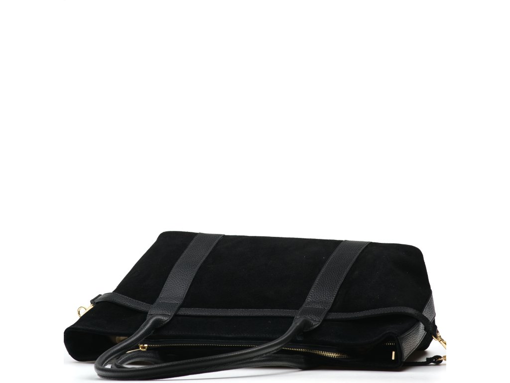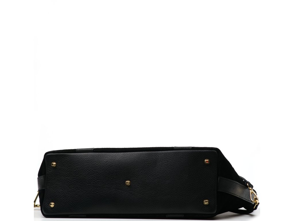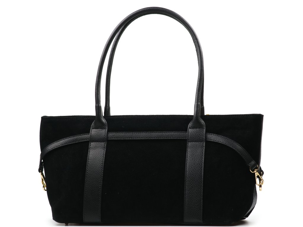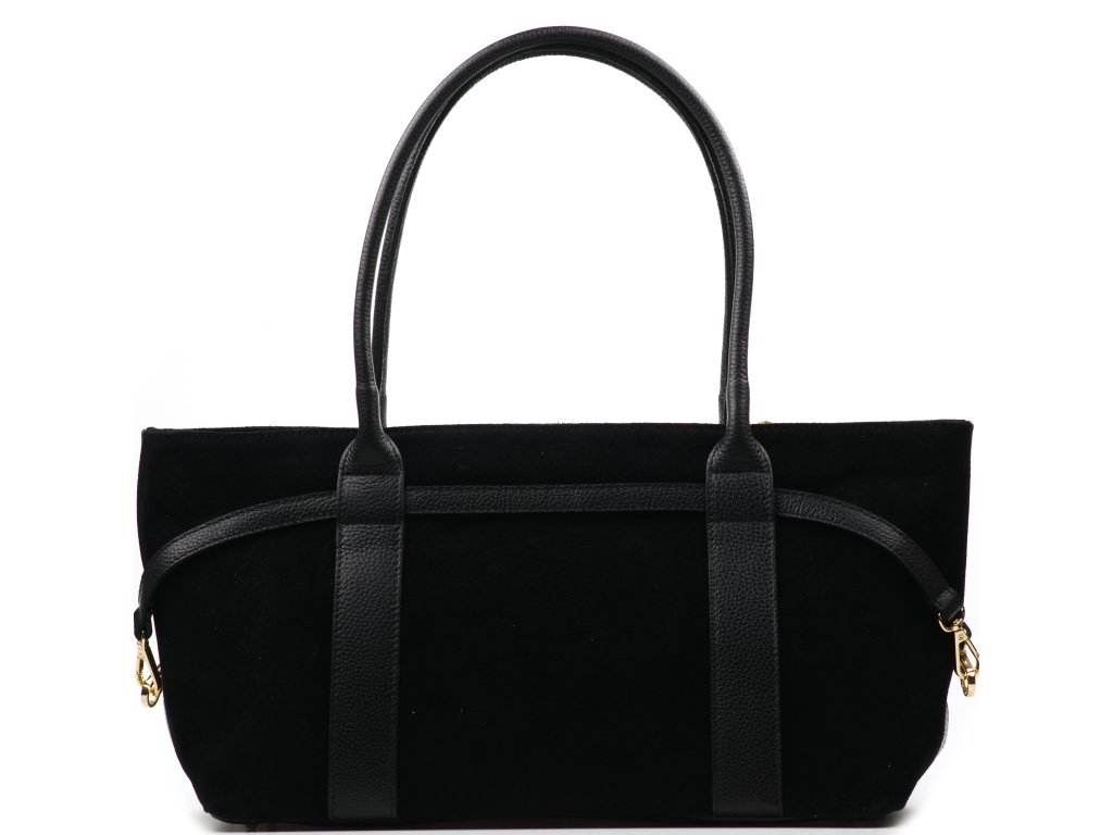 Elegantní semišová kožená kabelka v černé barvě je ztělesněním nadčasového stylu a sofistikovanosti. Její matný semišový povrch doplňuje jemné kožené zdobení, které podtrhuje její luxusní vzhled. Kabelku lze nosit v ruce nebo přes rameno. Interiér nabízí jednu prostornou hlavní kapsu a malé kapsy po bocích pro lepší uspořádání věcí. Uzavírá se zipem.