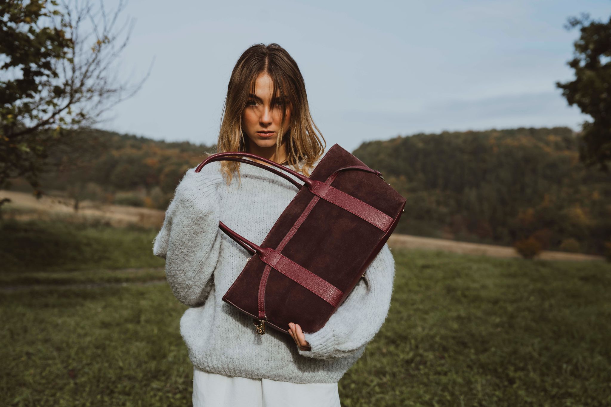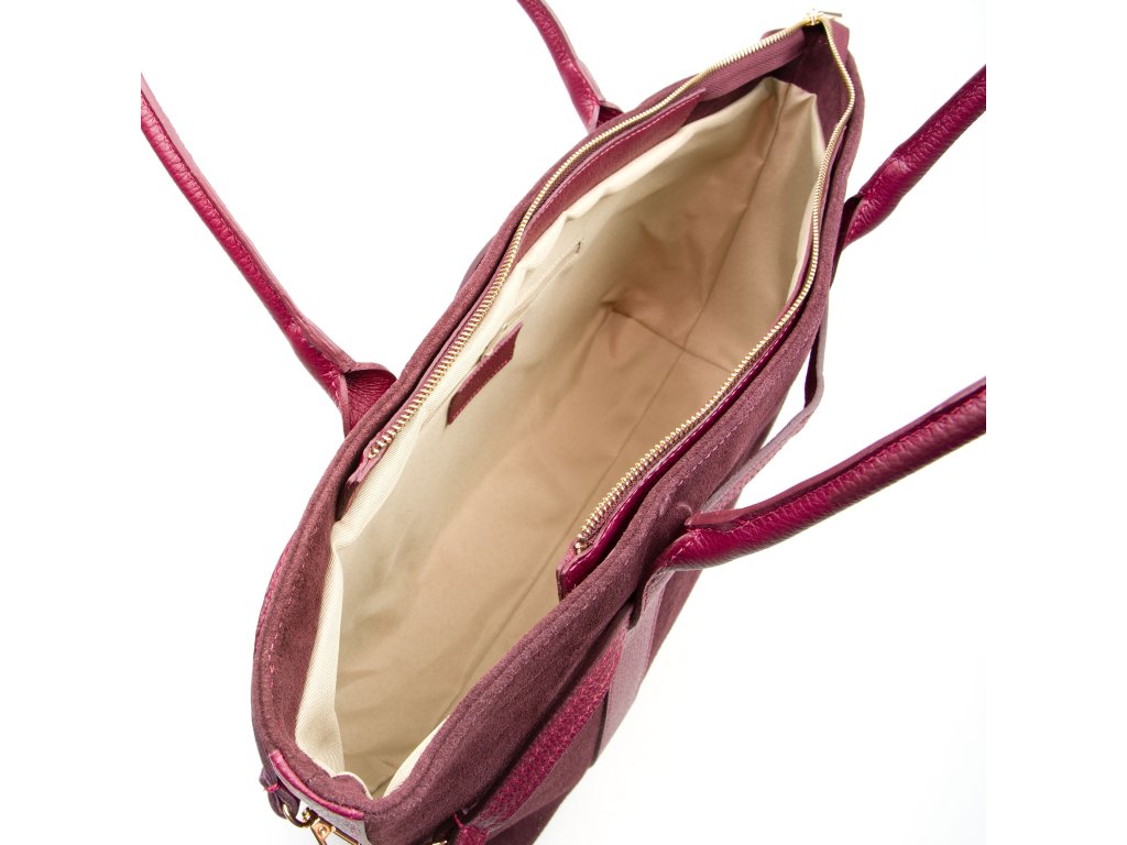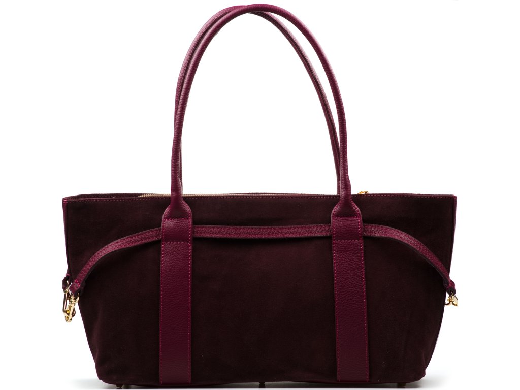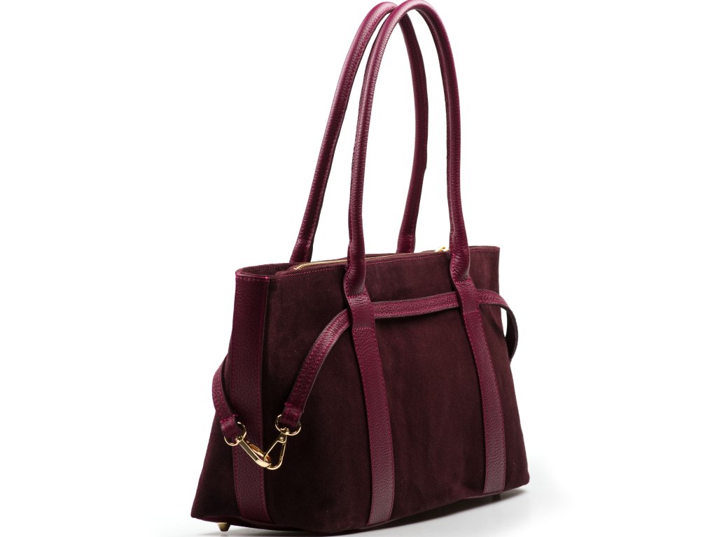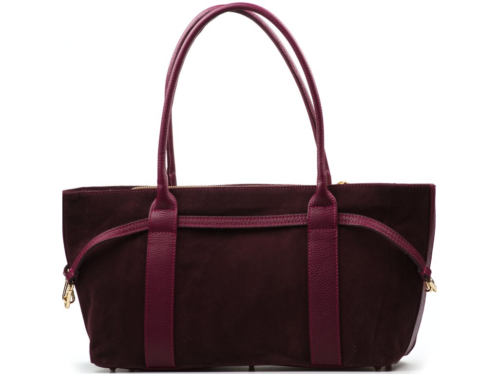 Elegantní semišová kožená kabelka ve vínově červené barvě je ztělesněním nadčasového stylu a sofistikovanosti. Její matný semišový povrch doplňuje jemné kožené zdobení, které podtrhuje její luxusní vzhled. Kabelku lze nosit v ruce nebo přes rameno. Interiér nabízí jednu prostornou hlavní kapsu a malé kapsy po bocích pro lepší uspořádání věcí. Uzavírá se zipem.