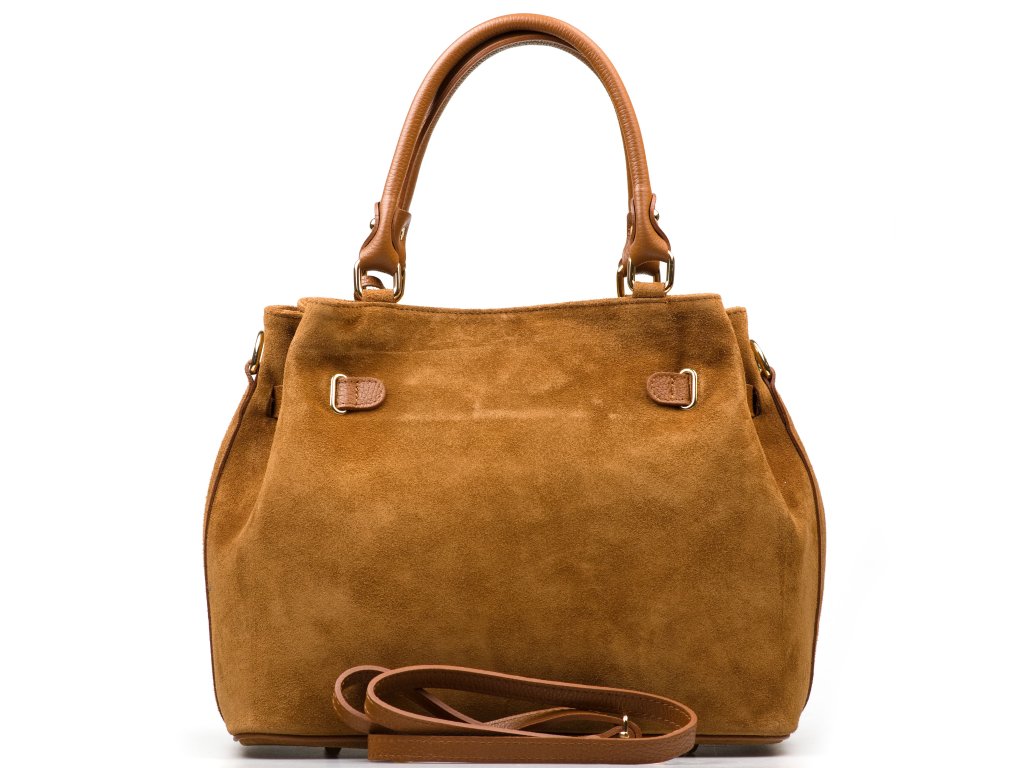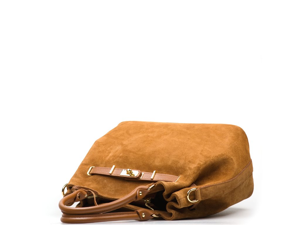 Semišová kabelka v koňakově hnědé barvě je elegantním a nadčasovým doplňkem, který lze nosit v ruce i přes rameno. Její interiér nabízí jednu prostornou hlavní kapsu a menší boční kapsu pro přehledné uložení drobností. Horní část kabelky zdobí kožený popruh se zlatými sponami a ozdobným zámkem, který dodává celkovému designu luxusní vzhled. Kabelka se uzavírá zipem, takže všechny tvé věci zůstanou bezpečně uložené. Stylový a praktický kousek, který dokonale doplní tvůj outfit.