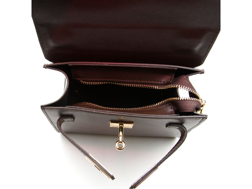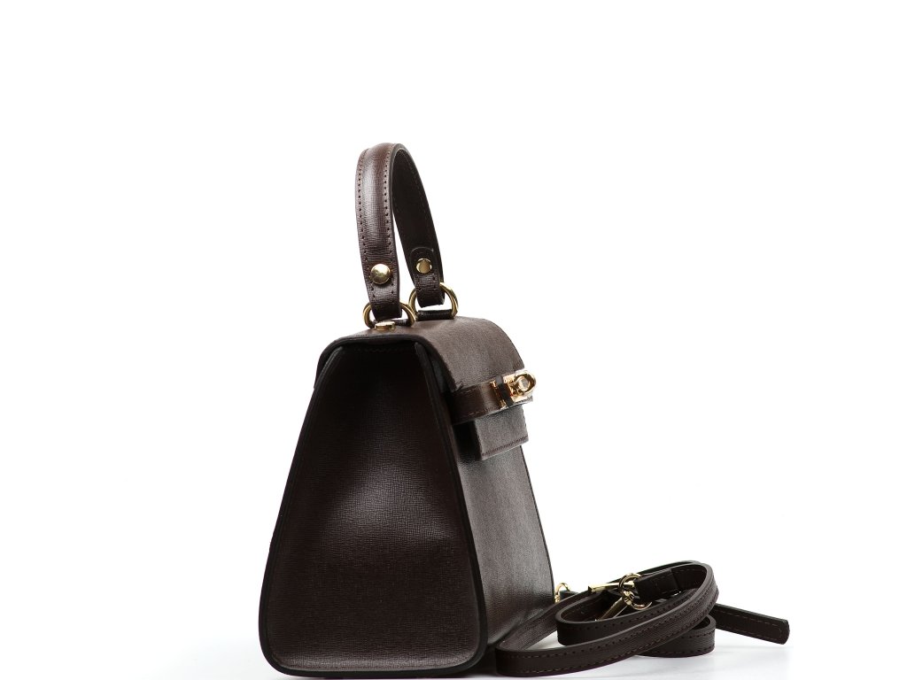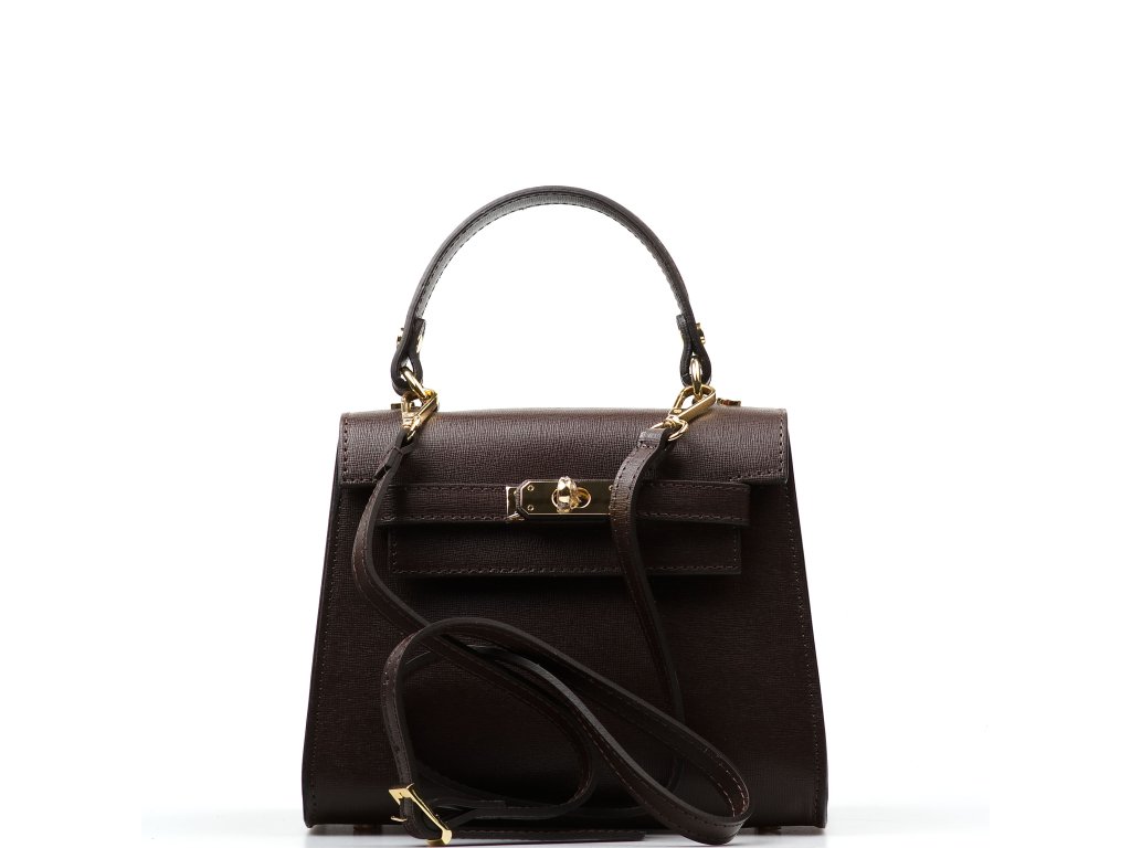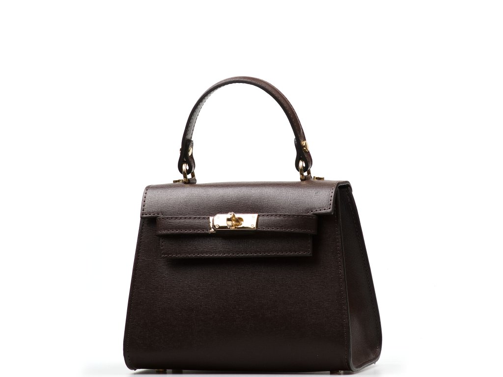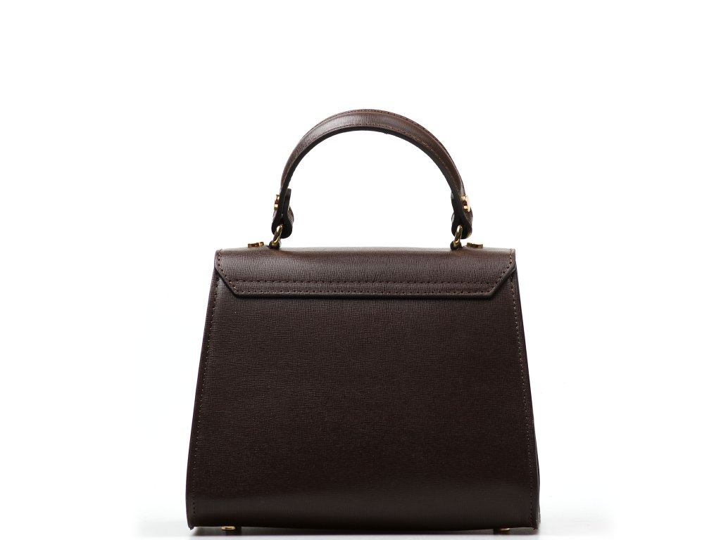 Minimalistická kožená kabelka v tmavě hnědé barvě. Interiér kabelky disponuje jednou hlavní kapsou a jednou malou zadní, která je uzavíratelná zipem. Kabelku můžete nosit v ruce či přes rameno. Kabelku zdobí zlaté kování, kterým se kabelka zapíná. Kabelka je uzavíratelná zipem a klopou.