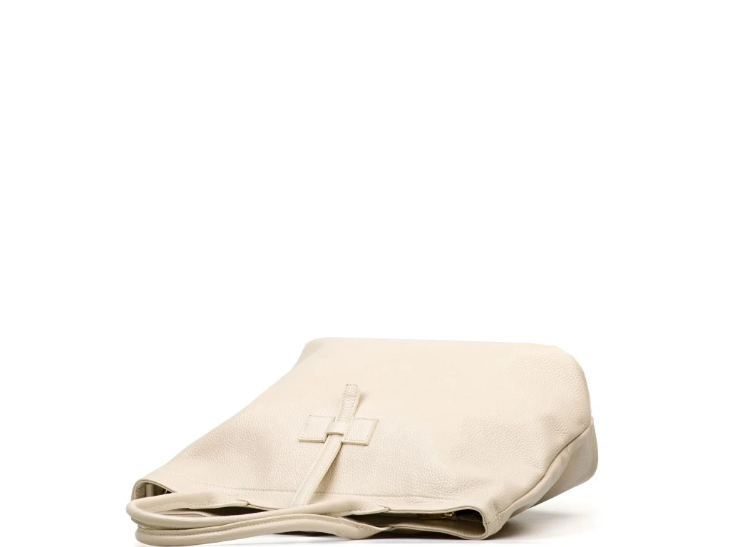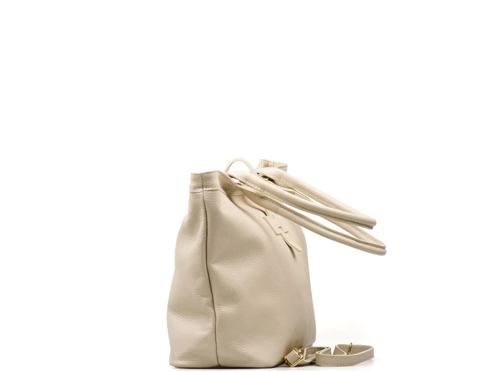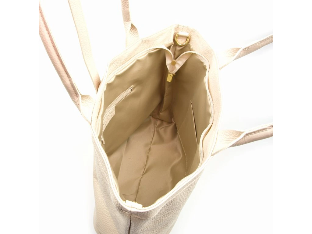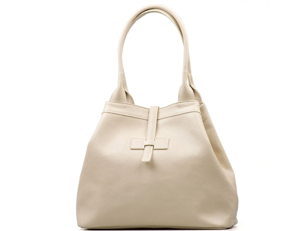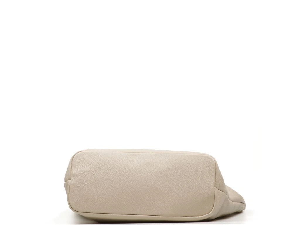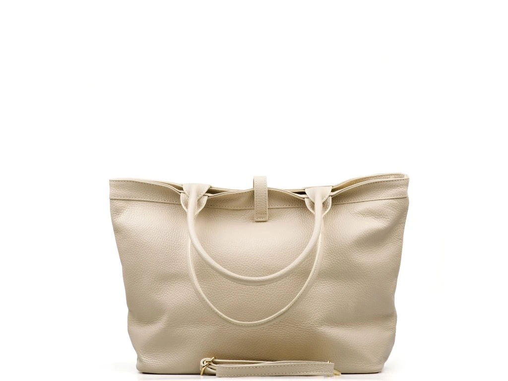 Kožená shopper kabelka do ruky i přes rameno v béžové barvě. Díky vnitřnímu zapínání karabinou je možné kabelku nosit ve čtvercovém provedení nebo sepnutou. Součástí kabelky je přídavný popruh s karabinami. Interiér kabelky má k dispozici jednu hlavní úložnou kapsu a malé po bocích. Kabelka se uzavírá zipem a koženým páskem.