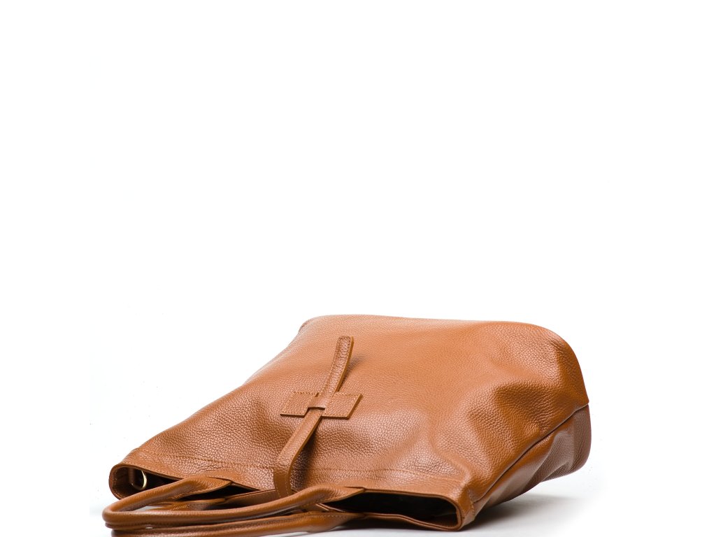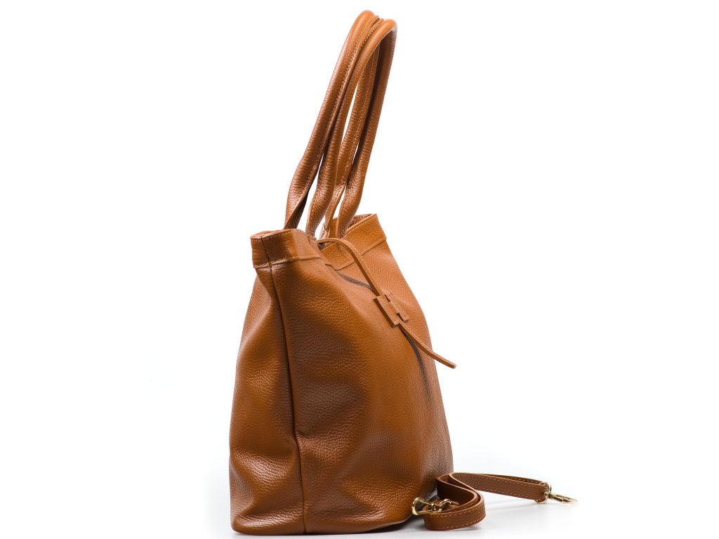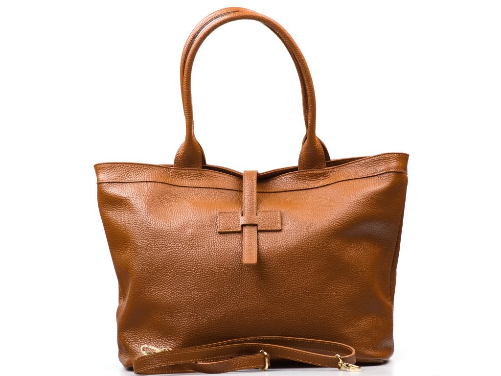 Kožená shopper kabelka do ruky i přes rameno v koňakově hnědé barvě. Díky vnitřnímu zapínání karabinou je možné kabelku nosit ve čtvercovém provedení nebo sepnutou. Součástí kabelky je přídavný popruh s karabinami. Interiér kabelky má k dispozici jednu hlavní úložnou kapsu a malé po bocích. Kabelka se uzavírá zipem a koženým páskem.