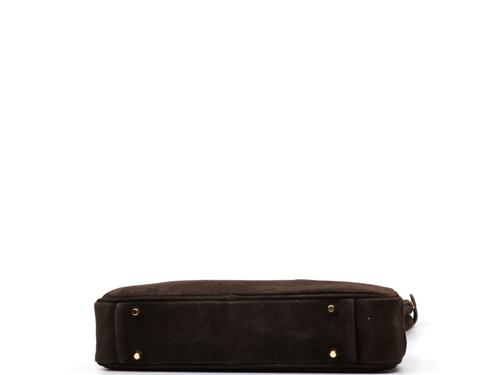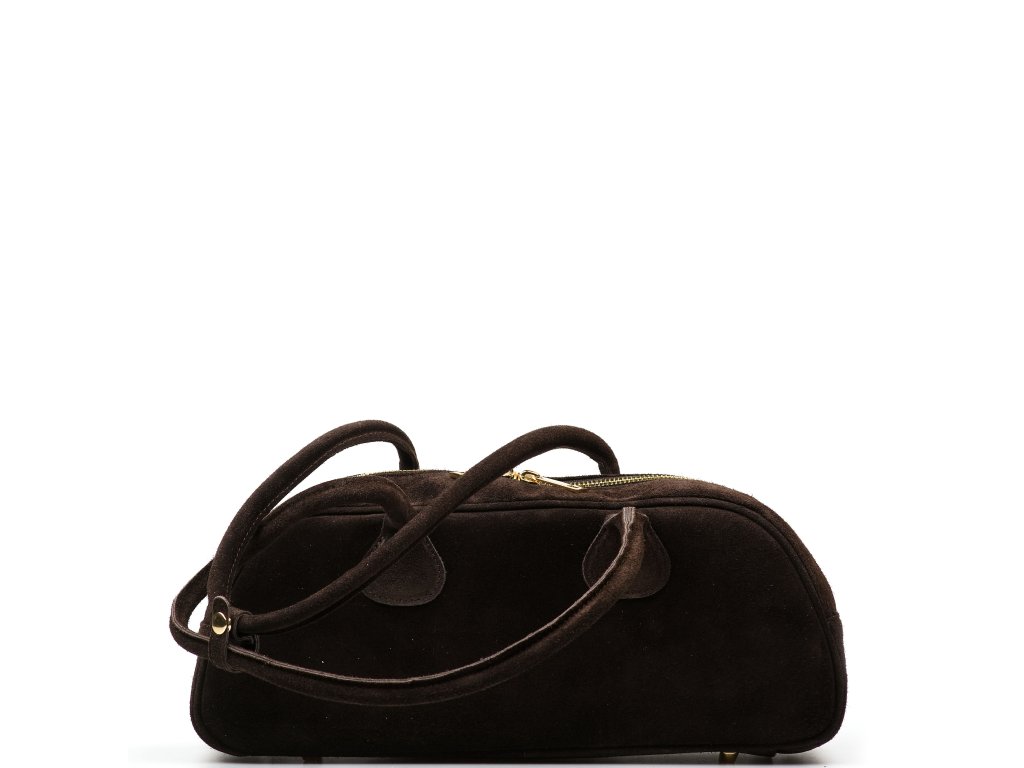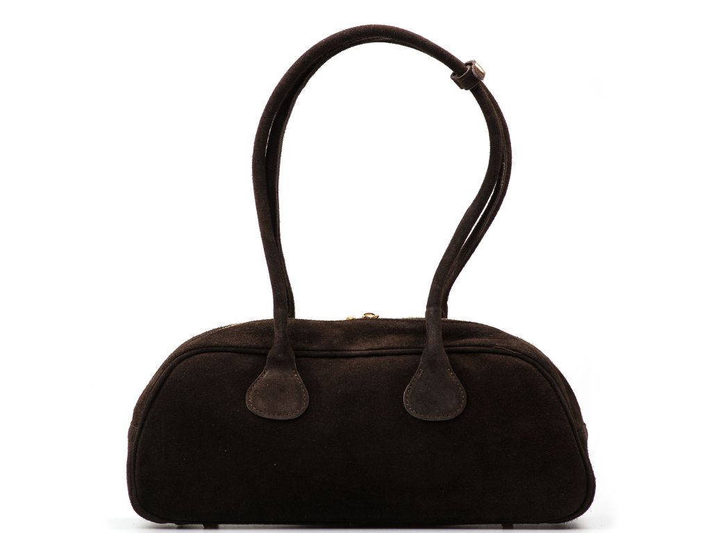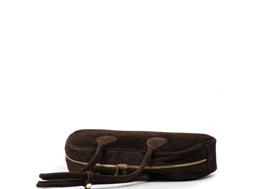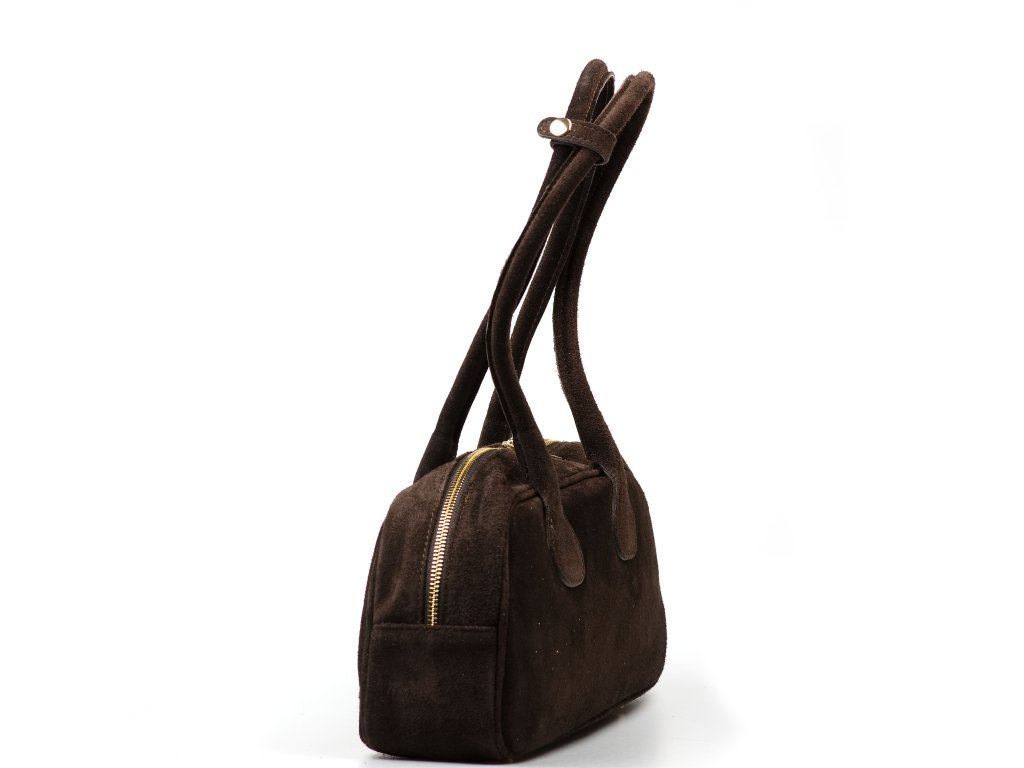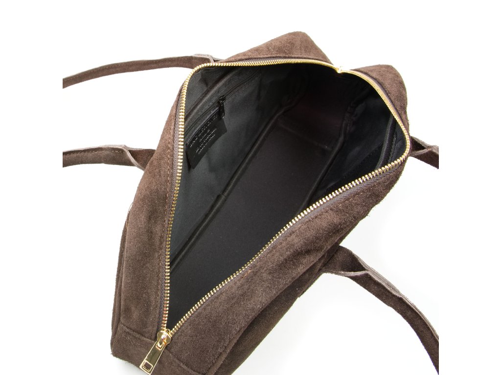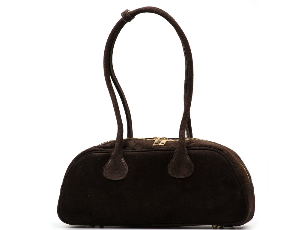 Kožená kabelka do ruky či přes rameno v hnědé barvě. Tvar je zaoblený, což i pro její velikost zaručuje dostatek prostoru. Kabelka je zdobená kovovými detaily ve zlaté barvě. Interiér disponuje jednou velkou úložnou kapsou a malou po vnitřním boku. Kabelka se uzavírá zipem.